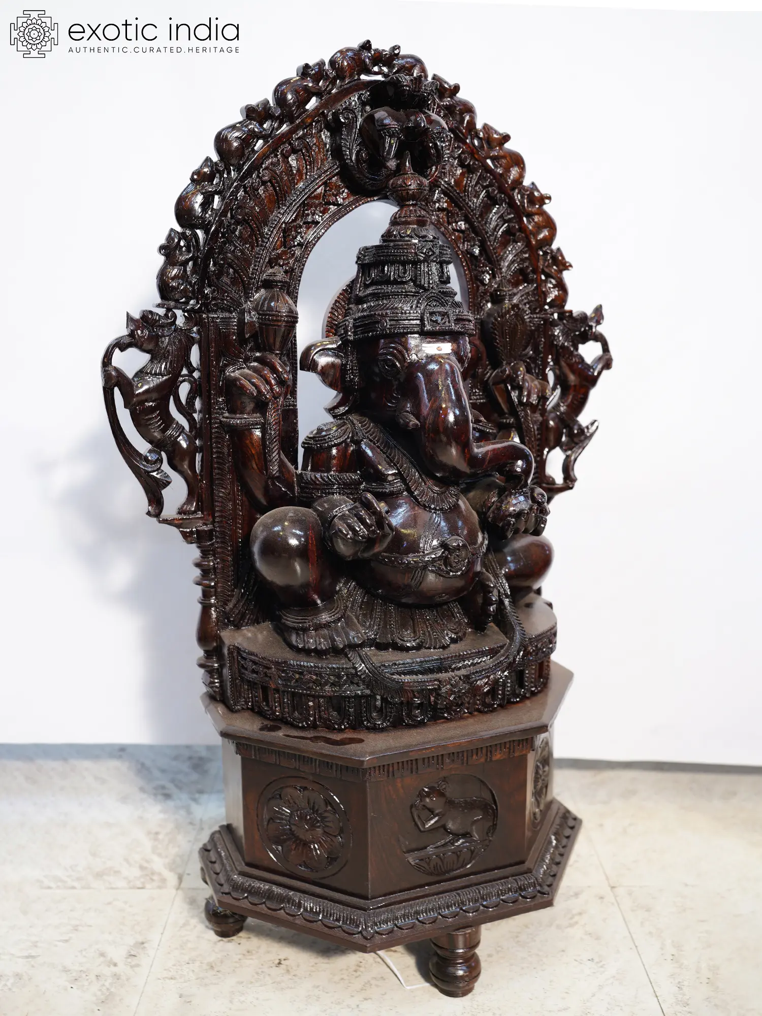 Standing at an impressive thirty-five inches, this magnificent depiction is a testament to traditional sculpting techniques. The serene posture, seated on a designer throne, exudes an aura of peace and authority, while the surrounding intricately carved archway teems with symbolic elements, including flanking guardians and a procession of auspicious mice. The reflective quality of the embedded mirror at the apex adds a layer of depth and celestial dimension to the composition, amplifying its sacred aura.