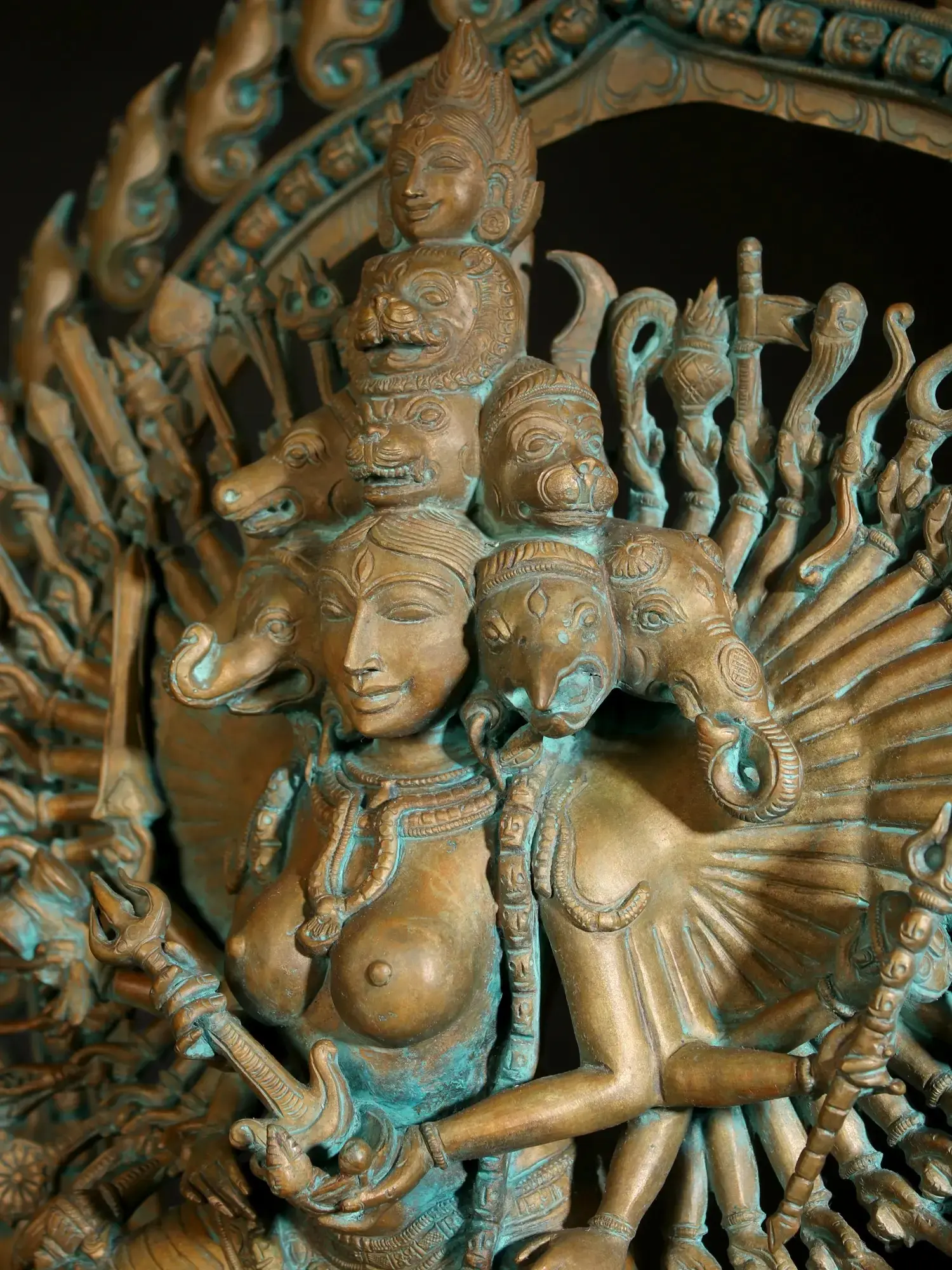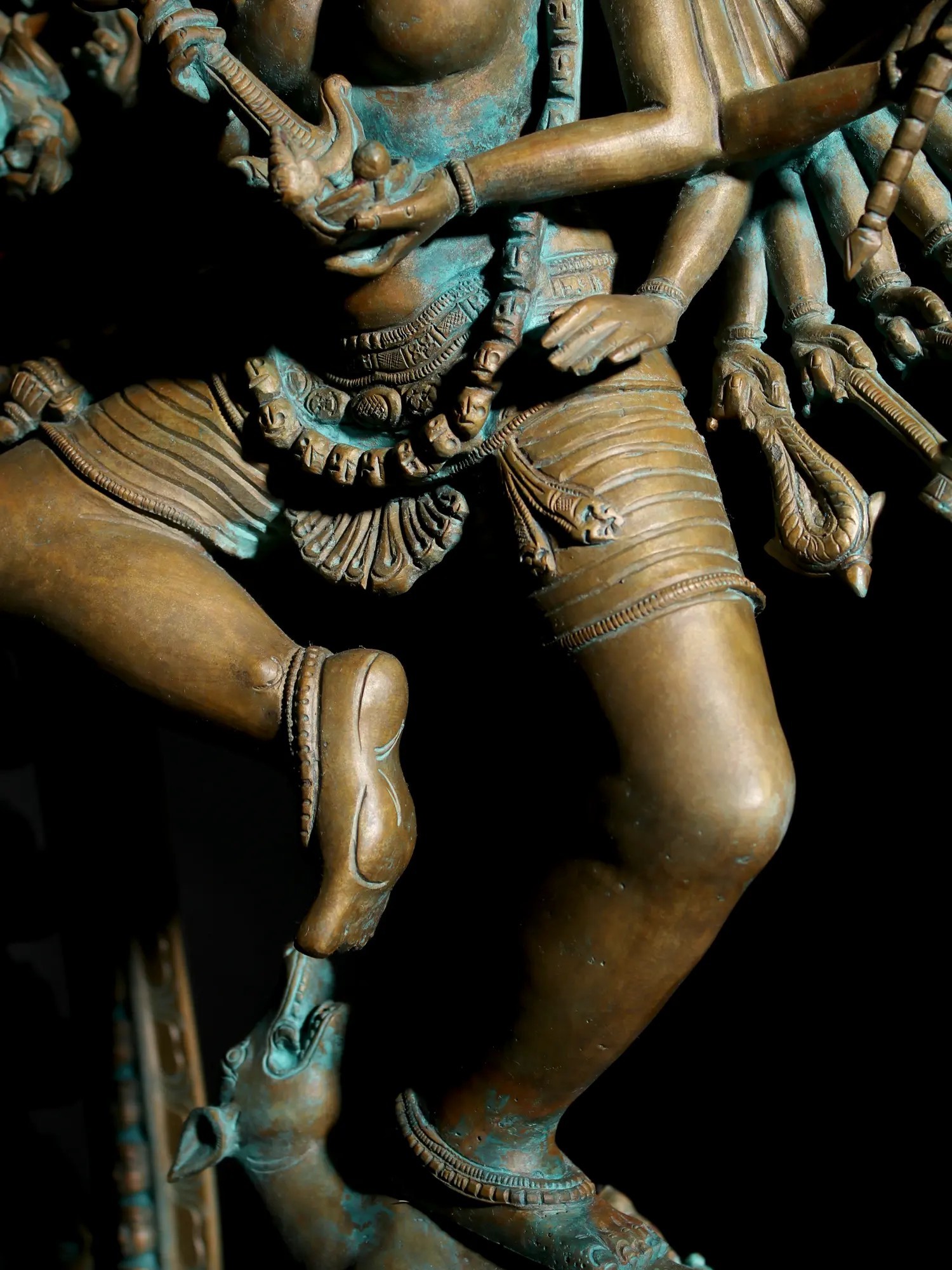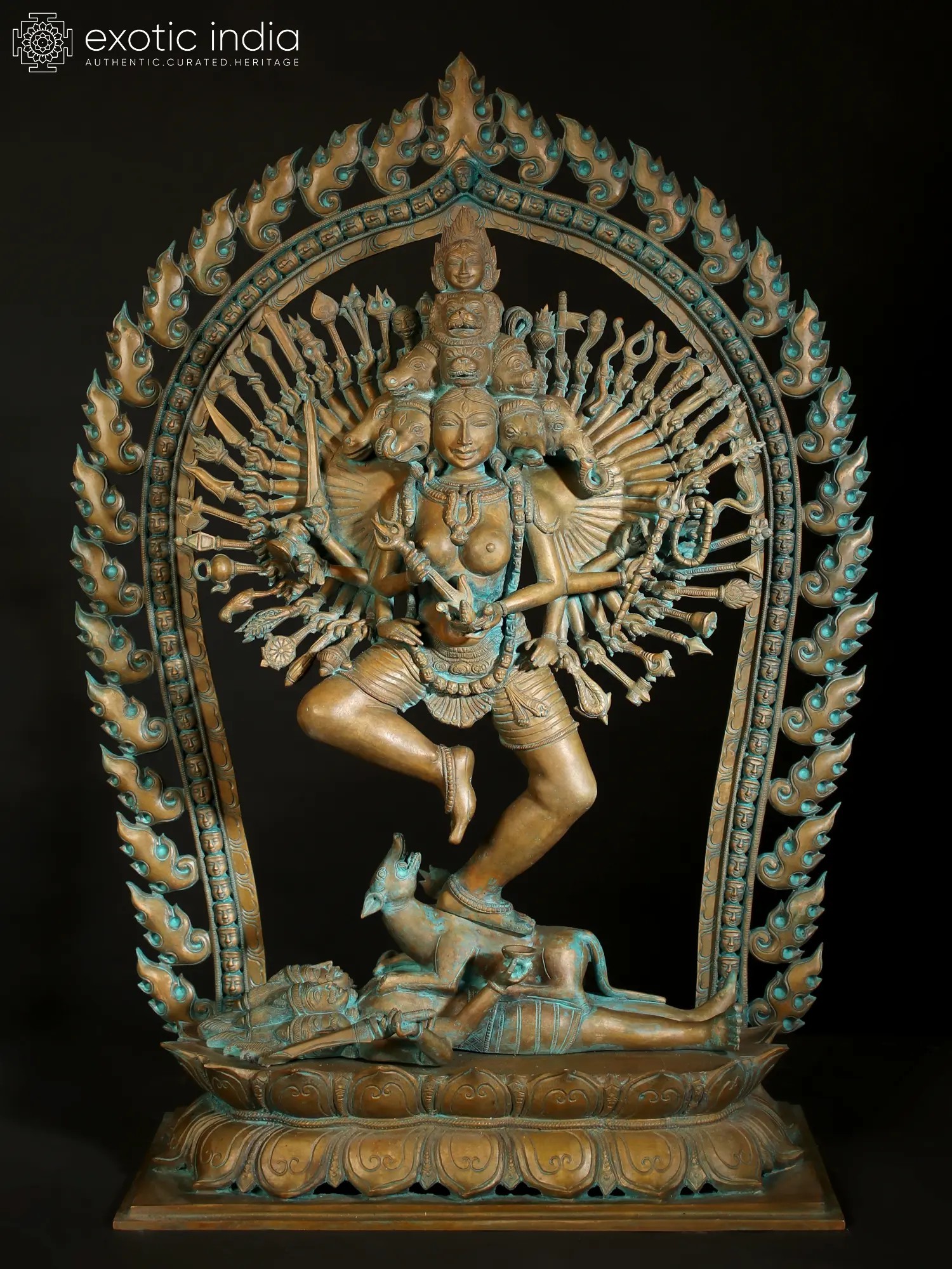 This monumental bronze sculpture stands as a testament to the artistic heritage of India. The fluid lines of Kali's dancing form convey an incredible sense of movement and energy, as if she has been captured mid-leap during her celestial performance. The serene yet powerful expression on her many faces, each integrated into the arching flames of the Prabhavali, suggests a divine consciousness that transcends earthly turmoil. The wolf at her side is often associated with primal instincts and the hunt for truth, further deepening the symbolic resonance of this divine depiction. Every element, from the stylized flames that crown the arch to the lotus base upon which she stands, is meticulously rendered, creating a harmonious and awe-inspiring composition. This Guhya Kali Tandava idol is more than an object of veneration; it is a profound work of art that invites contemplation and spiritual connection.