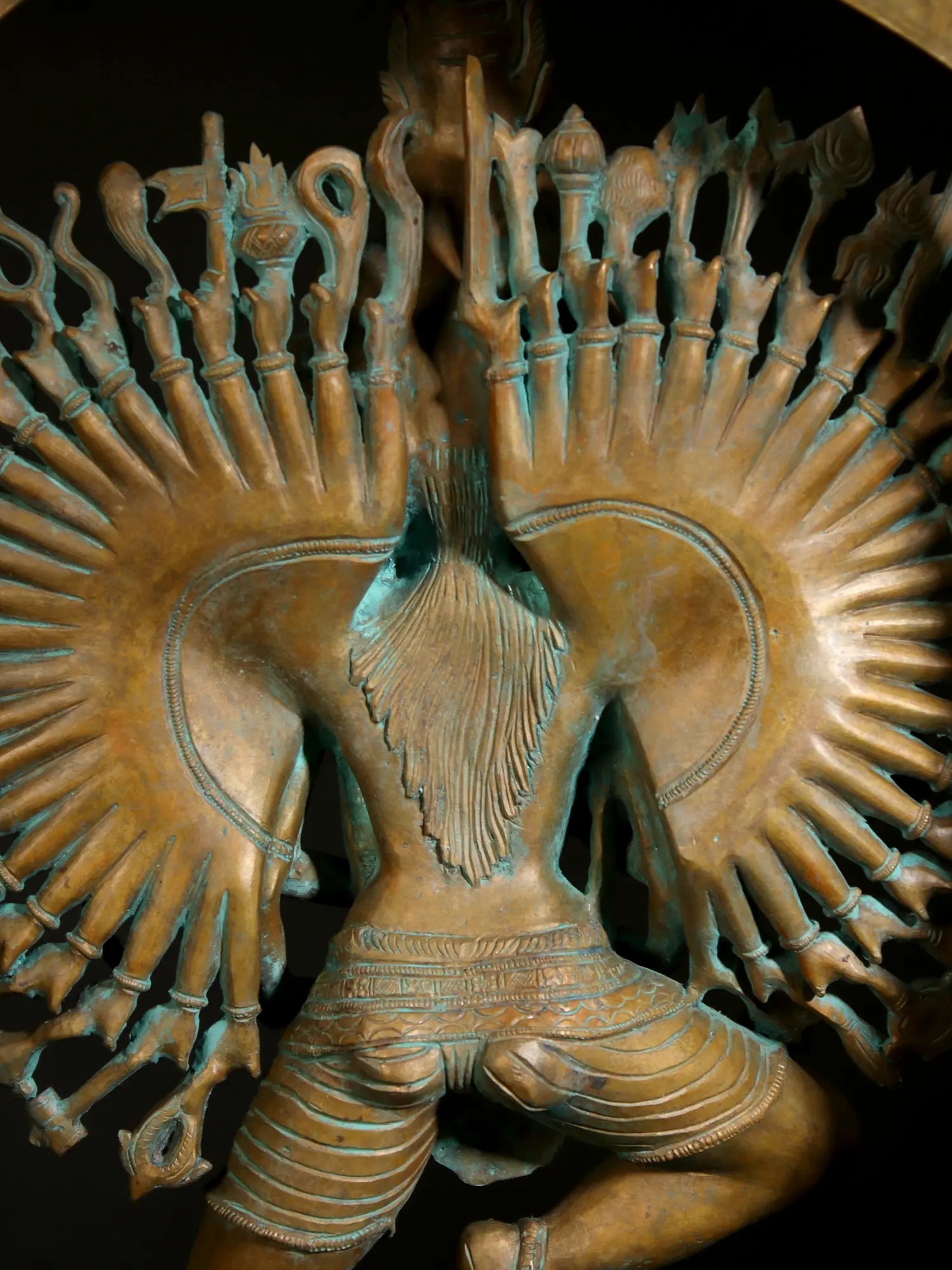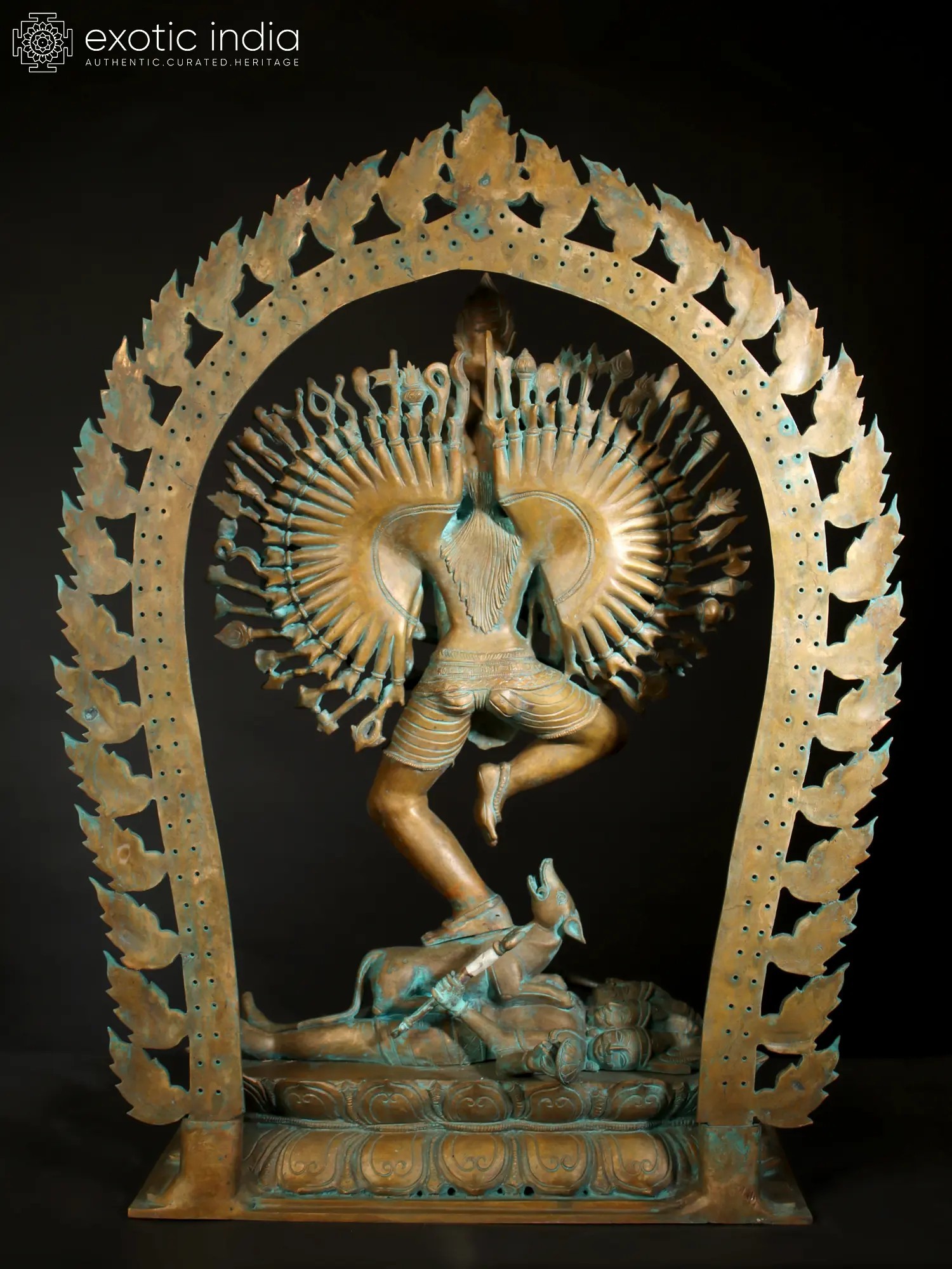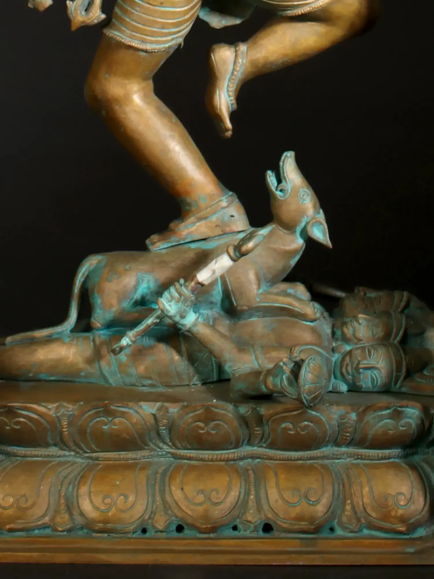 This monumental bronze sculpture stands as a testament to the artistic heritage of India. The fluid lines of Kali's dancing form convey an incredible sense of movement and energy, as if she has been captured mid-leap during her celestial performance. The serene yet powerful expression on her many faces, each integrated into the arching flames of the Prabhavali, suggests a divine consciousness that transcends earthly turmoil. The wolf at her side is often associated with primal instincts and the hunt for truth, further deepening the symbolic resonance of this divine depiction. Every element, from the stylized flames that crown the arch to the lotus base upon which she stands, is meticulously rendered, creating a harmonious and awe-inspiring composition. This Guhya Kali Tandava idol is more than an object of veneration; it is a profound work of art that invites contemplation and spiritual connection.