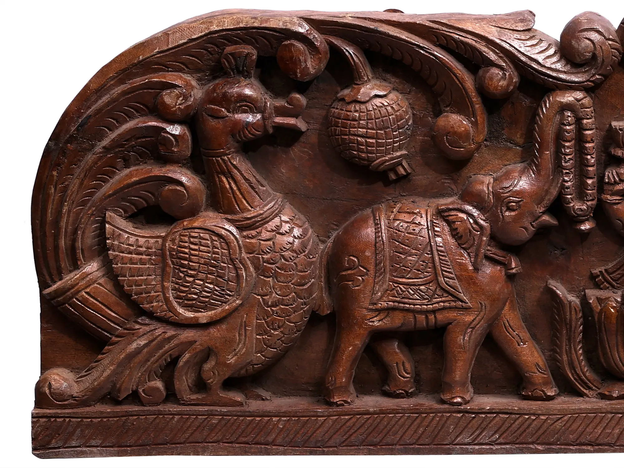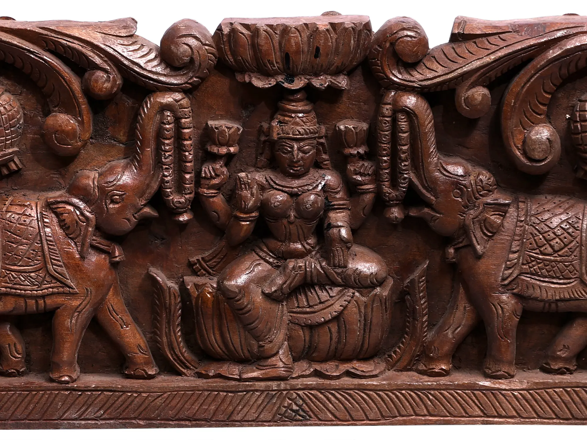 One of the most ancient and sacred aspects of the Hindu goddess of wealth, Lakshmi in Indian literature and art is Gaja-Lakshmi. Flanked by two Gaja or elephants who represent the fecund virtues of nimbus clouds, goddess Lakshmi in this form embodies the fertility and abundance of earth and pinnacle of feminine virtues. In this splendid wooden wall panel, the great goddess sits at the center on a blooming lotus, shaded by a lotus- a flower that symbolizes beauty, purity, and fertility.