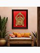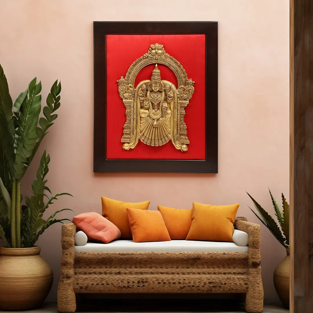 The Kirtimukha Prabhavali adds an ornate touch, symbolizing auspiciousness. The intricate craftsmanship of the brass statue and the wooden frame converge to create a harmonious visual symphony. This wall hanging not only honors cultural richness but also showcases the skilled hands of Indian artisans. With spiritual significance and meticulous detailing, it transforms any space into a sacred sanctuary, blending tradition, elegance, and divine grace.