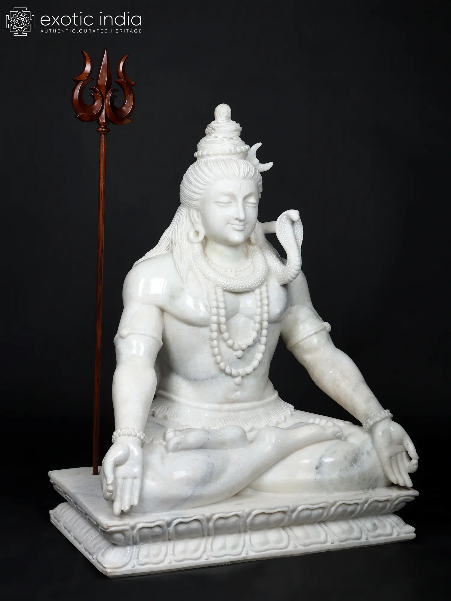 Witness the culmination of meticulous artistry and the finest natural materials. Expert hands have painstakingly carved this commanding figure from pure, luminous white marble, chosen for its inherent beauty and enduring quality. The accompanying trishul, a symbol of ultimate reality, is sculpted from rich, warm wood, providing a striking contrast that enhances the overall composition. Every curve and contour reflects a dedication to capturing the divine in its most sublime form.