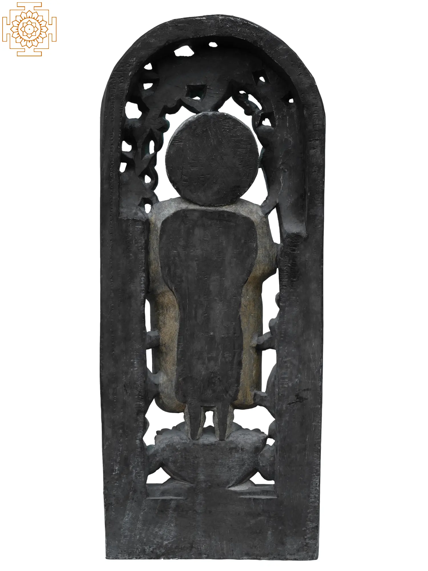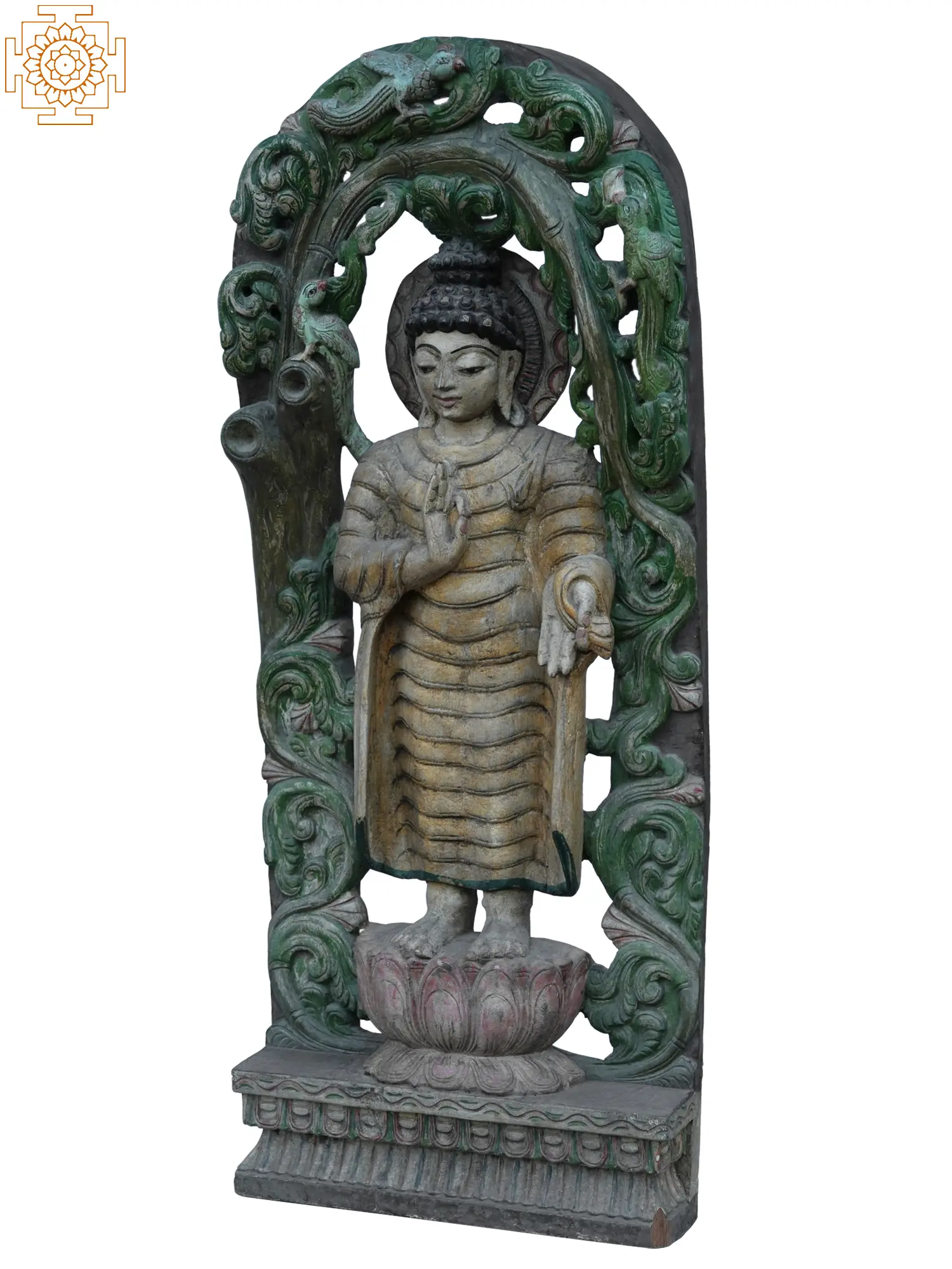 Invoking a profound sense of peace and spiritual grace, this exquisite wooden statue stands as a testament to the enduring wisdom and compassionate presence of the Buddha. Standing at an impressive three feet tall, this piece is not merely a decorative item, but a gateway to contemplation and a focal point for mindfulness in any space. The serene expression and gentle posture of the Buddha invite a moment of pause, encouraging introspection and the cultivation of inner calm. The intricate detailing of the carved wooden frame surrounding the figure draws inspiration from ancient artistic traditions. The lush, vine-like motifs and stylized mythical creatures adorning the archway evoke the sacred groves where the Buddha found enlightenment. In Buddhist lore, such natural imagery often symbolizes the interconnectedness of all life and the fertile ground upon which spiritual awakening can flourish. The gentle patina and weathered finish of the wood lend an air of timelessness, suggesting a piece that has witnessed generations of devotion and meditation.