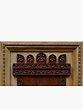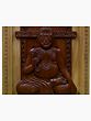 This captivating carving depicts Guru Raghavendra Swami in a contemplative seated posture, radiating an aura of peace and tranquility. The meticulous attention to detail is evident in every element, from the gentle folds of his robes to the serene expression on his face. He is adorned with traditional beads, symbolizing his spiritual journey and connection to the divine. The intricate ornamentation surrounding him, including ornate pillars and decorative motifs, adds a layer of regal beauty and reverence to the entire panel. The outer frame, crafted from a lighter hue of wood, provides a striking contrast, further enhancing the depth and richness of the central carving. This interplay of textures and tones showcases the skill of the artisan, who has breathed life into the solid wood.