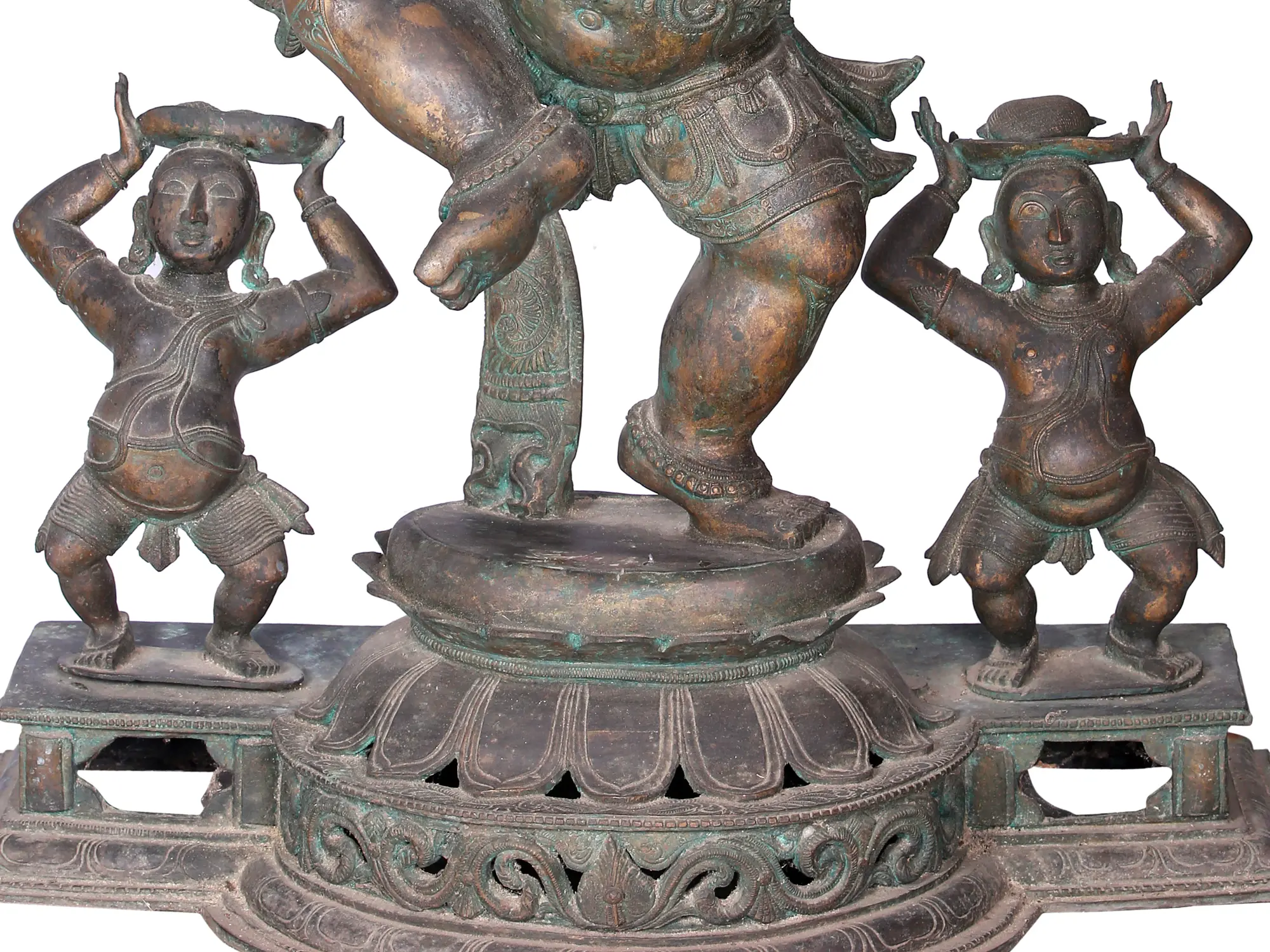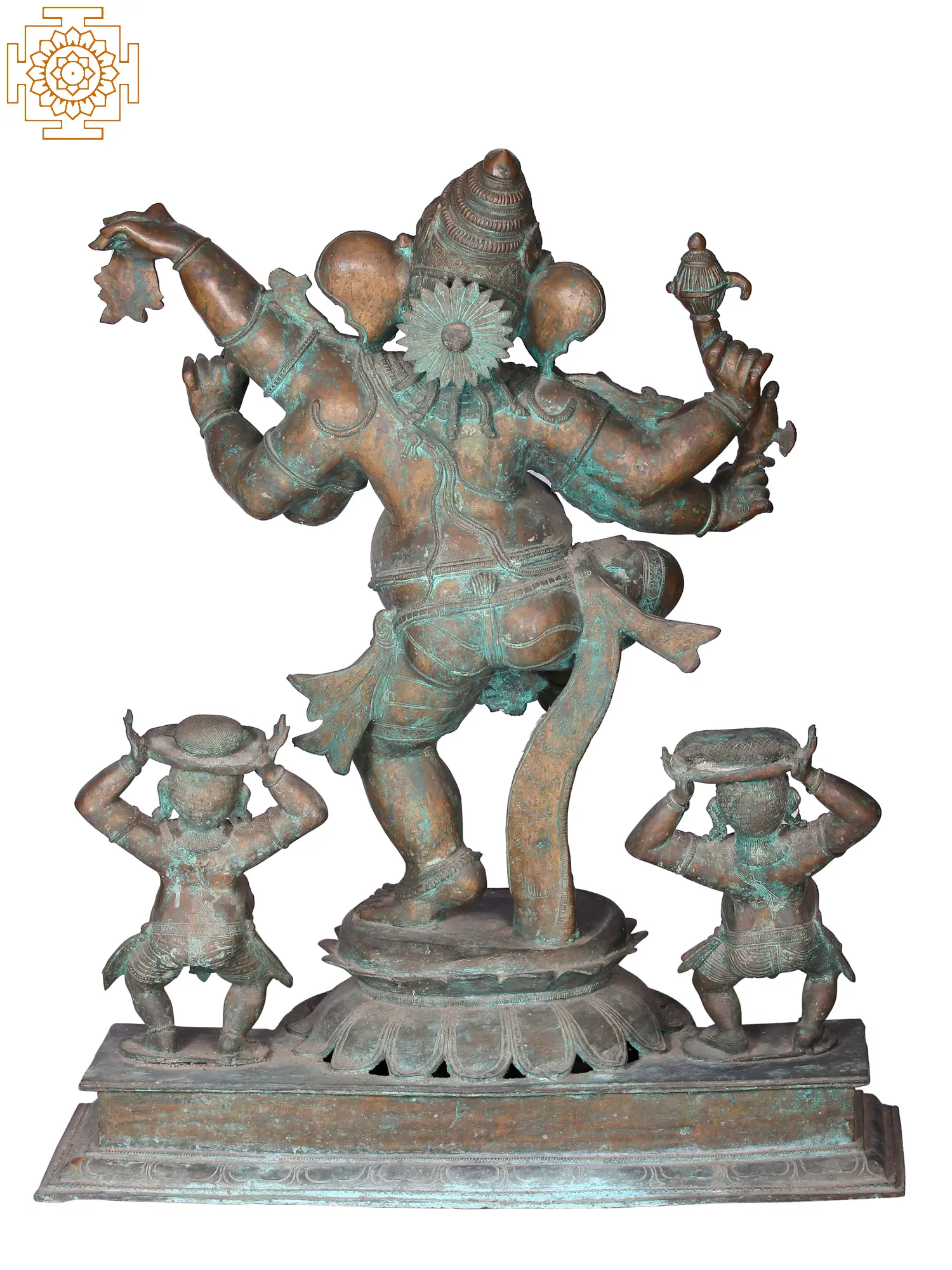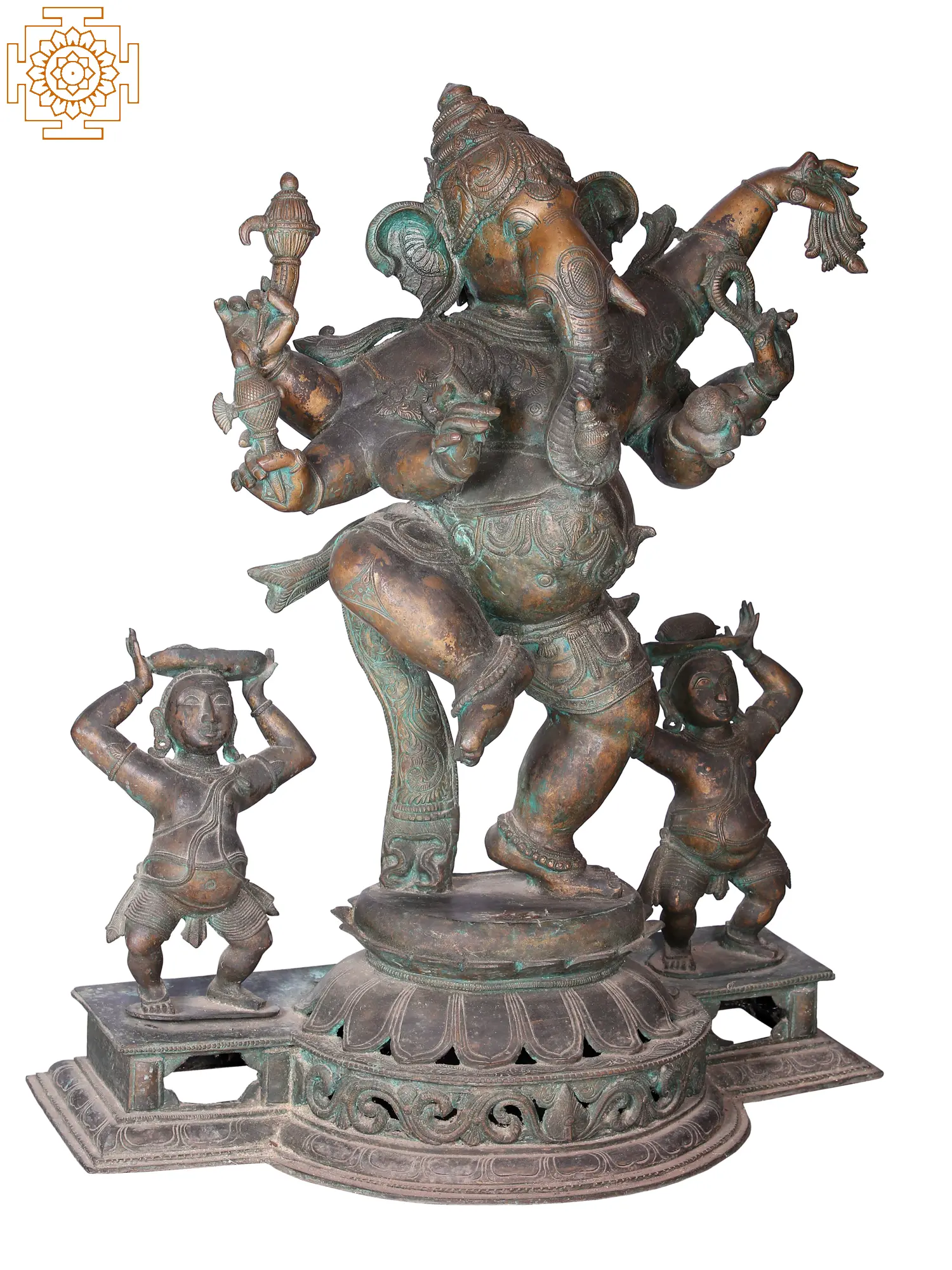 Performing the dance of spiritual bliss, Ganesha’s dancing form has many representations across the continent of Asia, Nritya Ganapati as it is called is said to have been inspired by a lore where Ganesha dances for the amusement of his parents Lord-Shiva and Devi Paravati. This is a Shashtabhuja form of Ganesha, dancing in Urdhajanu karana where one of his legs is raised in measured grace. The Ganas, whom he leads - stand next to him on both sides carrying the vessels of offerings on their heads. Solidifying joy in Panchaloha bronze, this idol draws inspiration from the sculptures of central and southern India.