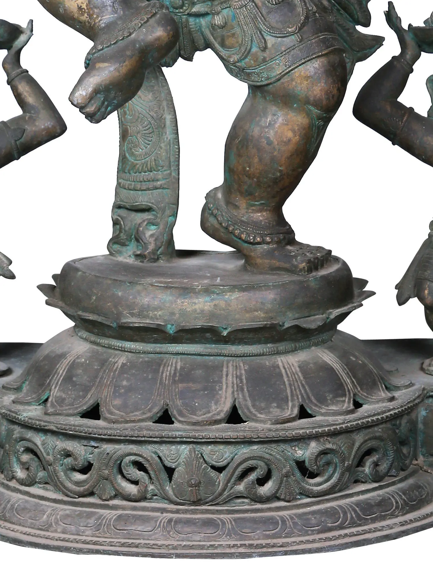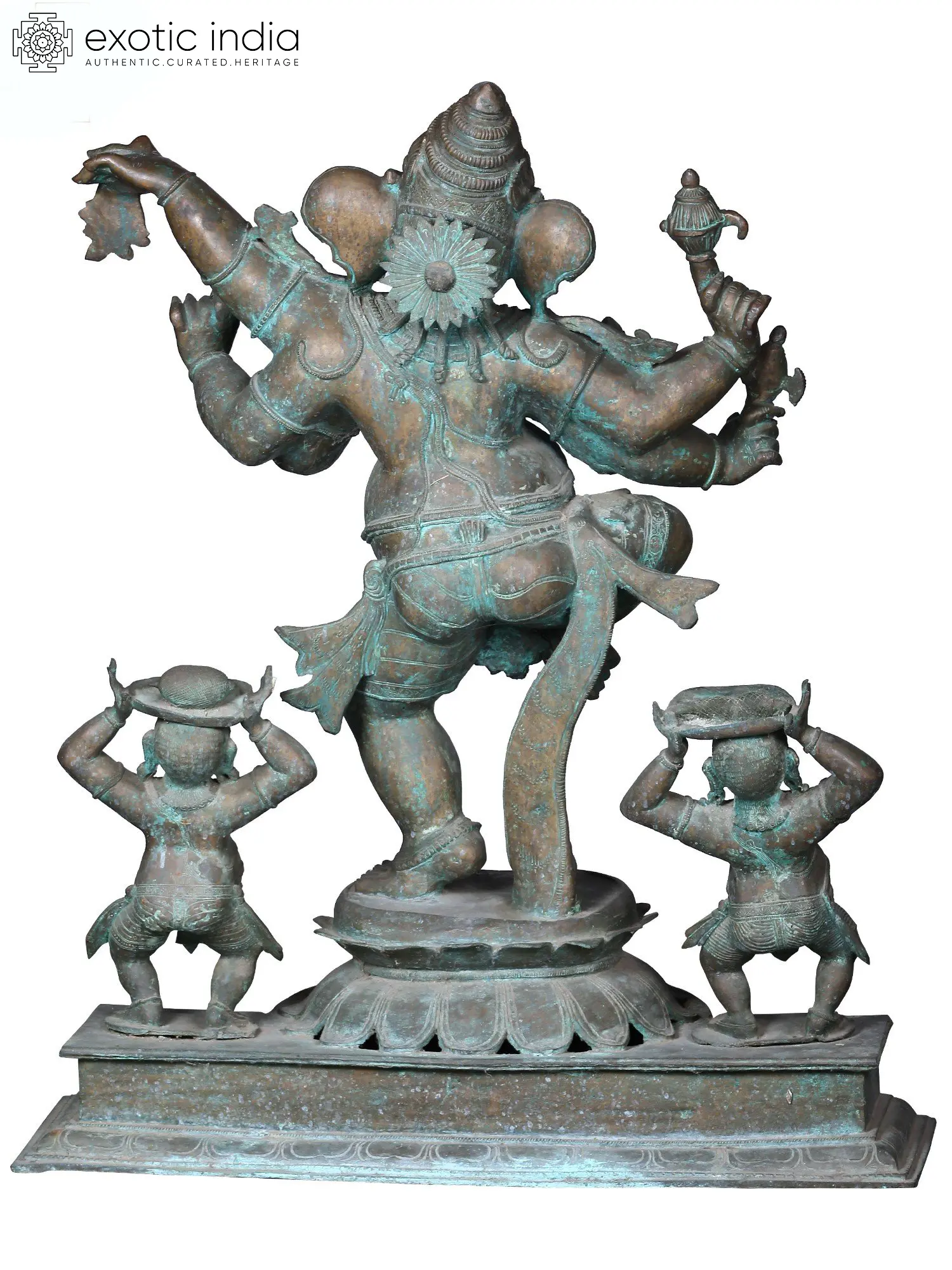 Here we see Ganesha placed on a bronze platform, whose make suggests that it is used in carrying the icon in festive processions. With his right leg raised in the Kunchita pose, a regally ornamented Ganesha commands devotion. The Shadabhuja or six-armed roopa of Ganesha is comparatively rare, which comes accompanied by two Gana, who rejoice while witnessing the Lila of their Lord Ganapati.