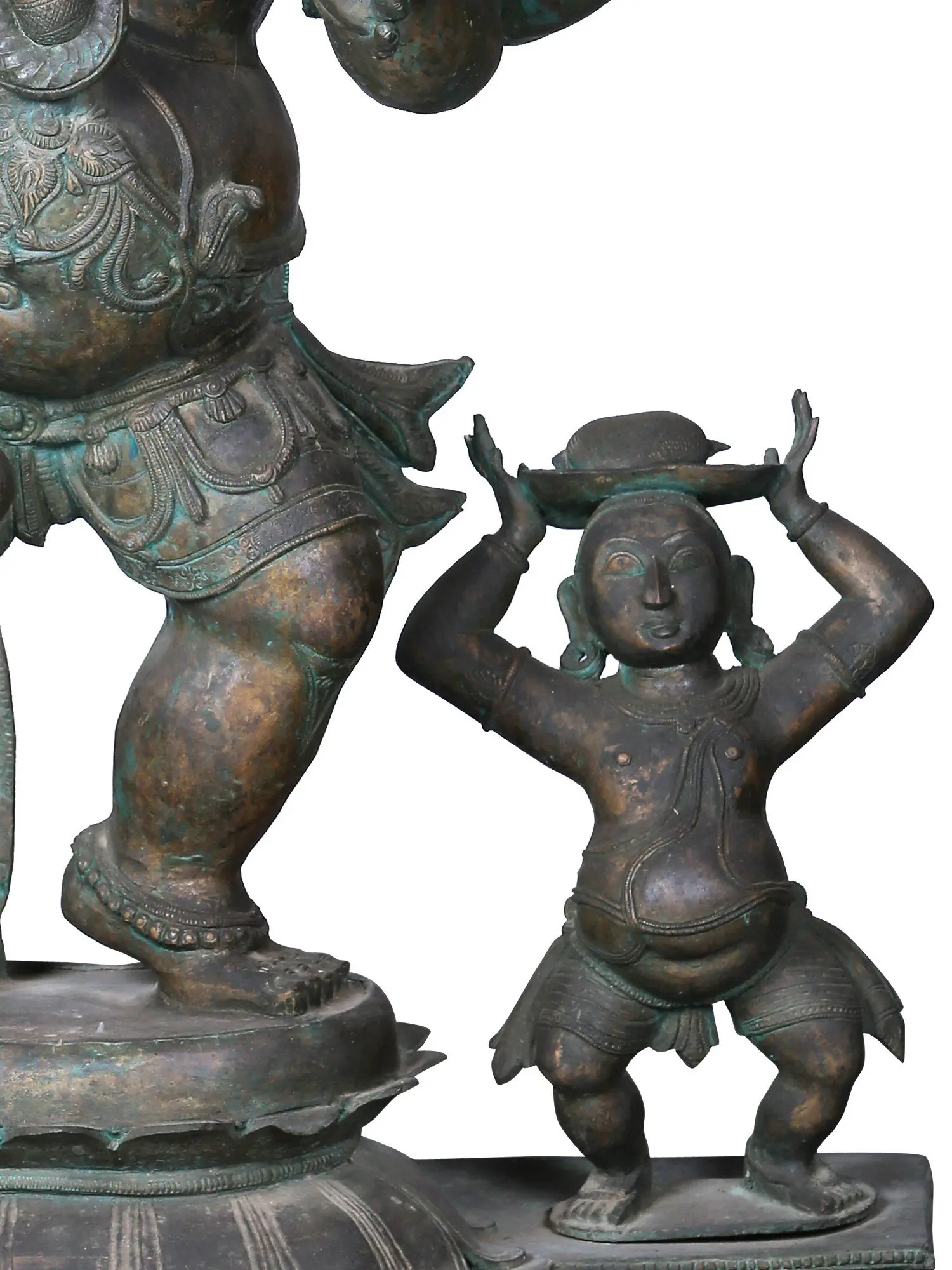 According to the legends around Nritya Ganapati, some mention that mirroring the Laasya of Parvati, a dance of auspiciousness and creation, Ganesha dances majestically, thus carrying the beauty, animation, and propitiousness of Uma in this roopa. The Panchaloha tradition captures the dynamism and exquisiteness of dancing Ganesha, in bronze statues such as this one, where the serenity and animation of the plump dancing Ganapati are balanced iconographically.