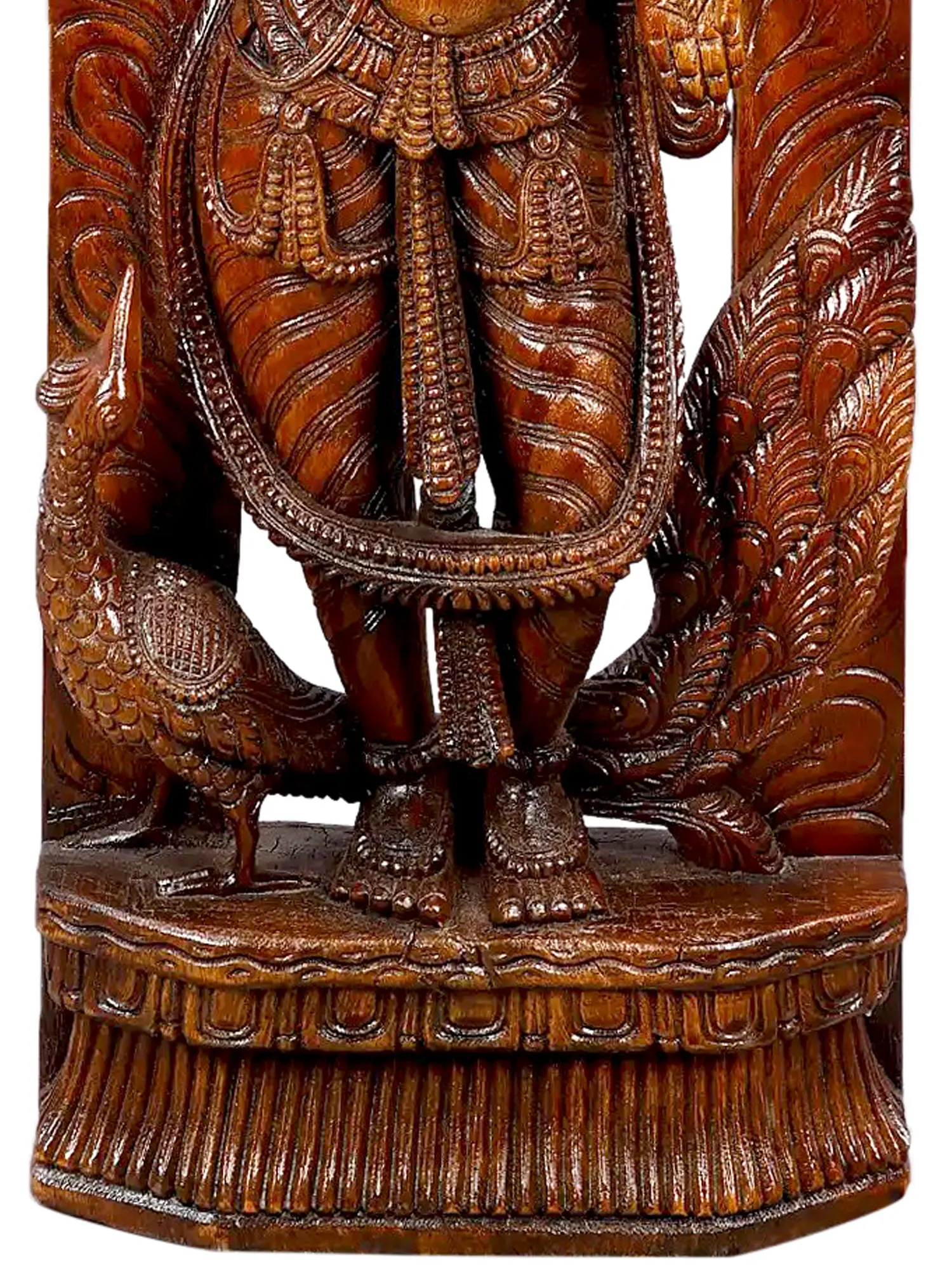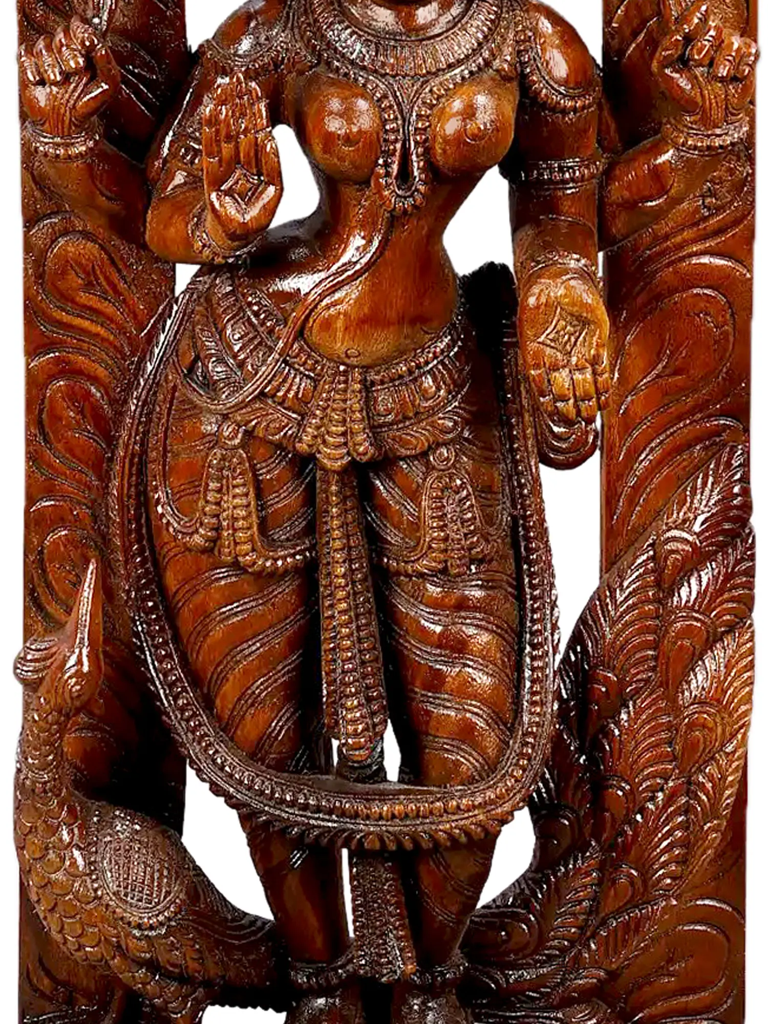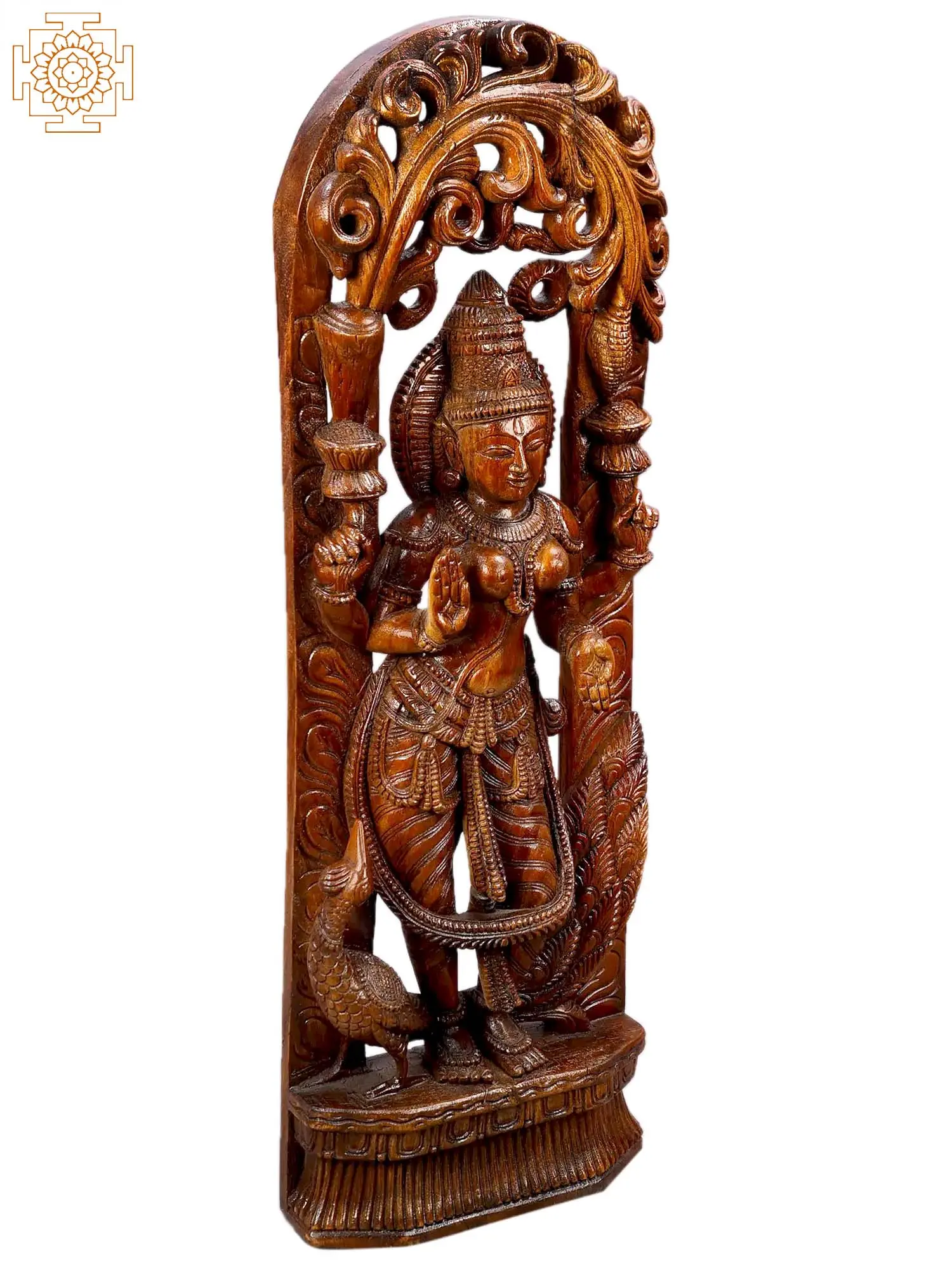 The goddess is depicted in a posture of blessing, her raised hand bestowing good fortune and her other hand perhaps cradling a lotus, a symbol of purity and spiritual awakening. Her serene countenance radiates tranquility and abundance, inviting peace and prosperity into your home. The elaborate headdress and ornate jewelry adorning her signify her royal status and divine magnificence. The flowing garments are rendered with remarkable detail, suggesting movement and elegance. The presence of a peacock, often considered her vahana or mount, nestled near her feet further enhances the auspiciousness of the carving. In Hindu mythology, the peacock is associated with royalty, immortality, and the ability to ward off evil spirits, adding another layer of symbolic meaning to this divine portrayal.