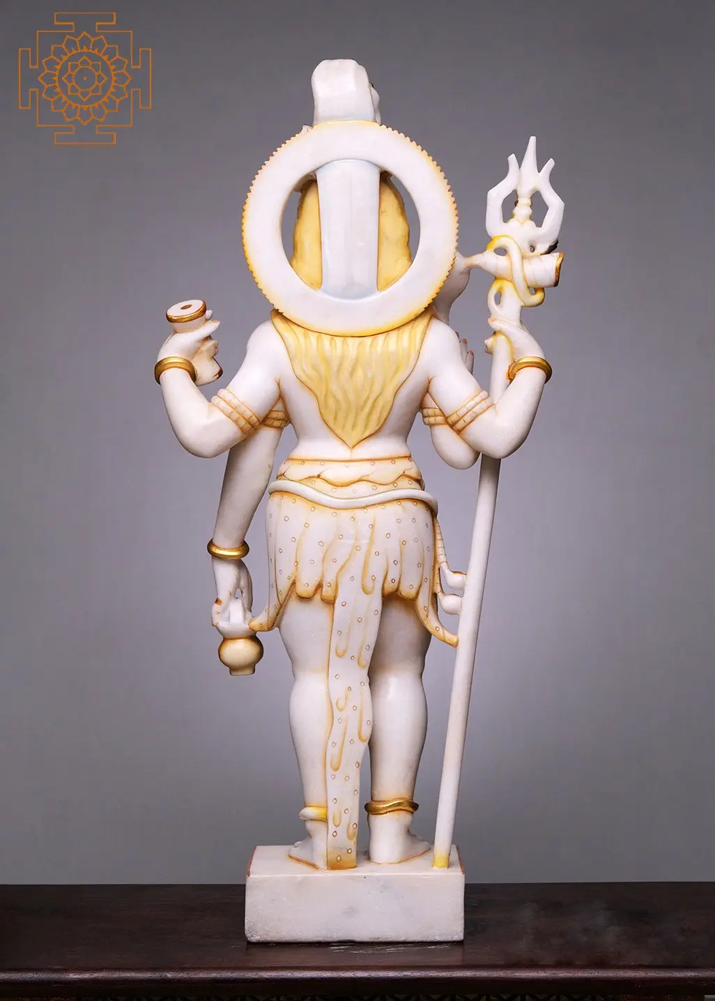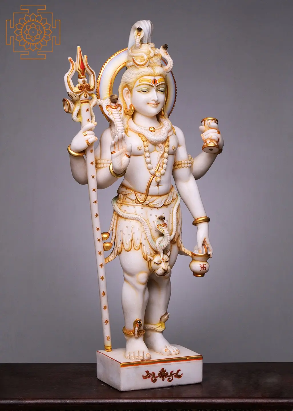 This magnificent white marble statue captures the essence of Lord Shiva, the Mahadeva, the supreme being and the Lord of Devas. Standing at an imposing 36 inches, this handmade masterpiece is a testament to exquisite craftsmanship and spiritual devotion. Carved from the finest white marble, the deity is depicted with four arms, each holding significant symbolism, and adorned with intricate details that bring the divine form to life.