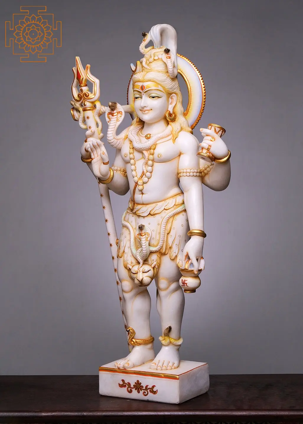 This imposing statue is more than just a work of art; it is a spiritual focal point, designed to inspire peace, contemplation, and devotion. Its substantial size makes it ideal as a statement piece for your garden, home, or place of worship. The pure white marble, known for its purity and radiance, enhances the divine aura of the deity. The delicate gold accents and the meticulous carving of each element, from the divine glow of his third eye to the gentle curve of his cobra ornaments, speak volumes of the artisan's dedication. Imagine this divine presence gracing your space, radiating an aura of tranquility and spiritual power, inviting blessings and inner peace into your life. It serves as a constant reminder of the cyclical nature of existence and the profound cosmic dance that governs the universe.