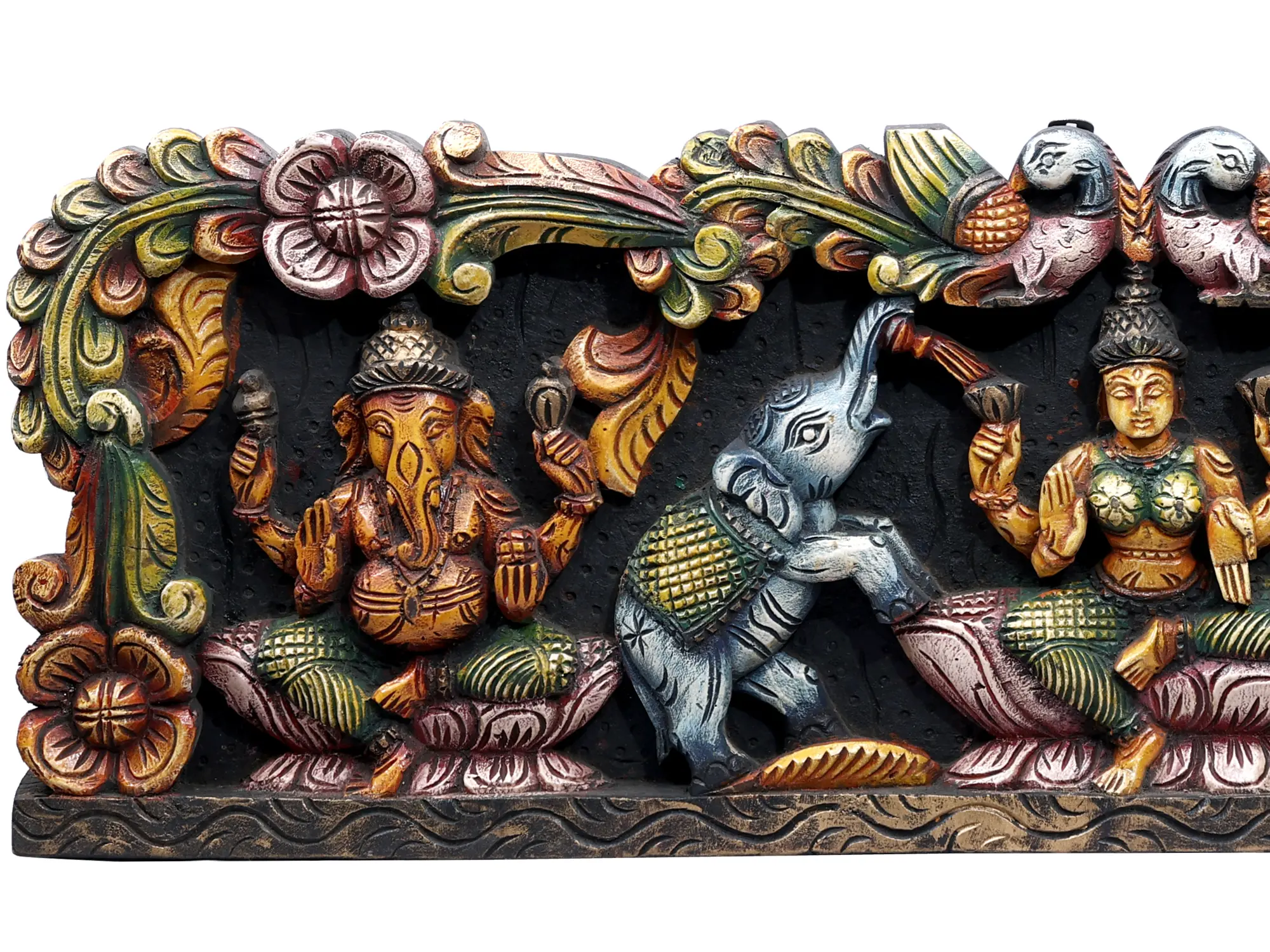 Elevate your living space with this magnificent wooden wall panel, a vibrant depiction of three revered deities, each representing a cornerstone of prosperity, wisdom, and auspicious beginnings. This meticulously carved artwork, spanning three feet in length, is a testament to traditional Indian craftsmanship, bringing a touch of divine artistry into your home. The rich, earthy tones of the wood are enhanced by a spectrum of carefully applied colors, making each figure and motif stand out with exquisite detail. The intricate floral carvings and the graceful placement of the divine figures create a harmonious and spiritually resonant composition. ––––––––––––––––––