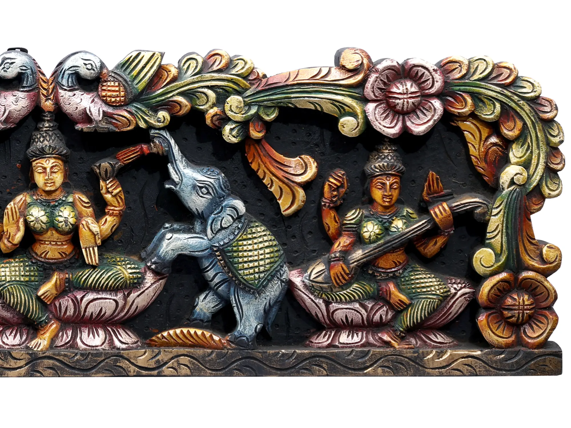36" Large Wooden Colorful Gaja Lakshmi with Ganesha and Saraswati Wall Panel