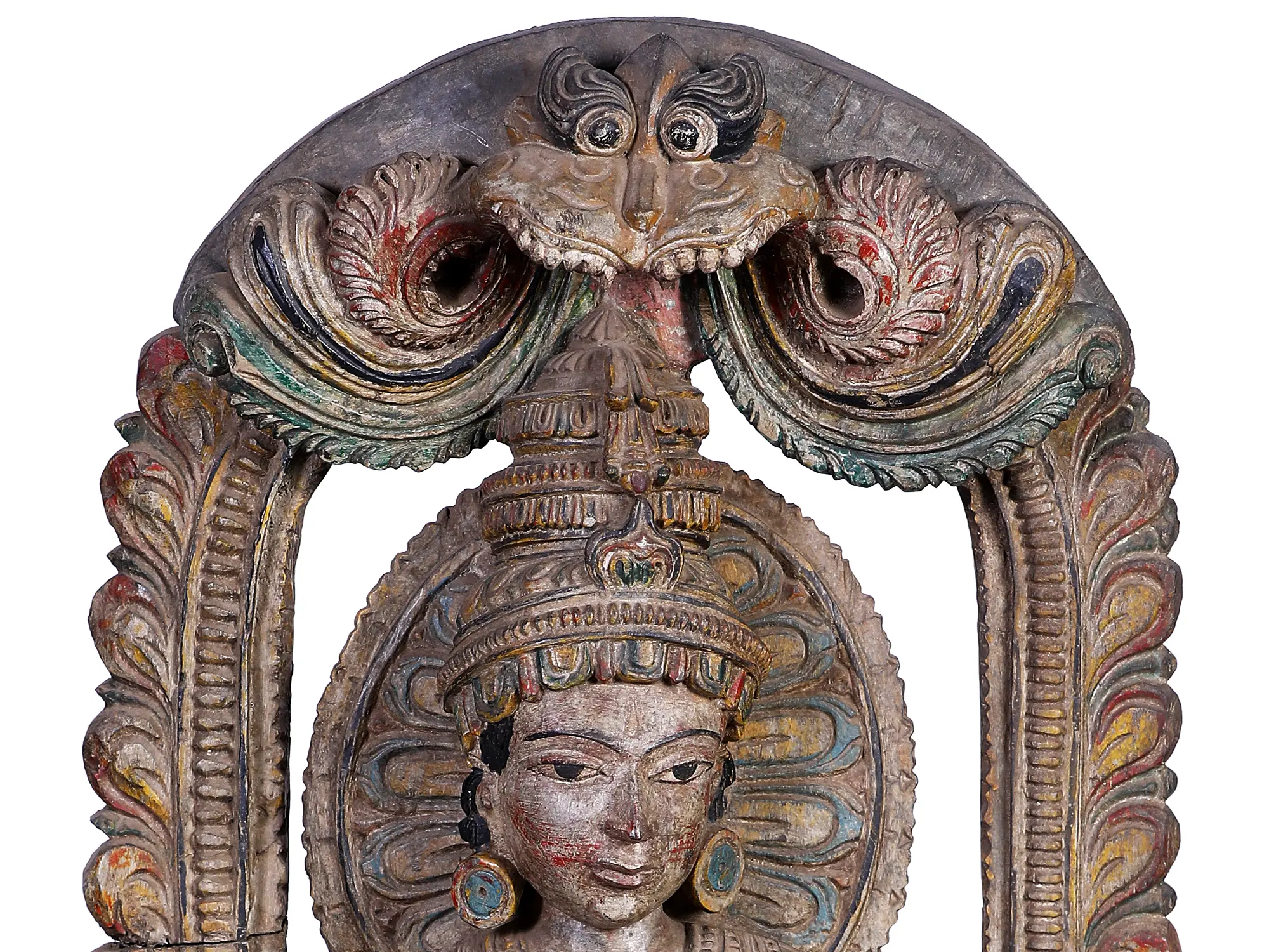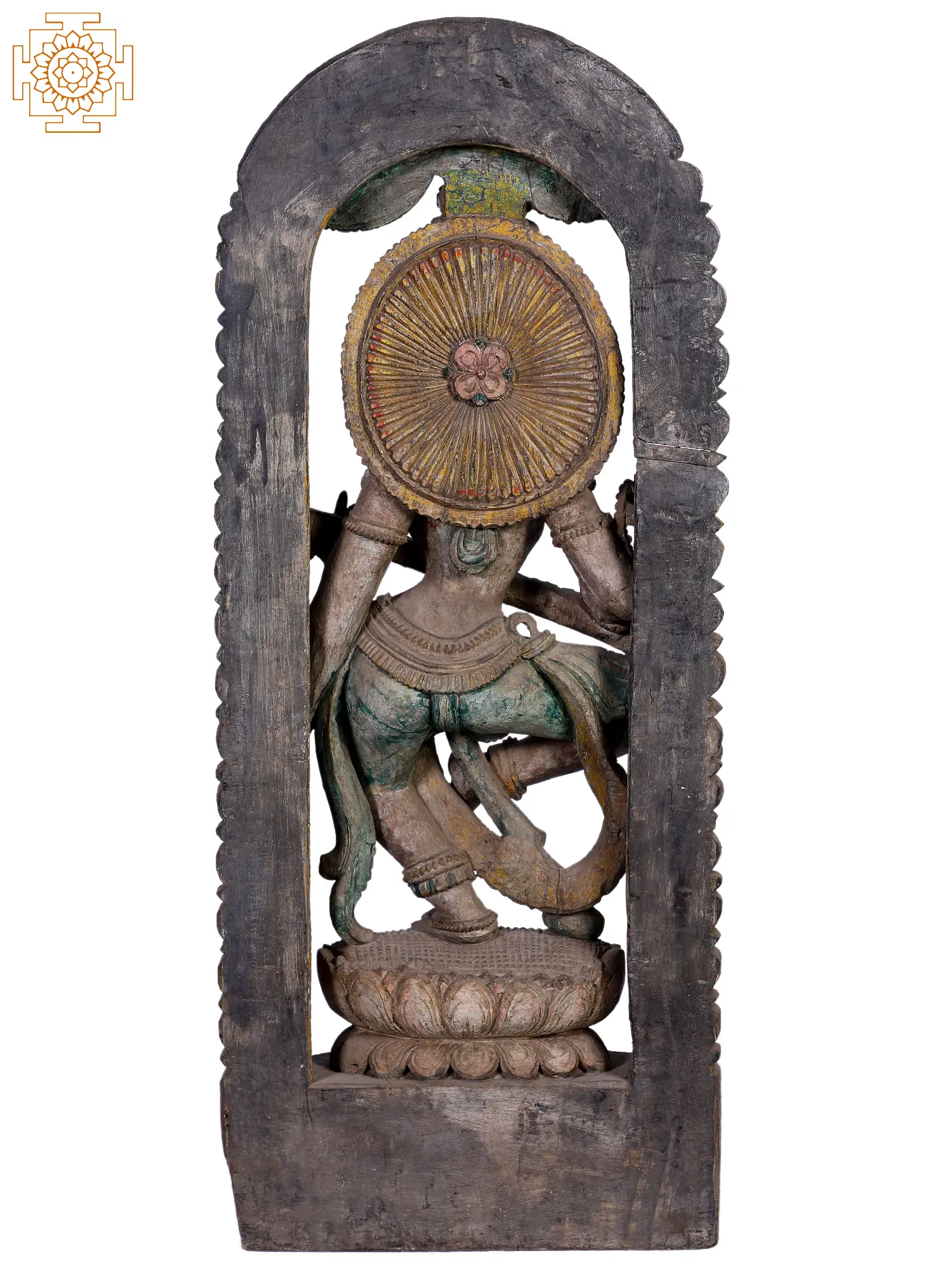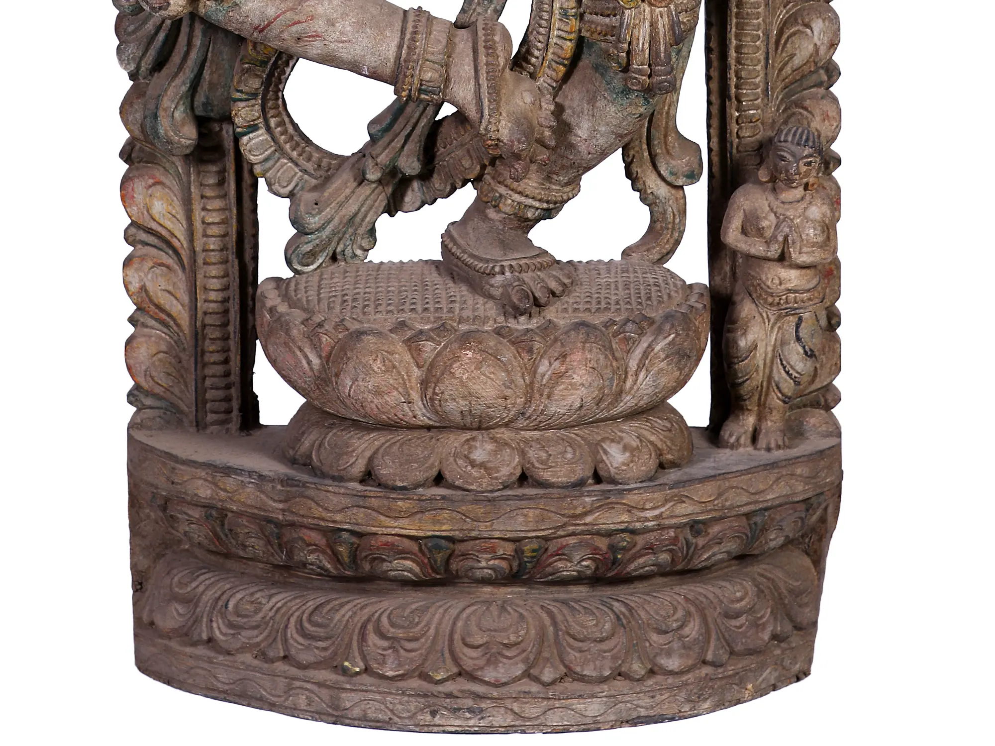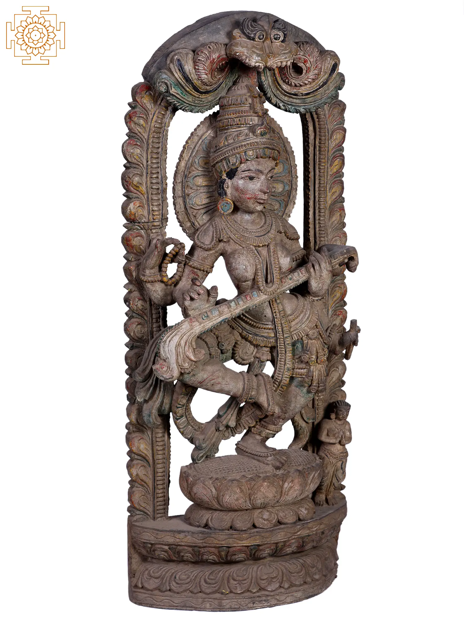 The soft-featured Sarasvati murti that you see on this page is seemingly taken off the walls of an ancient South Indian temple. The iconography as well as the architecture surrounding it, have been reproduced with great skill and patience on the part of the artisan. As a medium, wood demands double the skill and meticulousness as other, more run-of-the-mill media.