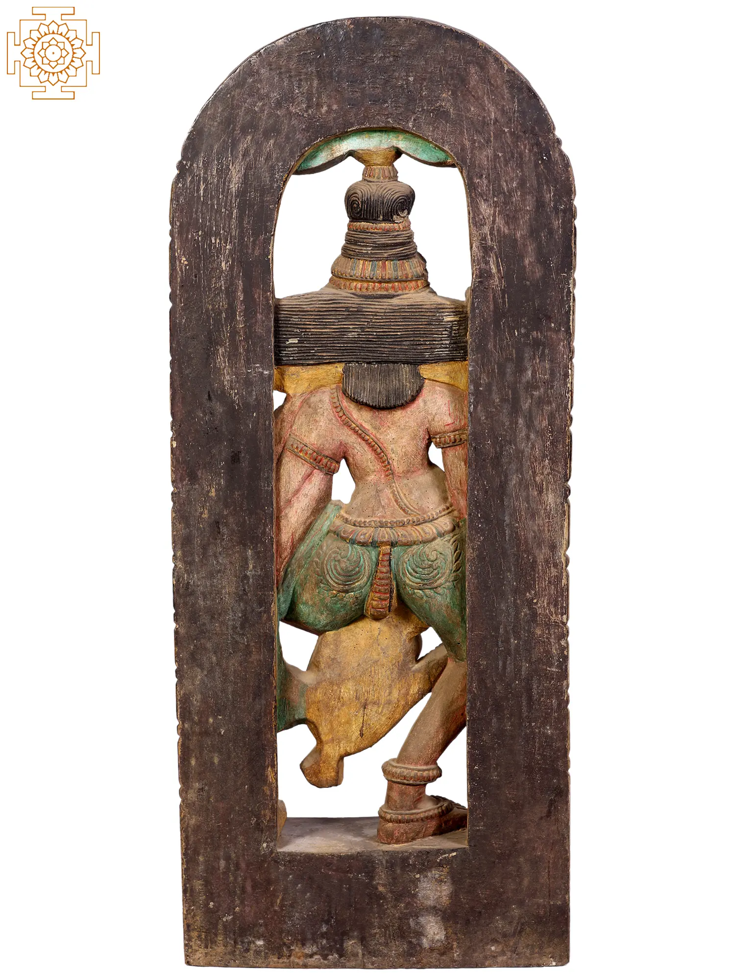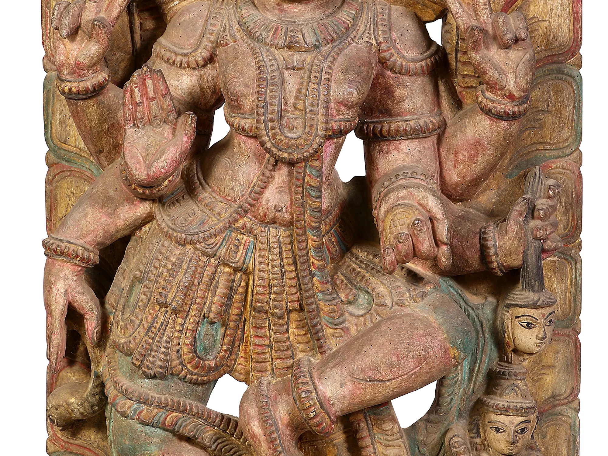 The craftsmanship evident in this piece highlights the rich tradition of wood carving in India. The artisans have brought the divine form to life through meticulous carving, imbuing it with a sense of movement and emotion. The subtle layering of paint, though aged by time, adds depth and character, accentuating the delicate features and ornate jewelry that adorn Shiva. This sculpture is more than just an object of art; it is a conduit to spiritual devotion and a testament to the enduring legacy of Indian artistic heritage. It invites viewers to connect with the profound philosophy and devotional fervor that surrounds the worship of Lord Shiva, the supreme yogi and ascetic, also known as Nataraja, the Lord of Dance.