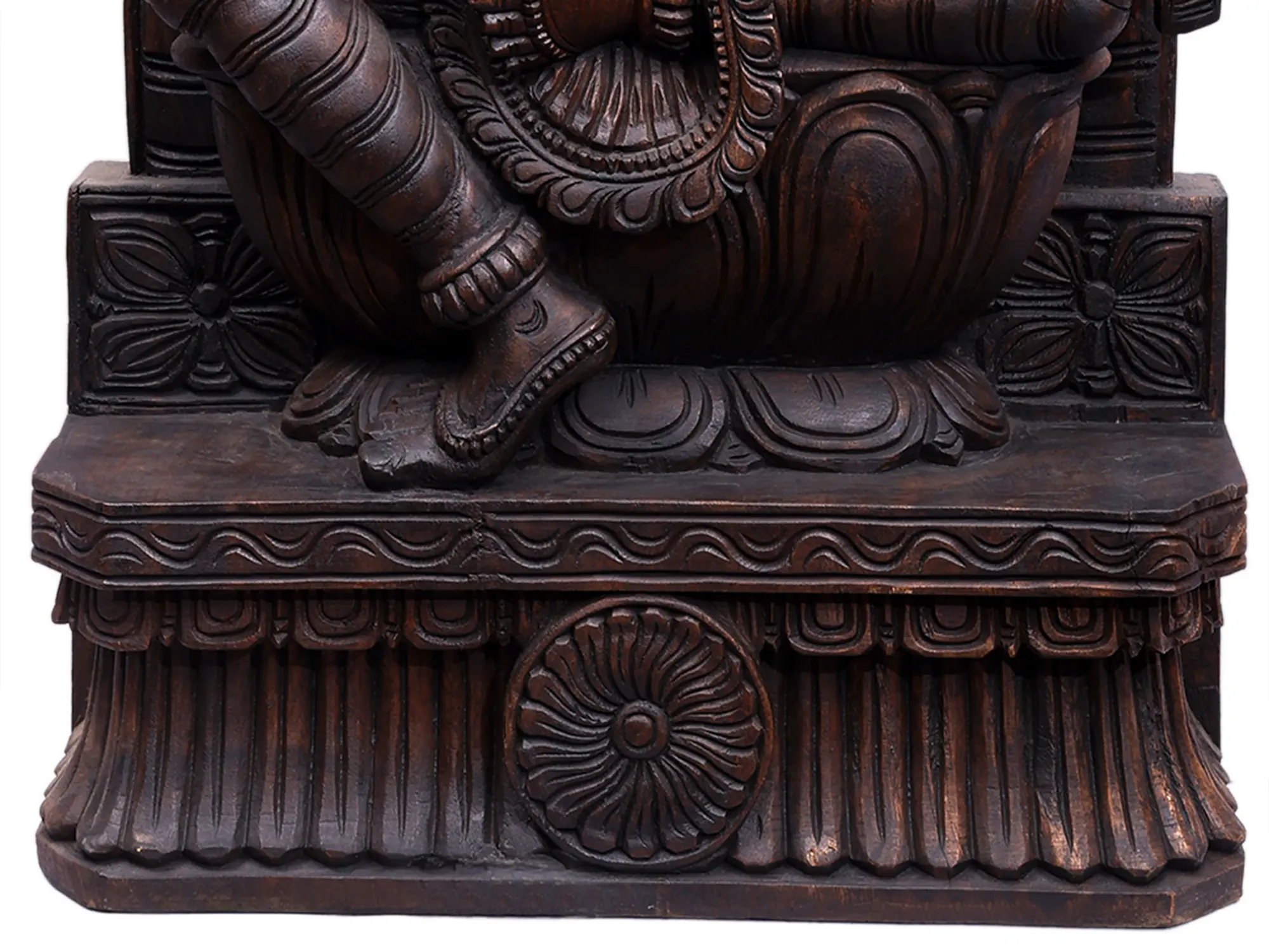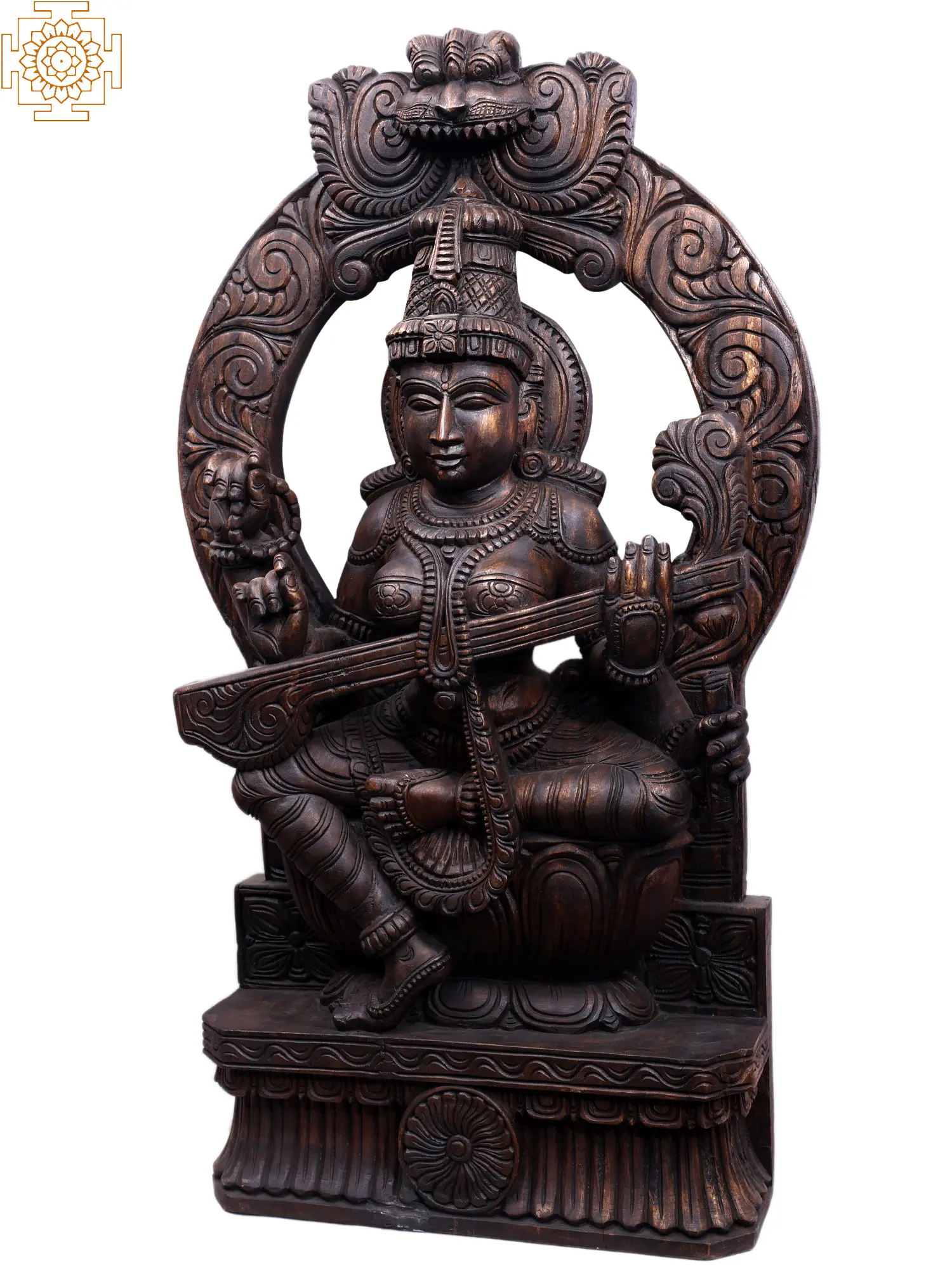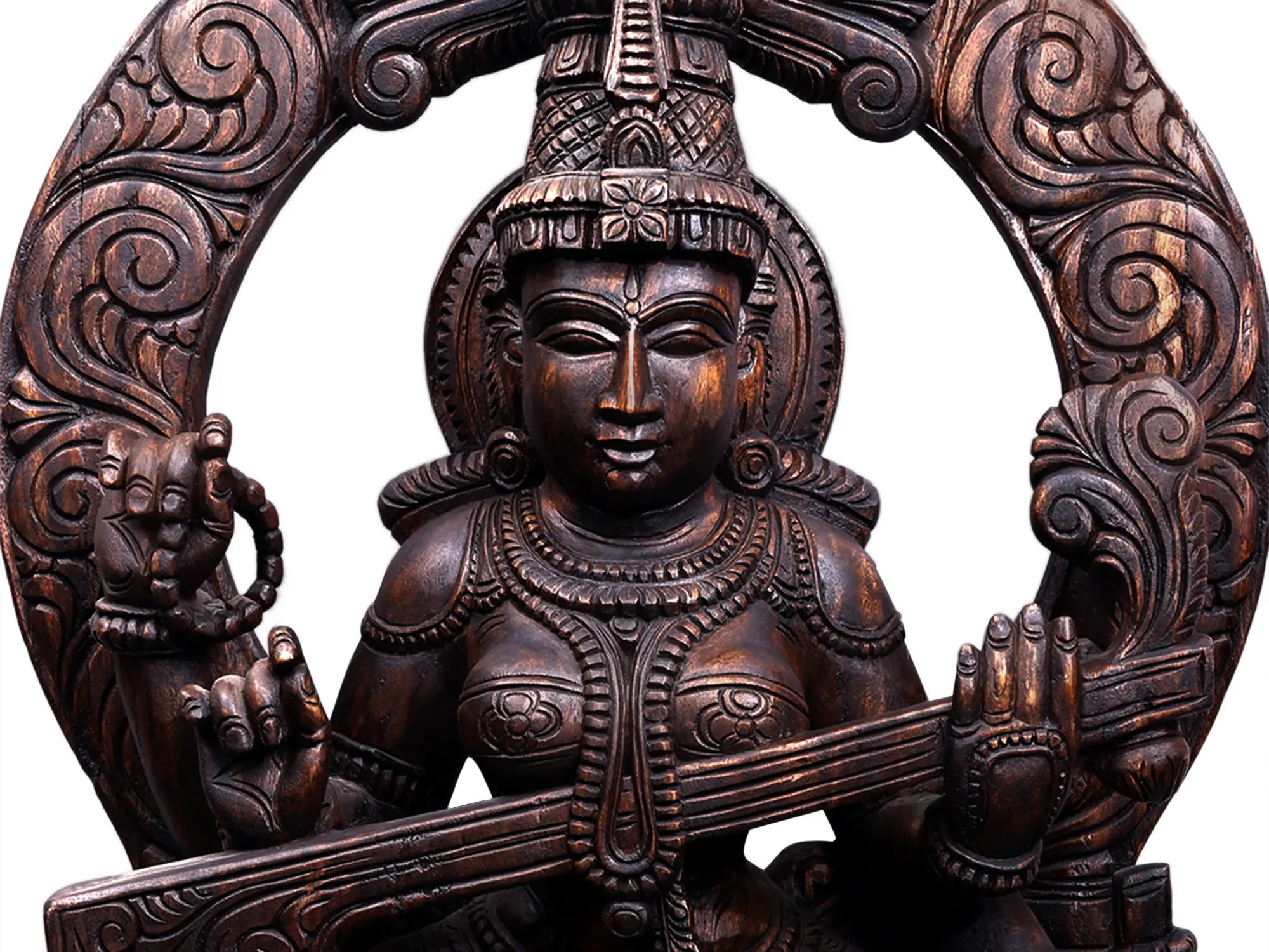 Saraswati is the creative force and muse of Brahma, the Shakti (energy) whose origin is the seed of the Universe and its beauty. This magnificent wooden statue is an ode to the powers of Saraswati, whose blessings course through the world in the works of creatives, artists, poets, and students. Her prabhavali (aura) is made of a blossoming vine that represents the origin of life, with the Kirtimukha emblem on the top.