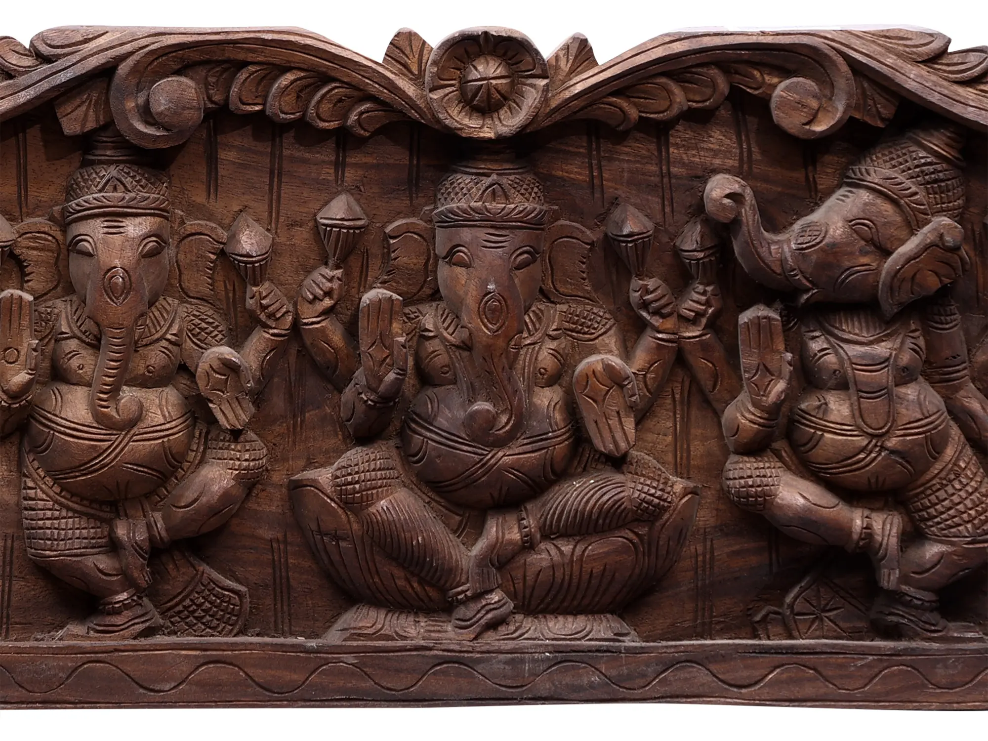 Immerse your space in the divine presence of Lord Ganesha, the remover of obstacles and the bestower of good fortune, with this exquisite wooden wall panel. Measuring an impressive 36 inches in length, this handcrafted masterpiece showcases a captivating array of Ganesha's forms, each rendered with meticulous detail and profound spiritual significance. The rich, dark wood evokes a sense of timeless tradition and earthy elegance, making it a striking focal point for any room. This panel is more than just a decorative item; it is a vibrant representation of the beloved Hindu deity. Lord Ganesha, easily recognizable by his elephantine visage, is revered as the god of beginnings, wisdom, intellect, and auspiciousness. Tales abound of his cleverness and his role in overcoming challenges, making him a patron of arts, sciences, and intellect. The presence of multiple Ganesha figures on this panel amplifies his benevolent energy, creating a powerful aura of blessings and protection.