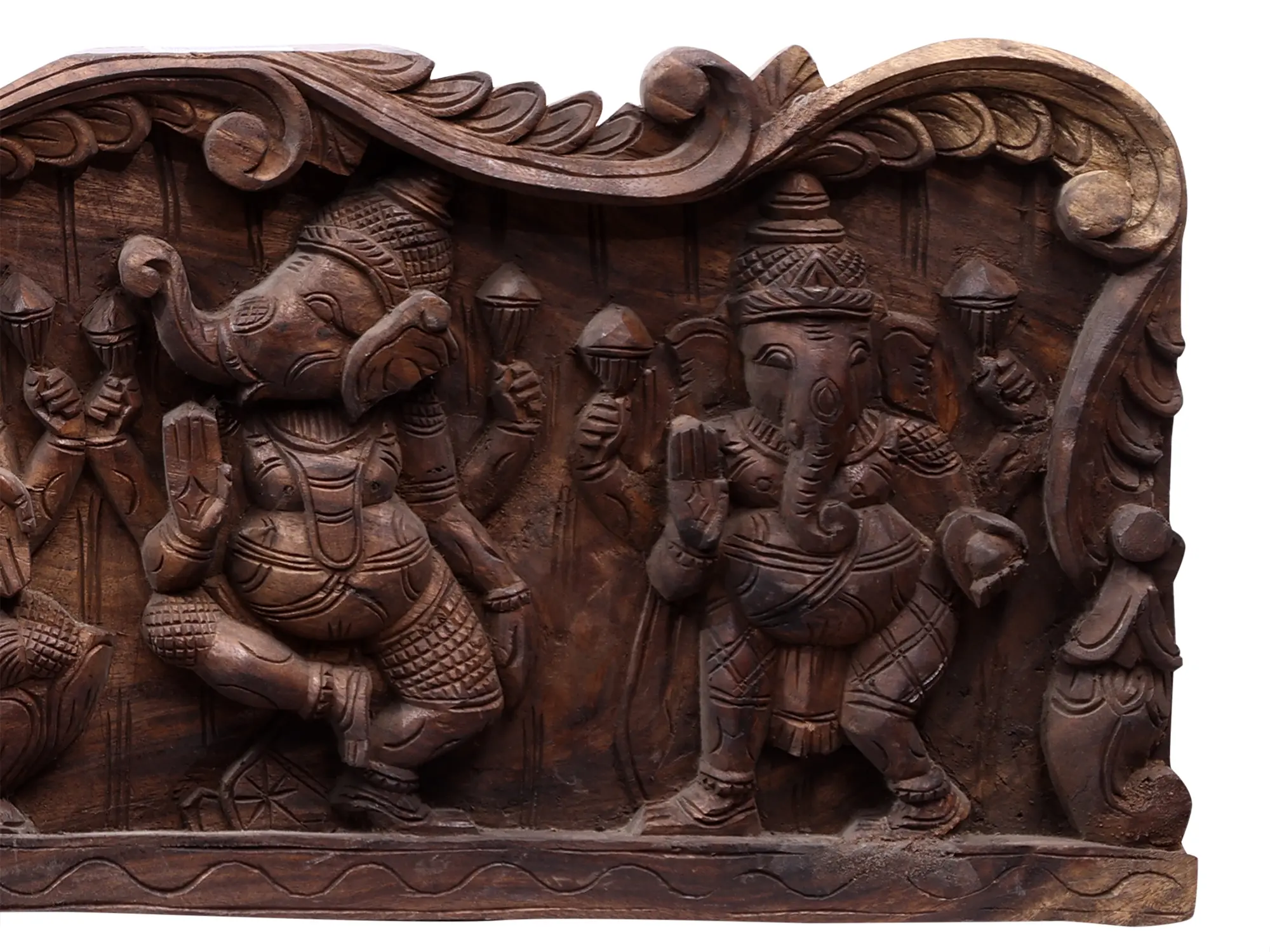Each of the five depicted forms of Ganesha is a testament to the artisan's skill. Notice the distinct poses, the expressive faces, and the intricate adornments that bring these divine figures to life. The central Ganesha, seated serenely on a lotus, embodies tranquility and spiritual enlightenment. Flanking him are Ganeshas in dynamic postures, perhaps depicting their various cosmic roles or moments from sacred stories. The detailed carving extends to the ornate border, featuring decorative scrolls and a central motif that adds to the overall grandeur of the piece. This panel serves as a visual narrative, inviting contemplation and reverence.