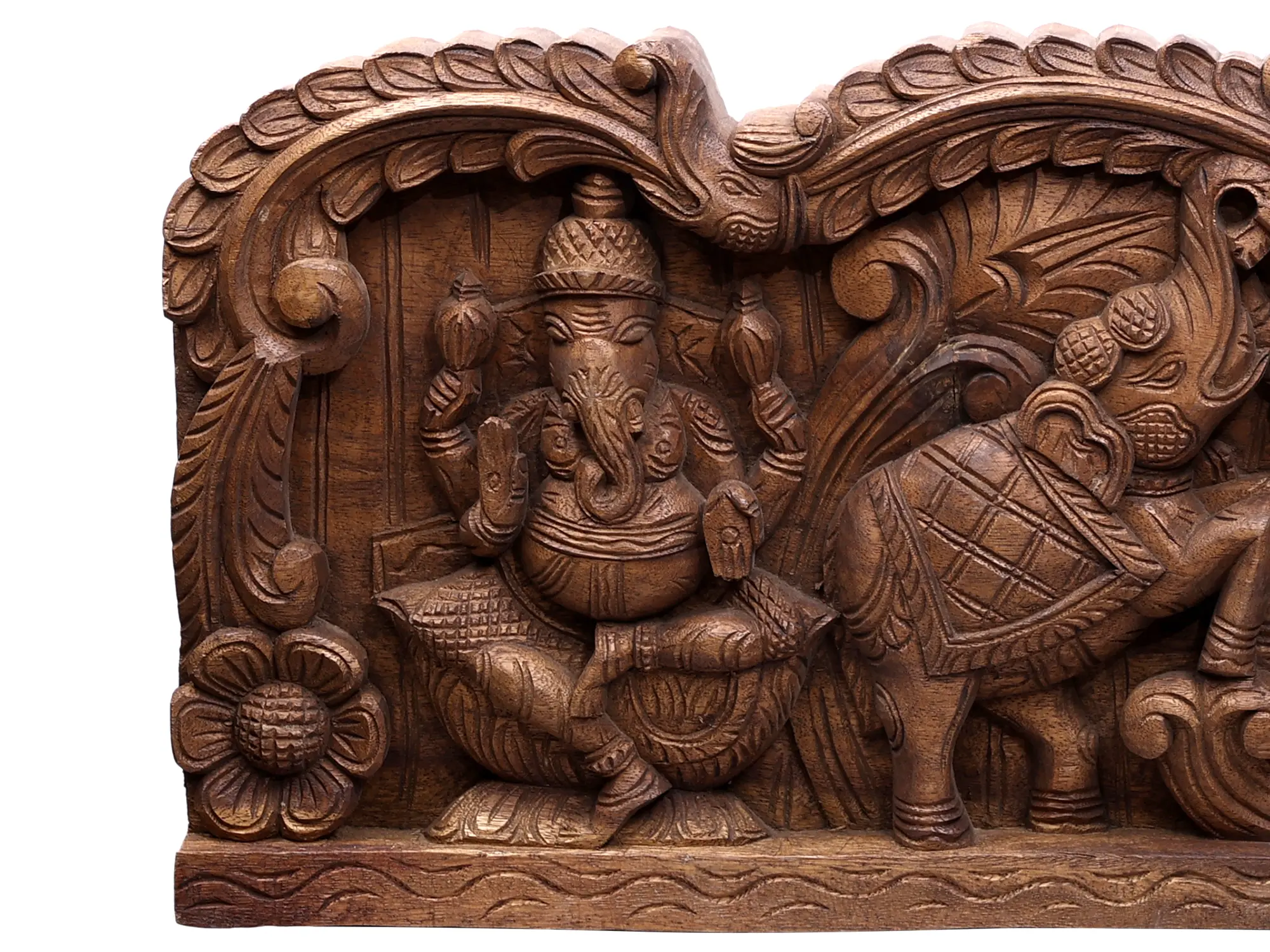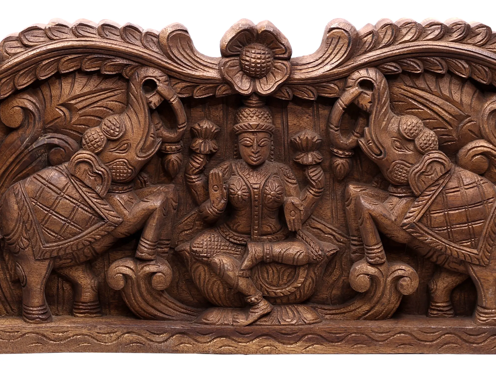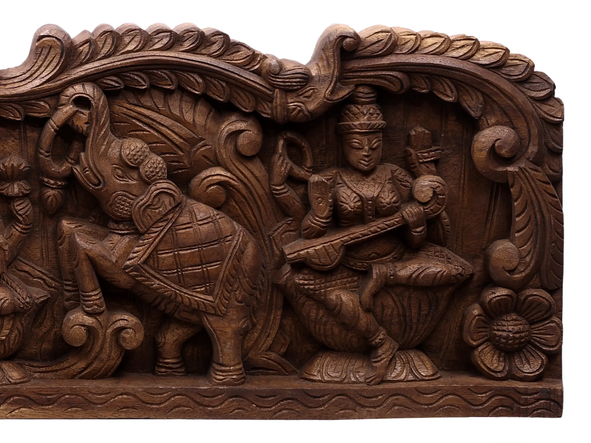Introducing the divine Gaja Lakshmi with Ganesha and Saraswati Wall Panel—an exquisite portrayal of prosperity, wisdom, and divine grace. Crafted with intricate detail and artistic finesse, this panel captures the essence of auspiciousness and abundance. Gaja Lakshmi, the goddess of wealth, stands at the center, surrounded by auspicious elephants, symbolizing power and prosperity. Lord Ganesha, the remover of obstacles, and Saraswati, the goddess of knowledge, flank her sides, radiating blessings of success and wisdom. Adorned with vibrant colors and intricate carvings, this wooden masterpiece serves as a sacred centerpiece in any home or sacred space. Embrace the divine energy of Gaja Lakshmi, Ganesha, and Saraswati, and invite prosperity, success, and enlightenment into your life with this enchanting wall panel.