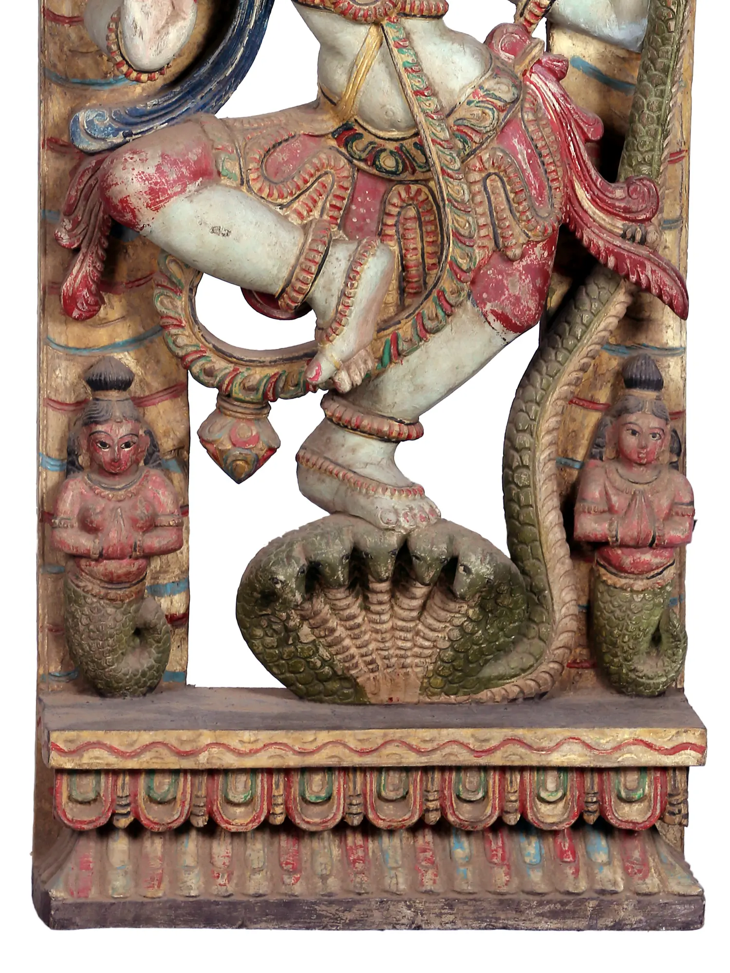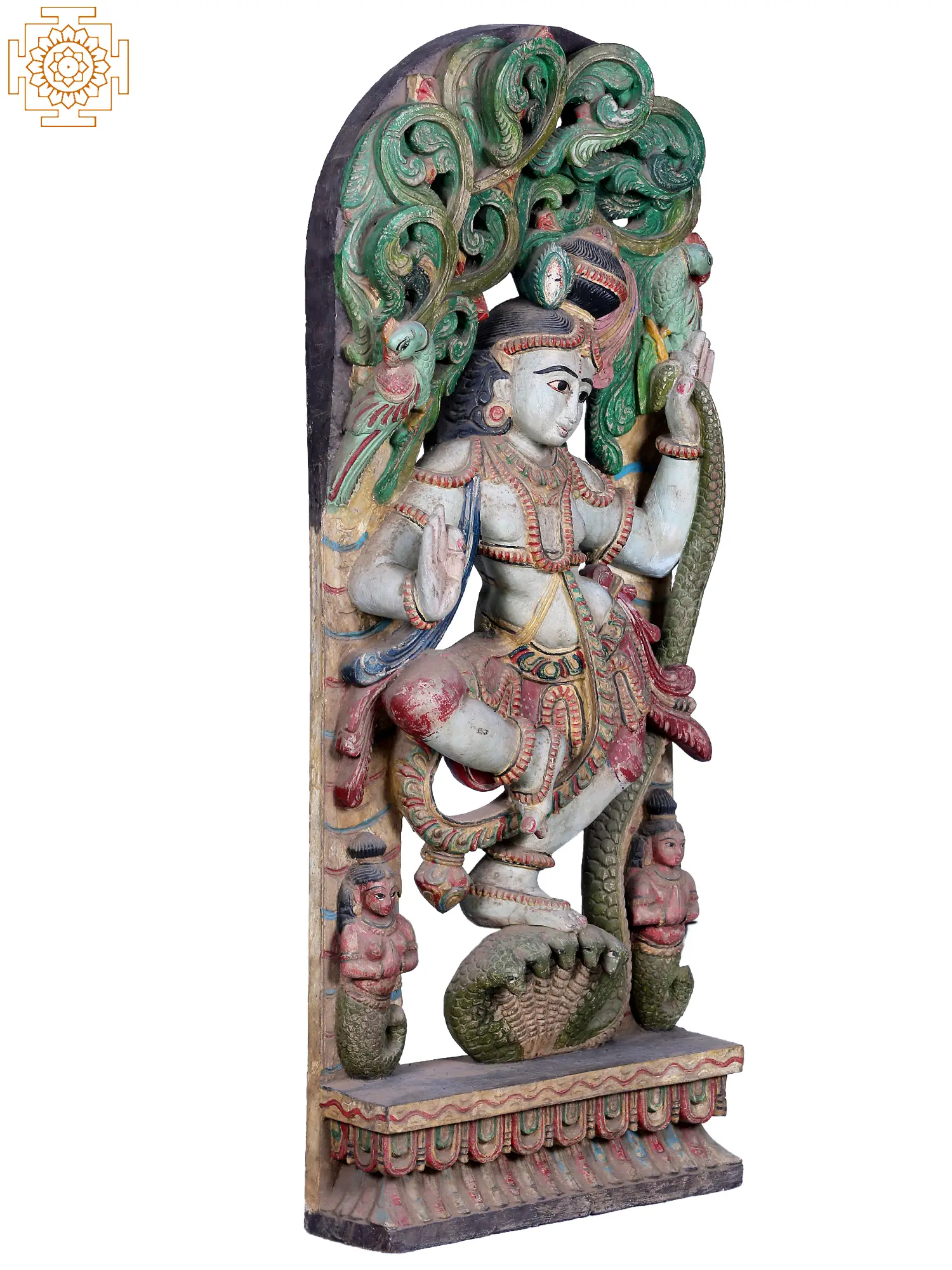 Each element of this carving is meticulously rendered. The flowing robes of Lord Krishna, adorned with traditional patterns, suggest movement and grace. His posture, a delicate balance upon the serpent's hoods, signifies control and mastery. The serpent Kaliya, depicted with multiple heads, some rearing defensively while others are subdued under Krishna's feet, creates a dramatic tension that is visually compelling. The surrounding foliage and the presence of small, devotional figures at the base add depth and context to the narrative. This piece is not merely a decorative object but a vibrant storytelling medium, carrying centuries of tradition and artistic excellence. The choice of wood as the medium allows for a rich texture and depth, making the carving feel both organic and eternal. The hand-painted details, with their subtle variations in color and tone, contribute to the unique character of each individual piece. This artwork is ideal for anyone seeking to bring a sense of sacred beauty, mythological depth, and artistic grandeur into their home or sacred space. It serves as a constant reminder of the triumph of good over evil and the divine presence that watches over the world. The serene yet powerful depiction of Krishna invites contemplation and reverence, making it a truly exceptional addition to any collection.