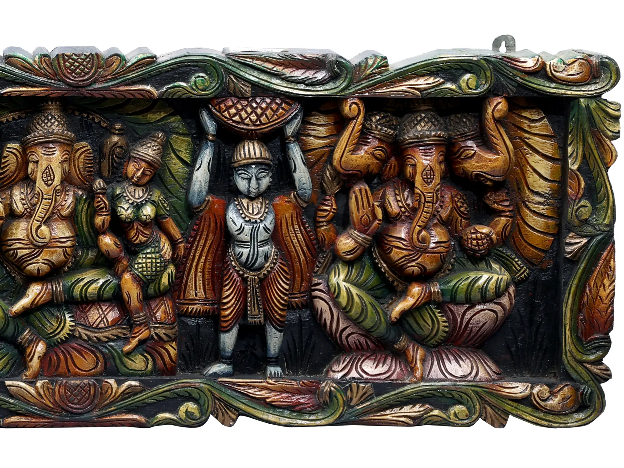 Invite the auspicious presence of Lord Ganapati into your home with this stunning, large wooden wall panel. This meticulously carved masterpiece showcases the elephant-headed deity in his multifaceted glory, surrounded by figures that evoke stories of prosperity, wisdom, and divine intervention. The rich, hand-painted details bring each element to life, creating a focal point that radiates spiritual energy and artistic brilliance. The central figure of Lord Ganapati is depicted seated majestically, his form radiating power and serenity. He is revered as the remover of obstacles and the patron of arts and sciences, making him a beloved deity for invoking blessings and overcoming challenges. The panel captures his essence through intricate carvings of his iconic trunk, large ears, and multiple arms, each holding symbolic objects. Alongside him, flanking figures represent the divine companionship and support he offers, adding layers of narrative and meaning to the artwork. ––––––––––––––––––––