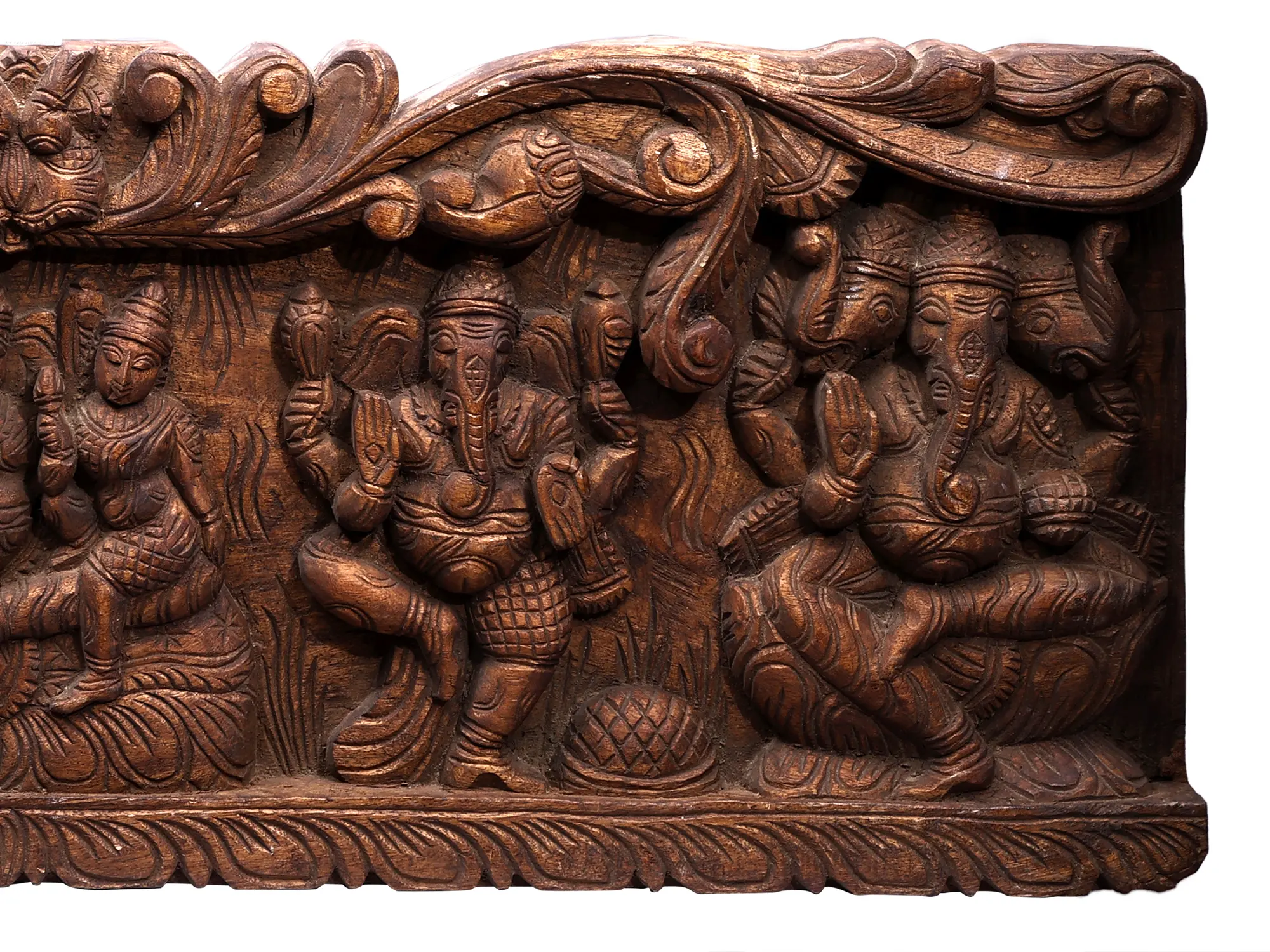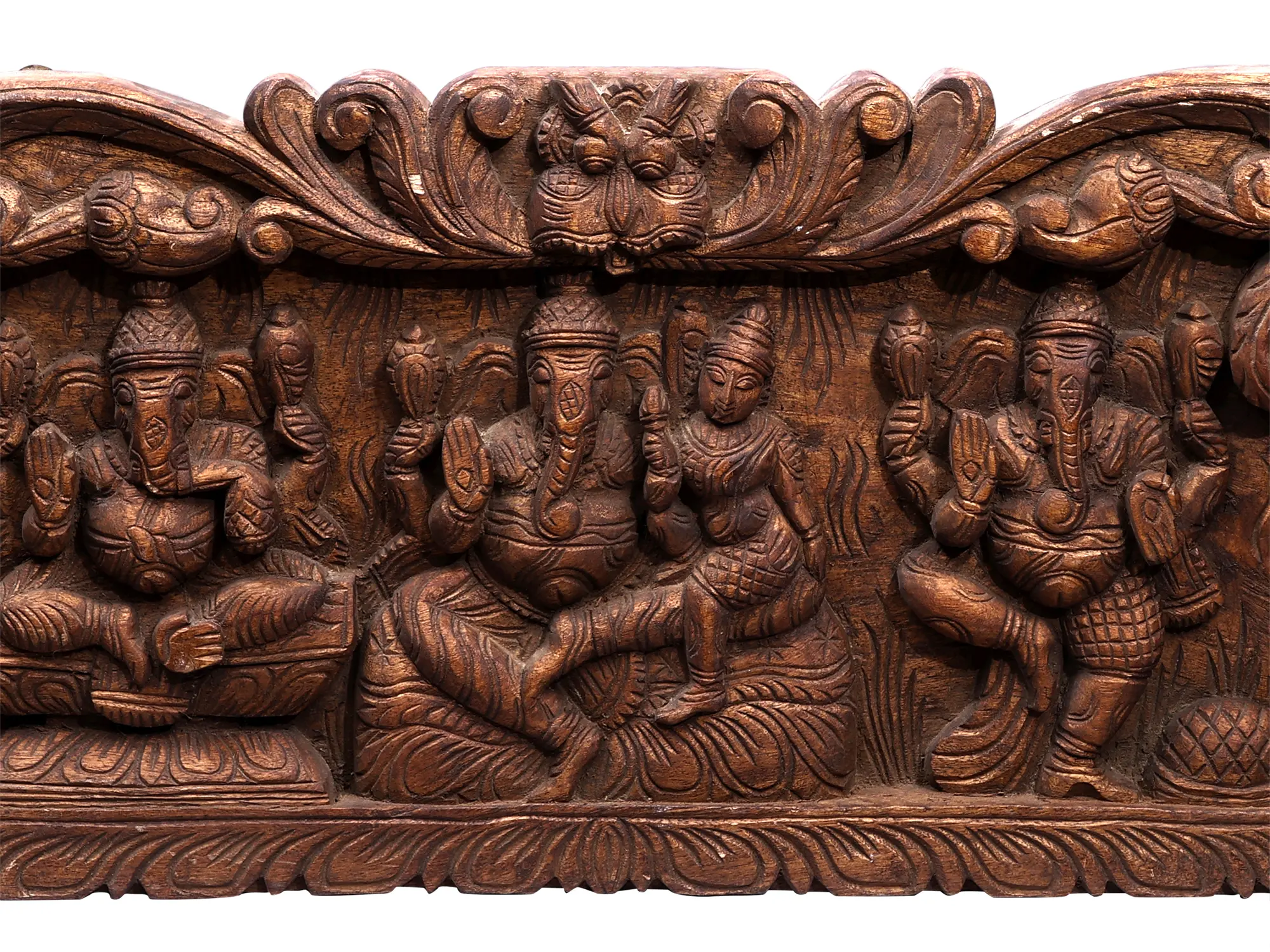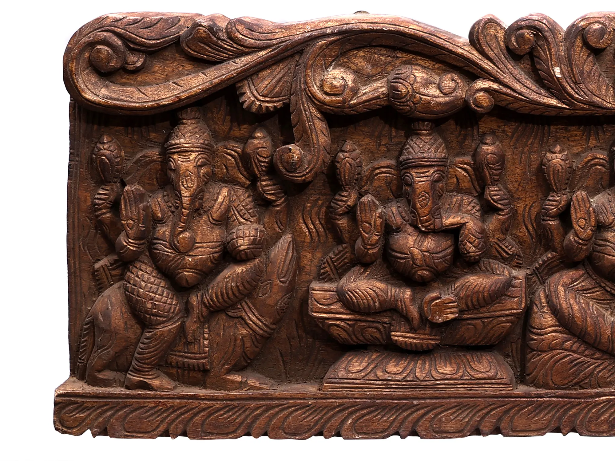 For the Ganapatayas (a sect that worships Ganesha as the supreme being), the elephant-faced Lord is the primordial deity, the sole source of Dharma, Artha, Kama, and Moksha, for which the followers of Ganesha worship different aspects of the Lord. In this wooden wall panel, five forms of Ganesha out of his powerful 32 aspects are carved with meticulous details, making this a potent Yantra (ritual device) for a Hindu devotee of the god.