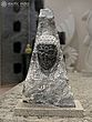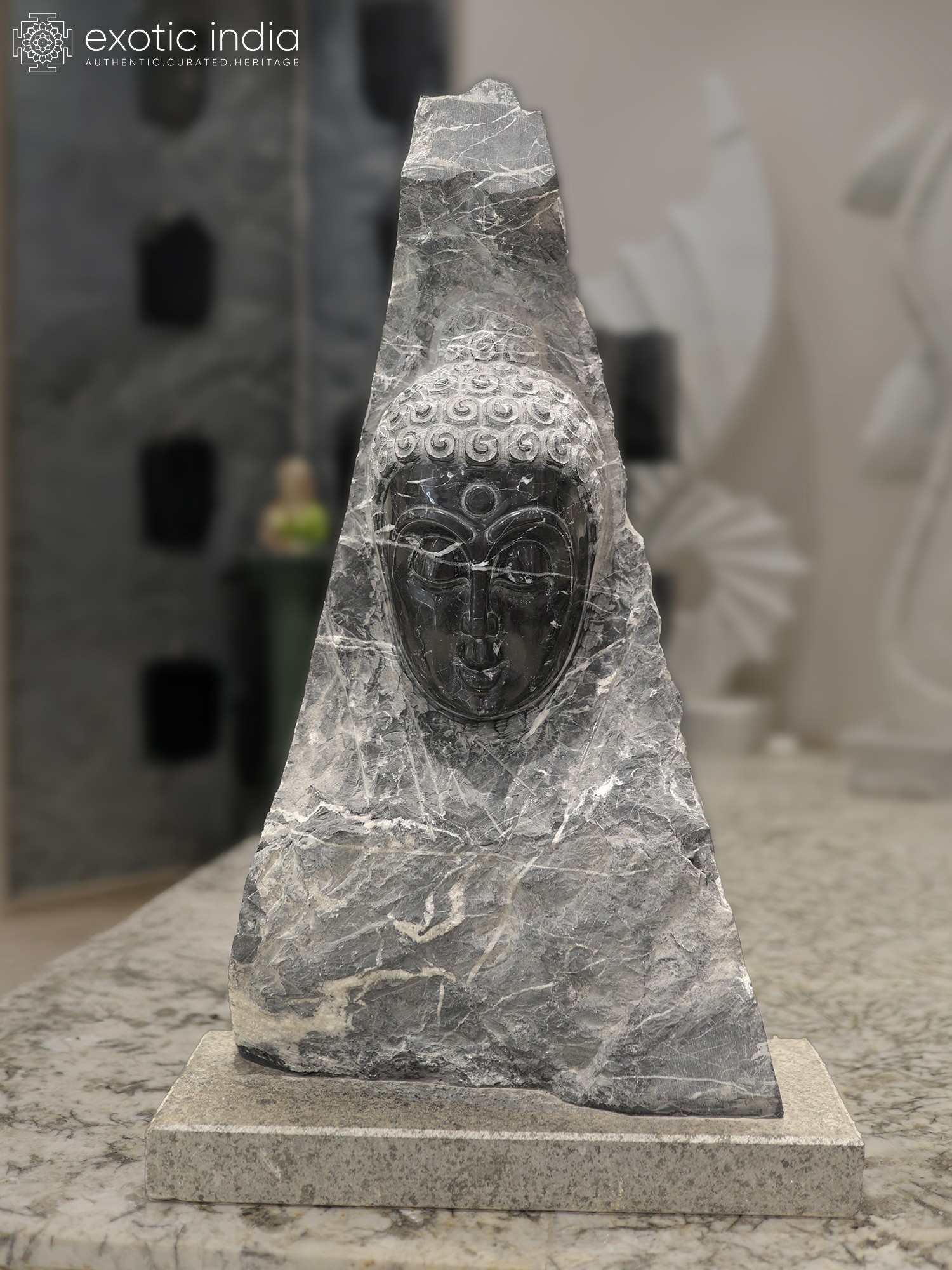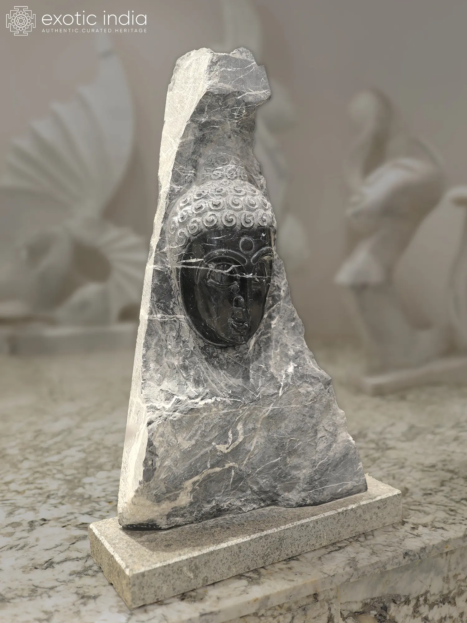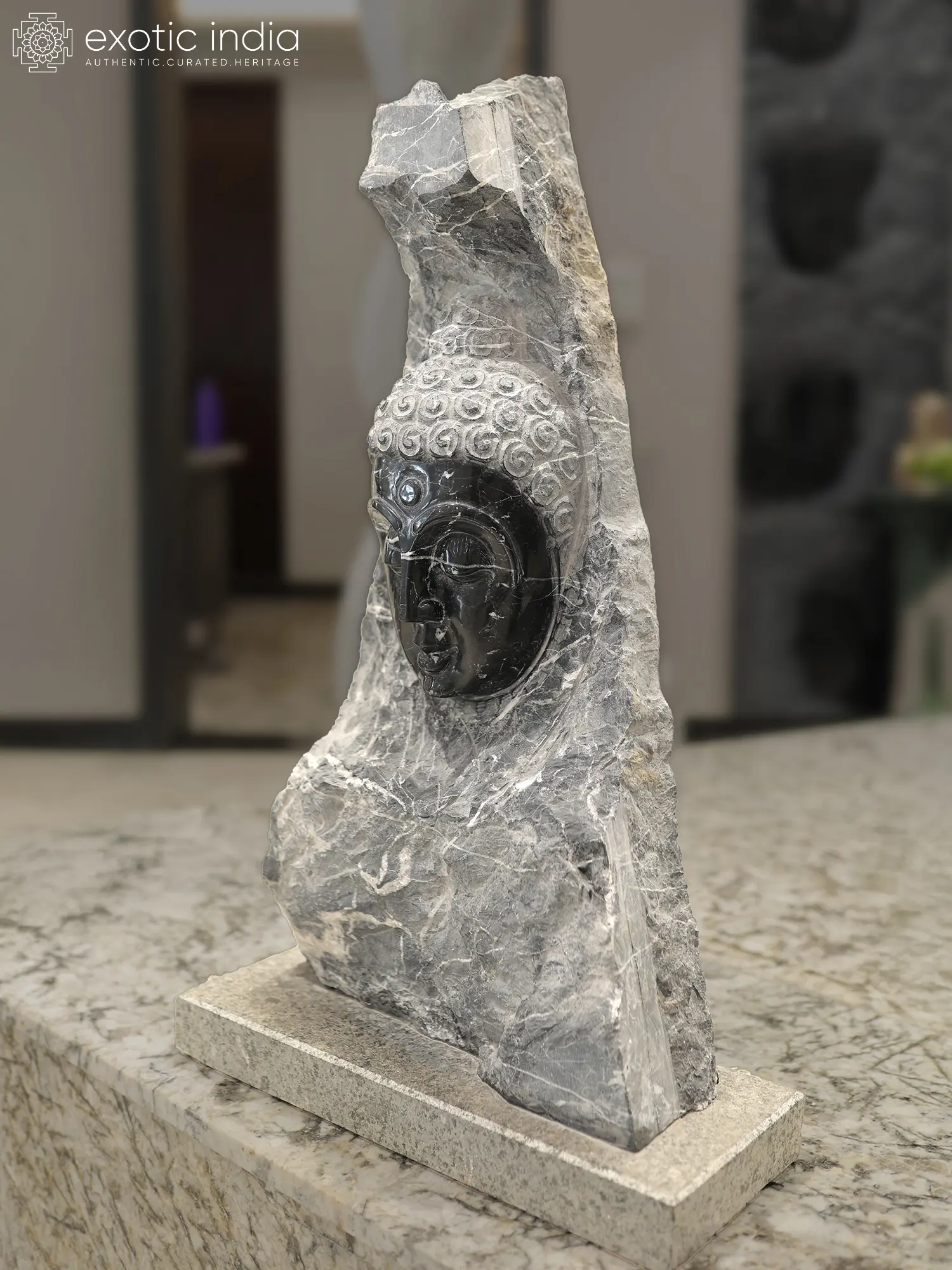 This striking sculpture captures the essence of Lord Buddha's profound serenity and wisdom. Carved from natural black marble, the piece presents an arresting juxtaposition of rough, unpolished stone and the meticulously rendered features of the Buddha's face. The raw, untamed texture of the surrounding marble serves to highlight the delicate artistry of the sculpted visage, creating a powerful visual narrative of inner peace emerging from the unrefined chaos of the world. The iconic curls adorning the Buddha's ushnisha, a symbol of his supreme knowledge, are rendered with fine detail, contrasting sharply with the textured grey marble that forms the raw, primal backdrop. His gentle, closed eyes invite contemplation, and the subtle curve of his lips suggests a compassionate smile, embodying the Buddhist ideal of boundless empathy. This is not merely a statue; it is a meditation in stone, a silent testament to the transformative power of mindfulness and detachment. ––––––––––––––––––