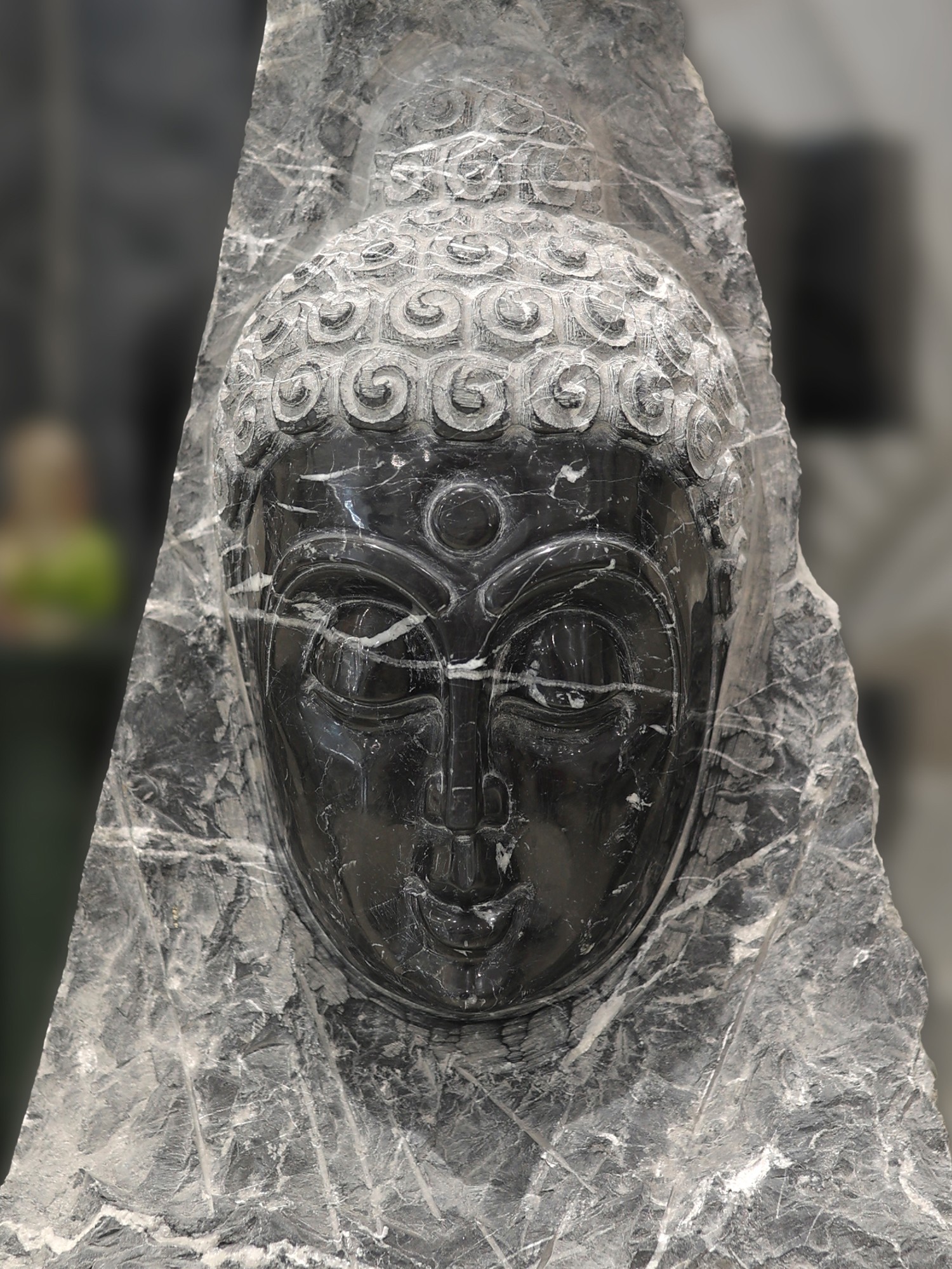 This contemporary artwork breathes new life into traditional iconography. The use of natural marble, with its inherent variations and organic patterns, imbues the sculpture with a sense of ancient earthiness, while the abstract form of the stone itself speaks to modern artistic sensibilities. The choice of black marble lends a dramatic and sophisticated aura, evoking the profound depth and mystery often associated with spiritual enlightenment. In Buddhist tradition, marble is often associated with purity and permanence, making it a fitting medium for depicting the eternal teachings of the Buddha. Ancient artisans frequently chose stone to immortalize the Buddha's presence, believing it to be a material that could withstand the passage of time, much like his wisdom. This sculpture, with its modern artistic flair, connects us to that long lineage of devotion and artistic expression, offering a timeless symbol of peace and spiritual awakening for contemporary spaces. ––––––––––––––––––
