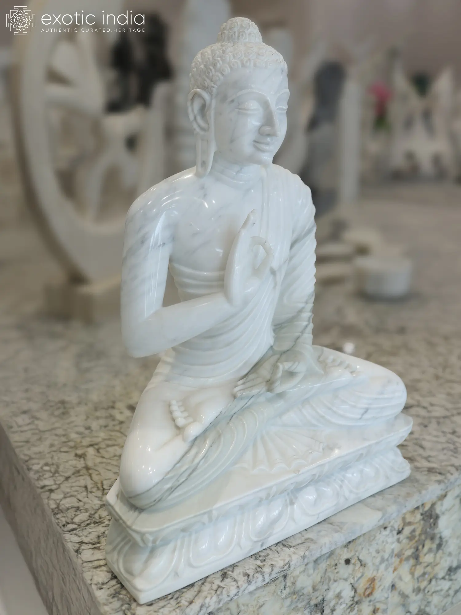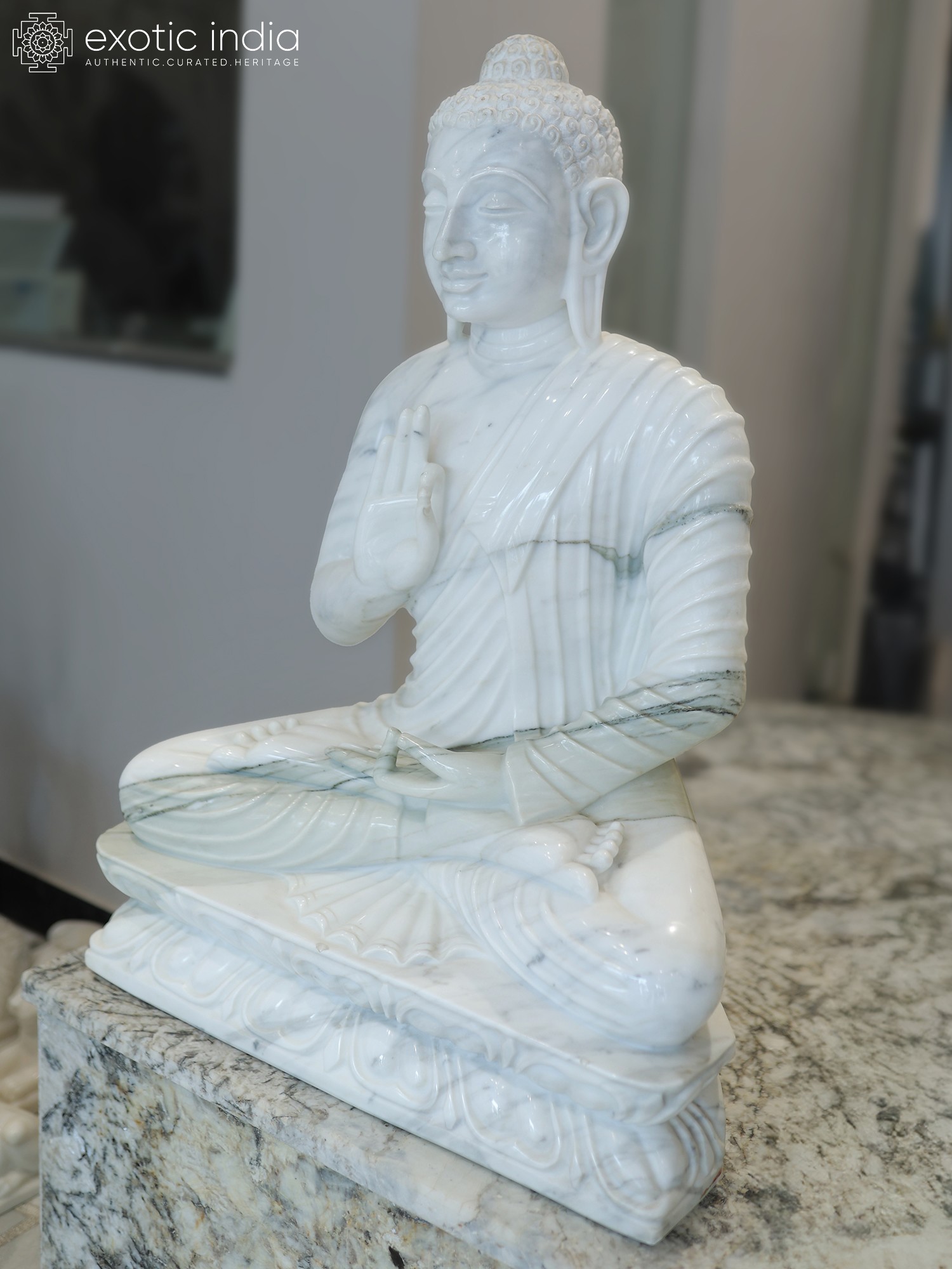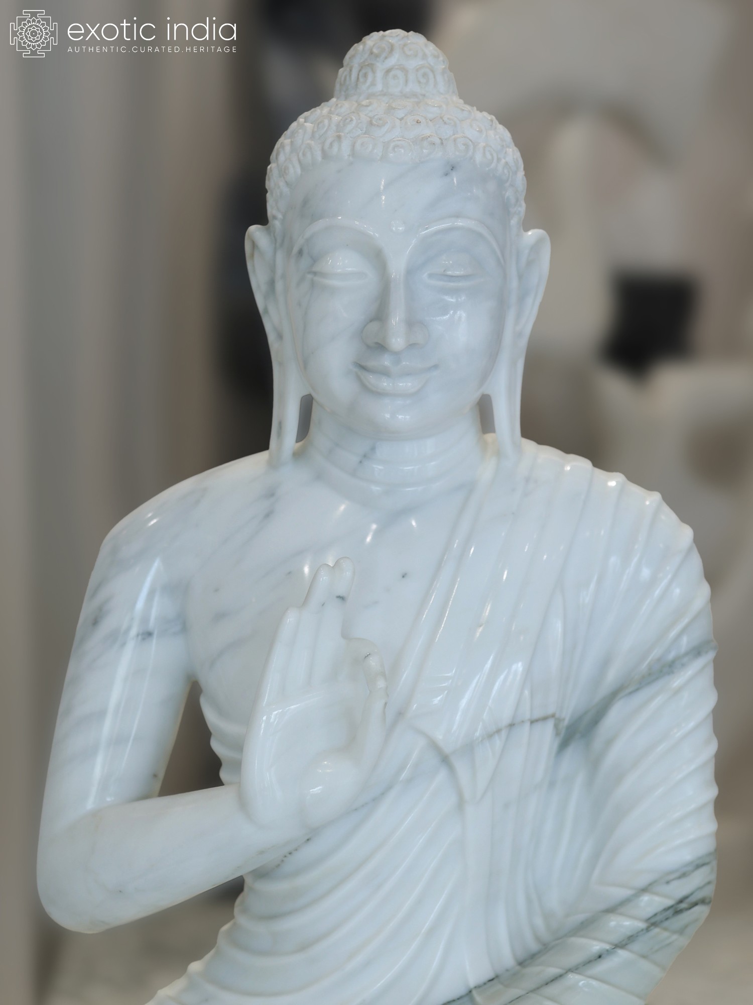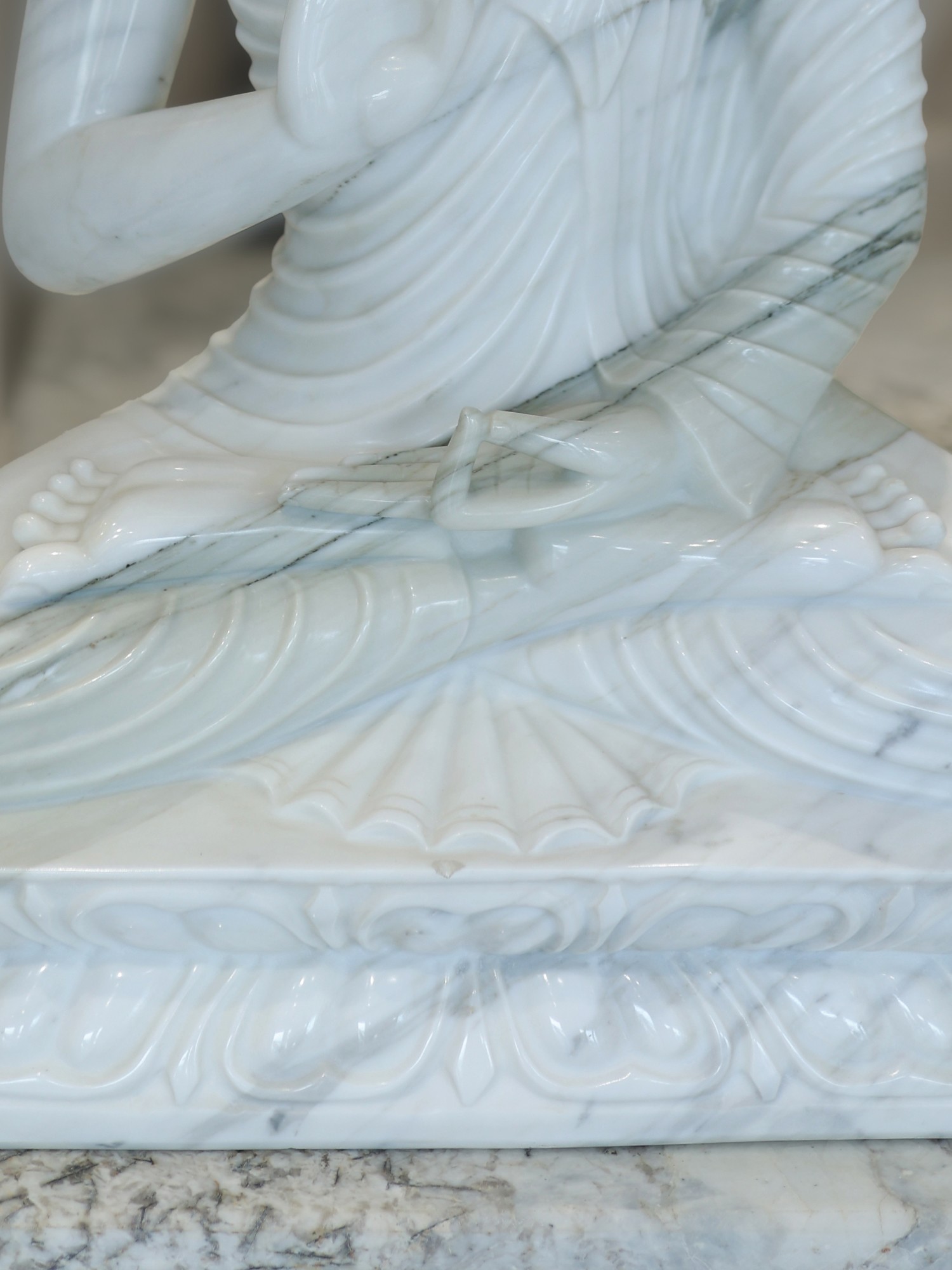 This magnificent sculpture captures Lord Buddha in the serene and instructive Vitarka Mudra, a gesture signifying the imparting of wisdom and the flow of energy. Carved from pure, natural white marble, the statue exudes an aura of tranquility and spiritual depth. The cool, smooth surface of the marble, veined with subtle grey swirls, enhances the divine presence of the figure, making it a captivating centerpiece for any sacred space, garden, or contemplative area. The artistry is evident in every detail. The folds of the Buddha's robes are rendered with remarkable precision, creating a sense of soft drapery that flows gracefully around his form. His serene countenance, with closed eyes and a gentle, knowing smile, invites contemplation and inner peace. The architectural elements of the lotus pedestal, upon which the Buddha is seated, are intricately sculpted, symbolizing purity, enlightenment, and spiritual awakening – fundamental tenets of Buddhist philosophy. The lotus, in many traditions, is a symbol of rebirth and the spiritual journey from darkness into light, mirroring the Buddha's own path to enlightenment.