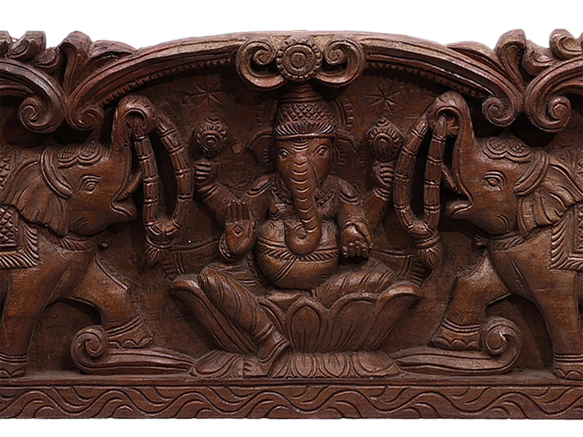 Lord Ganesha is revered as the Vighnaharta, the remover of obstacles, and is invoked at the commencement of all important undertakings, from new ventures to marriages and festivals. His form symbolizes intellect, good fortune, and the overcoming of challenges. The elephants are also powerful symbols in Hindu culture, representing strength, wisdom, and royalty. In ancient Indian texts, elephants are often depicted as being associated with the divine, carrying gods and goddesses or participating in sacred processions. The lotus upon which Ganesha is seated signifies purity, spiritual awakening, and enlightenment, as the lotus rises unblemished from muddy waters. This carving, therefore, embodies a profound spiritual narrative, inviting blessings of success and peace into your life. The meticulous attention to detail in the carving, from the textures of the wood to the expressions on the faces, speaks to the skill of the artisan and the deep reverence for the subject matter.