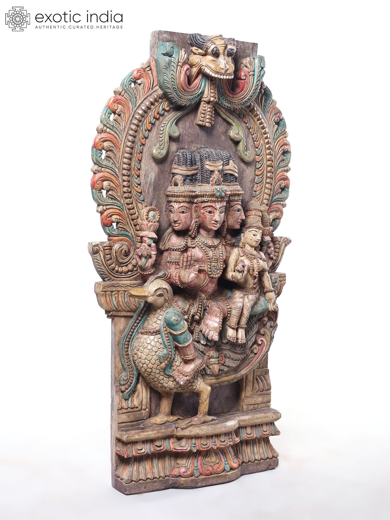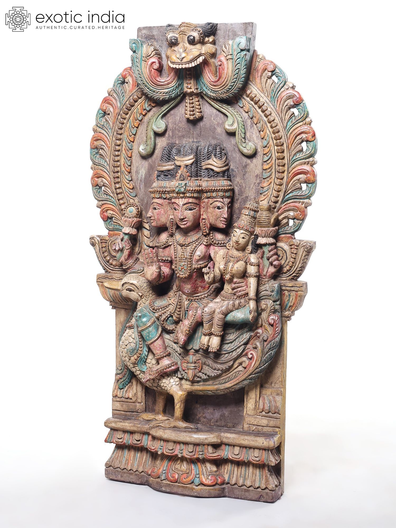 36" Lord Murugan (Kartikeya) with Consort on Peacock – Hand Carved Wood Statue