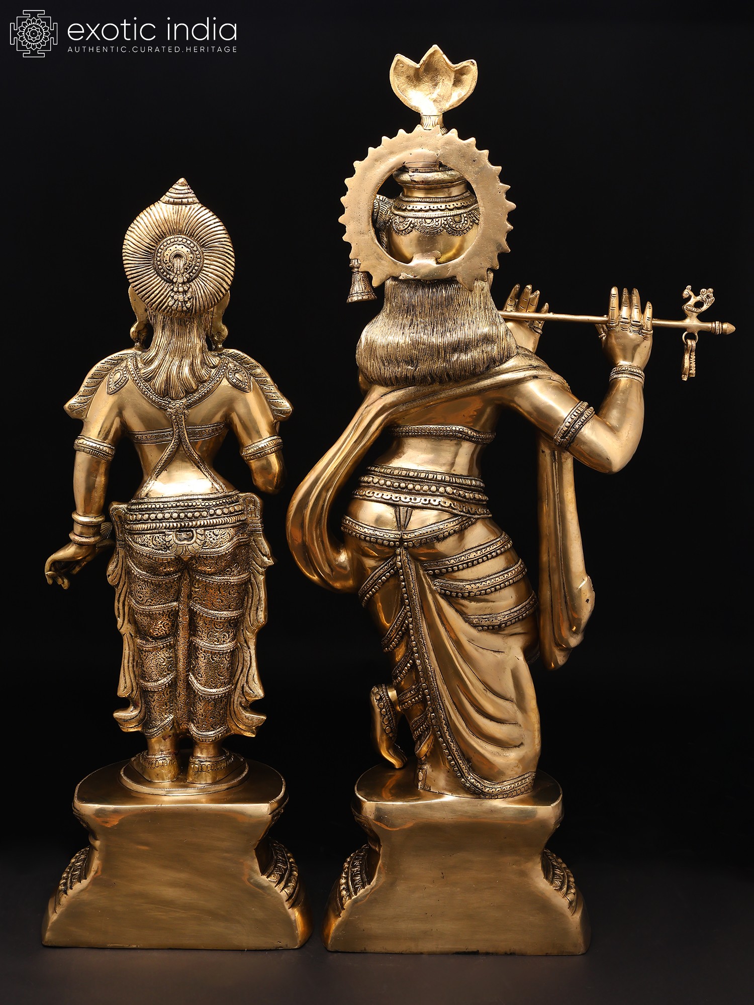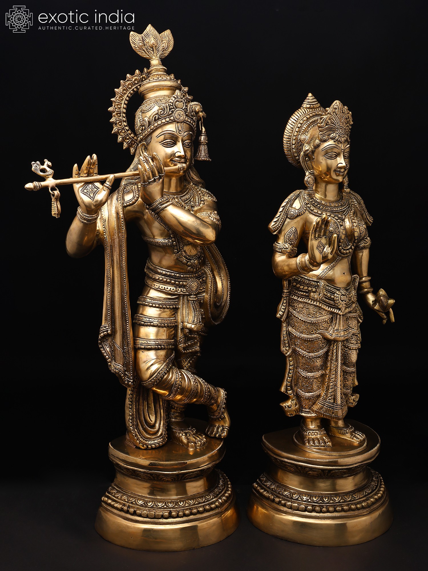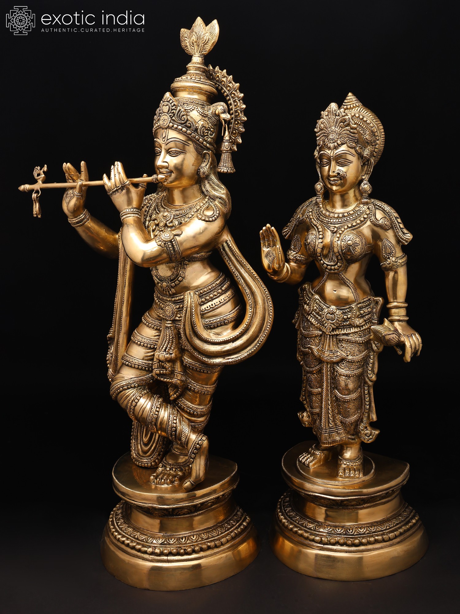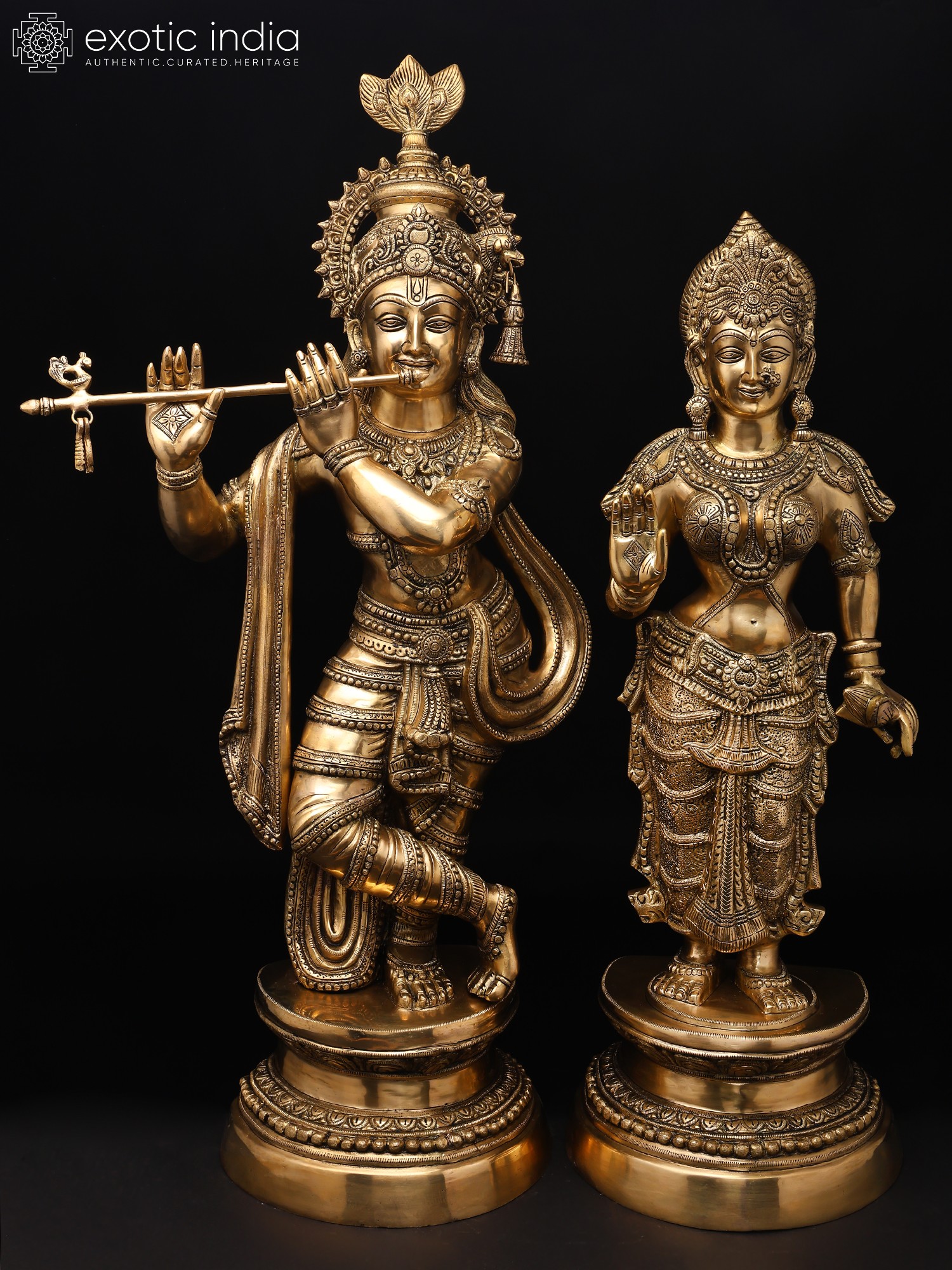 The amorous couple, Radha-Krishna, standing on discrete plinths. It is a twin-murti composition in brass. Lord Krishna in the tribhanga stance (the body jutting out laterally at three different junctures, namely the shoulders, the hips, and the ankle) plays on His flute, while His Radha raises a hand in blessing over devotees. The finish is a deep, lustrous gold, characteristic of the pure brass medium. The Lord and His Vrindavan ladylove bear a composure of omnibenevolence and omniscience. His is a more ornate crown with peacock plumage at the zenith, while Hers is more in keeping with the shape of Her feminine skull.