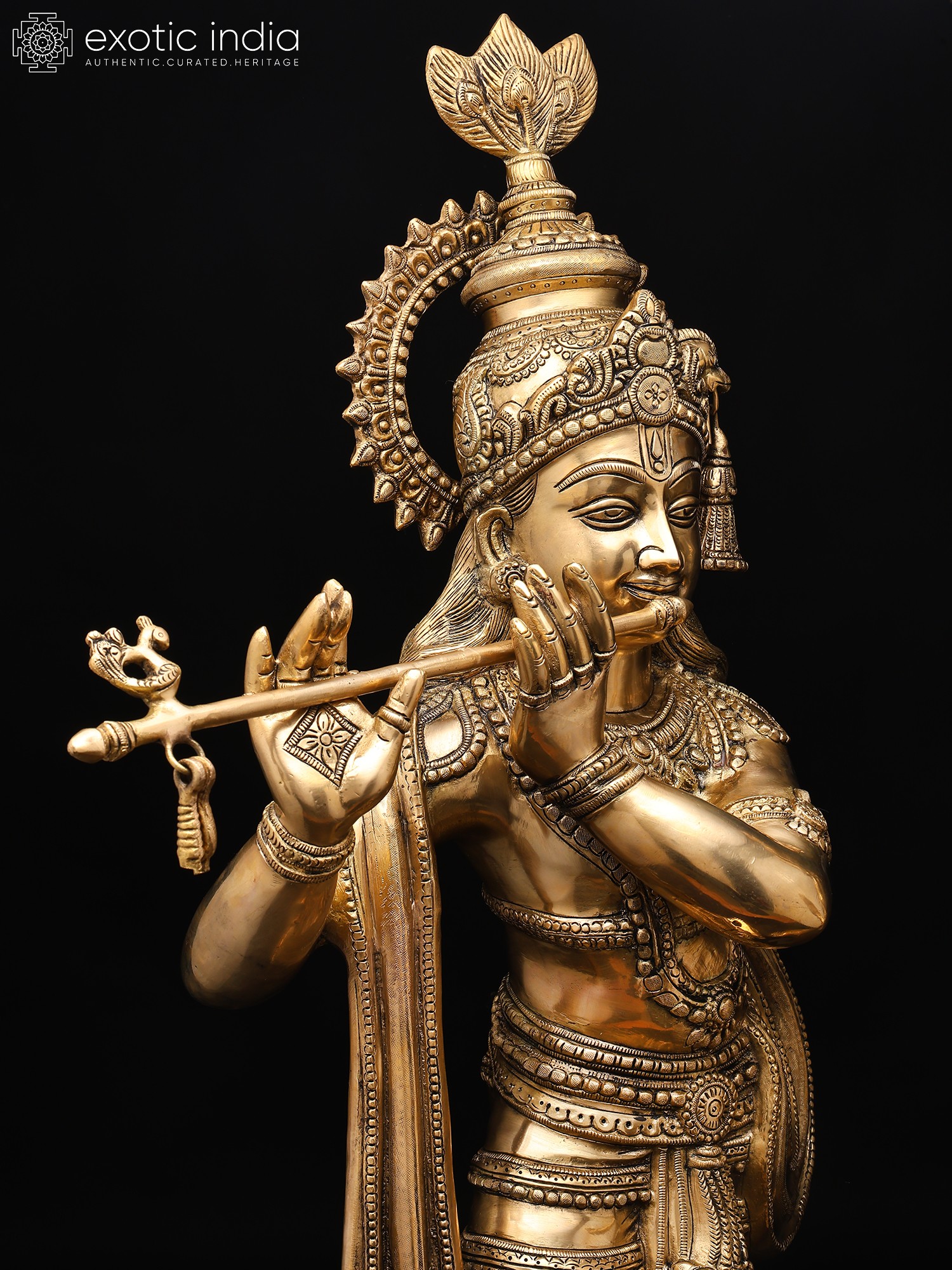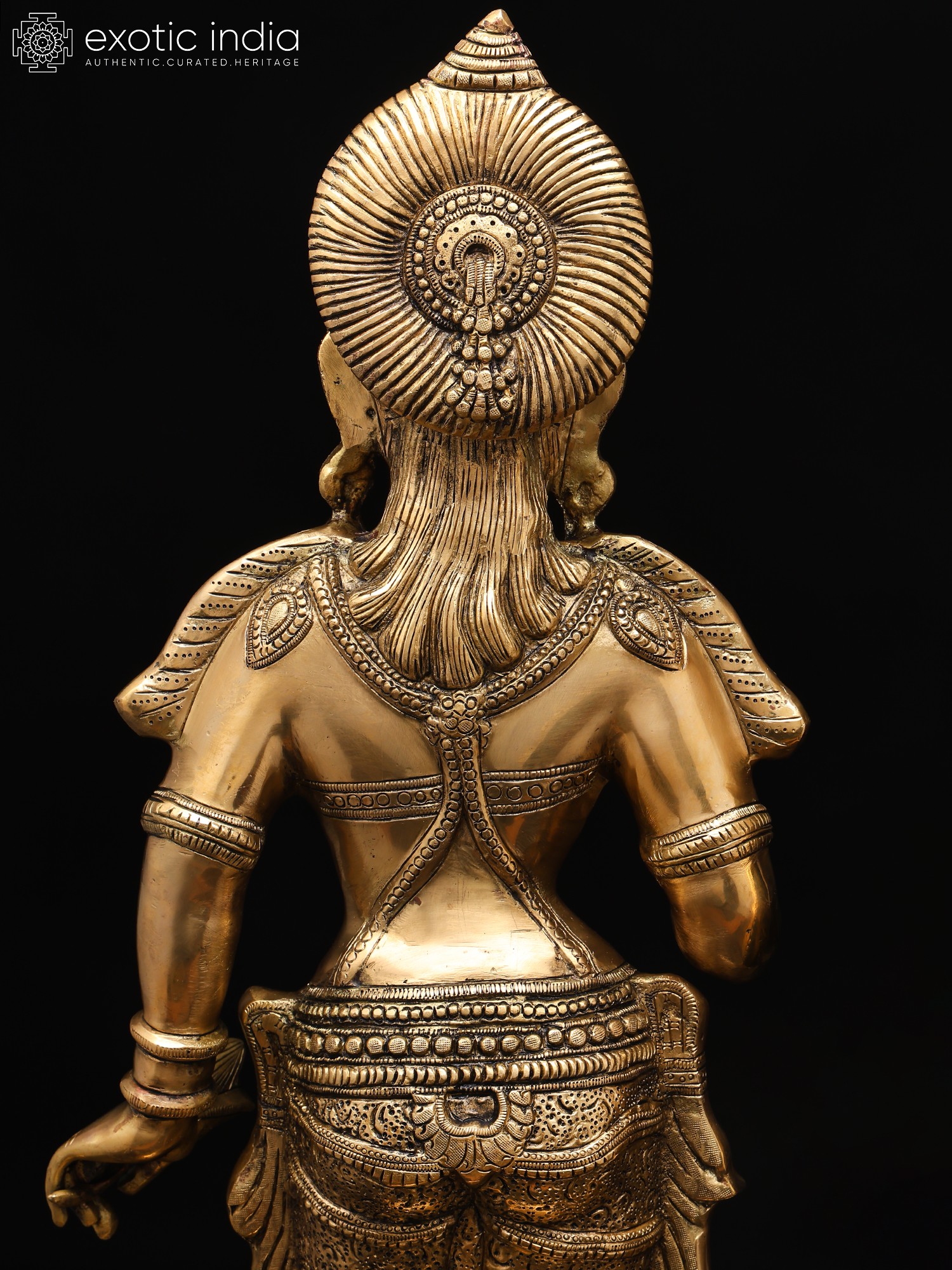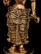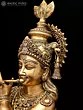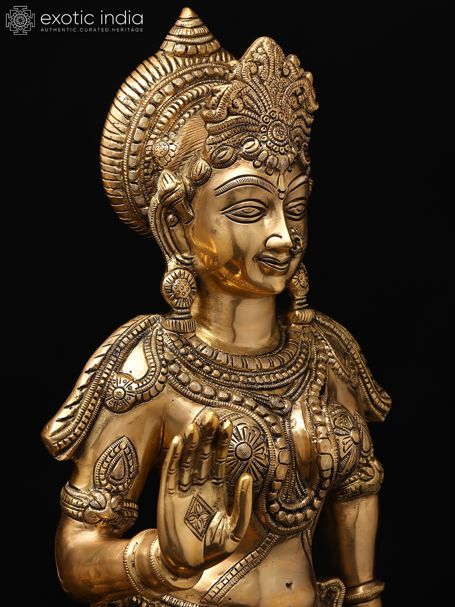 The amorous couple, Radha-Krishna, standing on discrete plinths. It is a twin-murti composition in brass. Lord Krishna in the tribhanga stance (the body jutting out laterally at three different junctures, namely the shoulders, the hips, and the ankle) plays on His flute, while His Radha raises a hand in blessing over devotees. The finish is a deep, lustrous gold, characteristic of the pure brass medium. The Lord and His Vrindavan ladylove bear a composure of omnibenevolence and omniscience. His is a more ornate crown with peacock plumage at the zenith, while Hers is more in keeping with the shape of Her feminine skull.