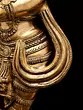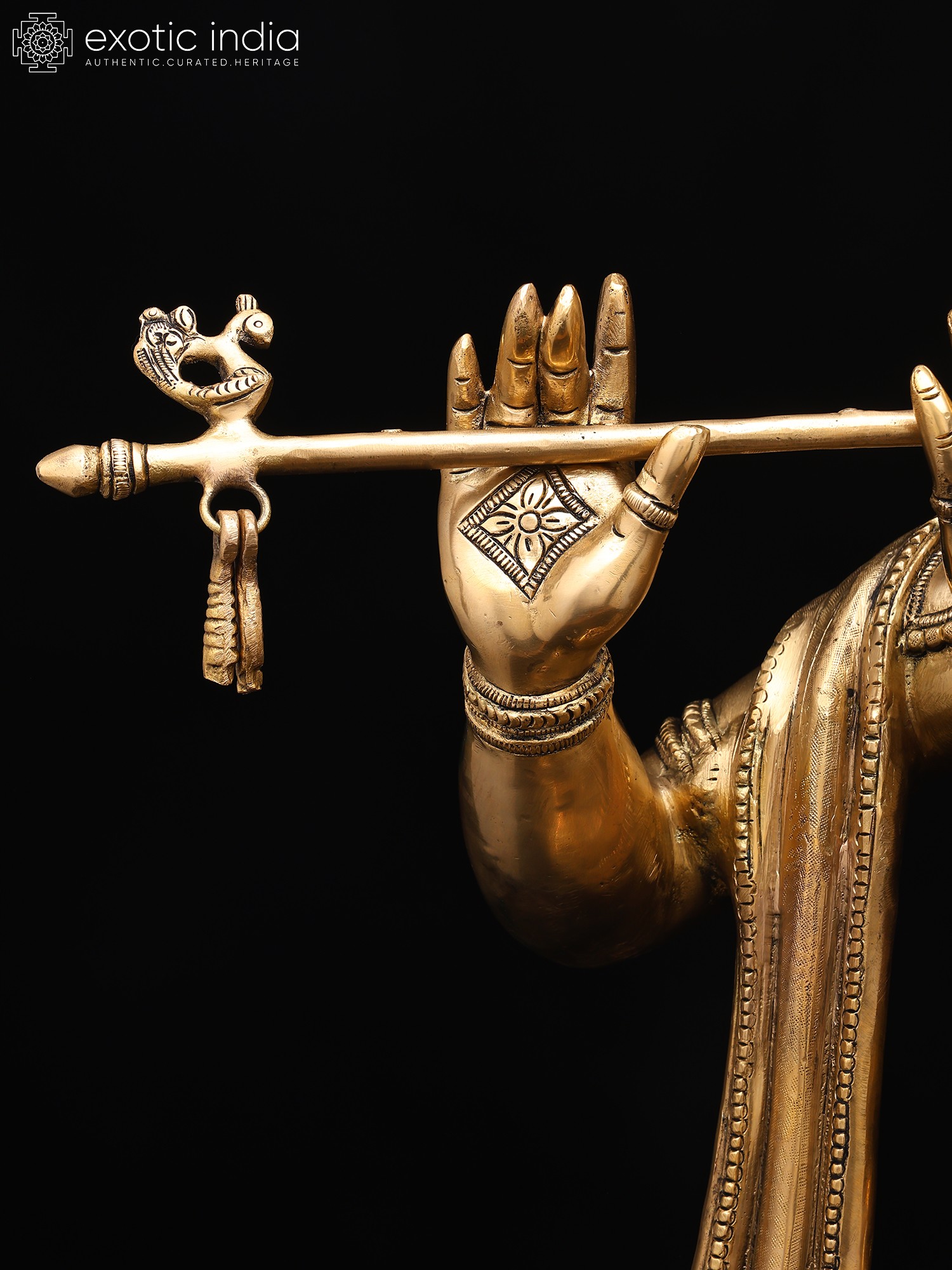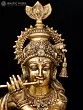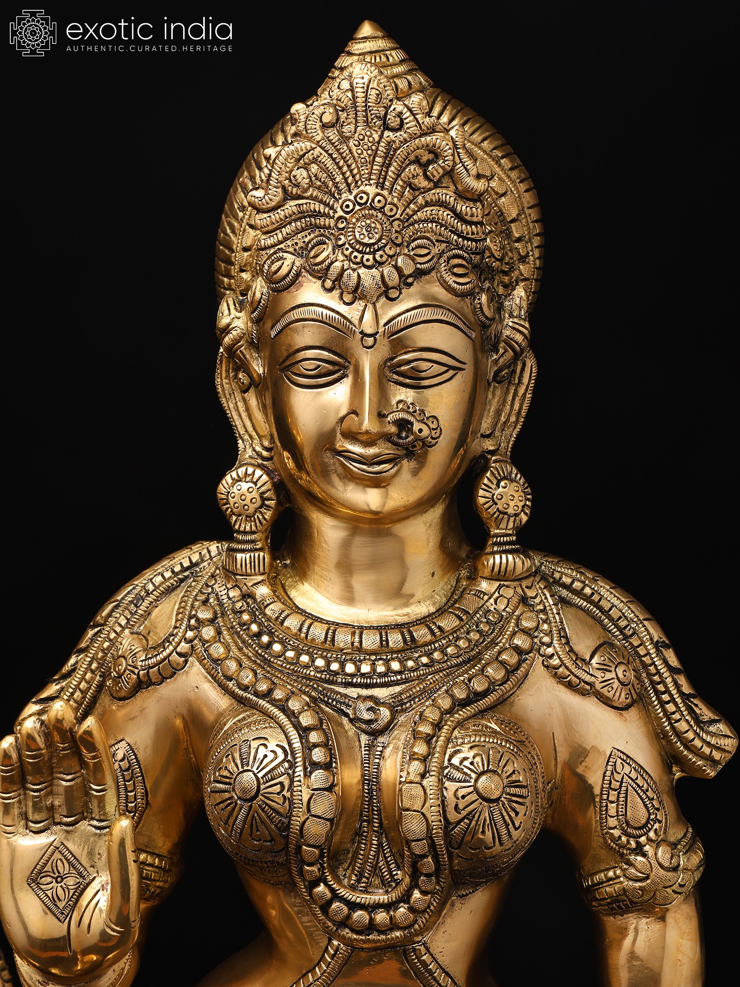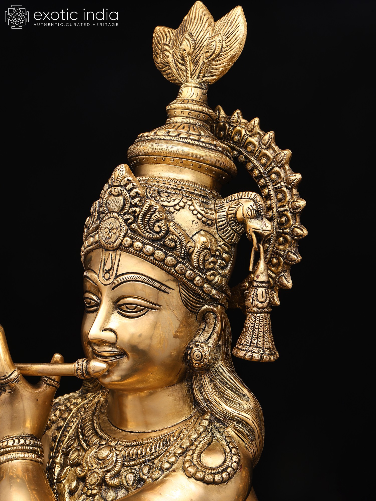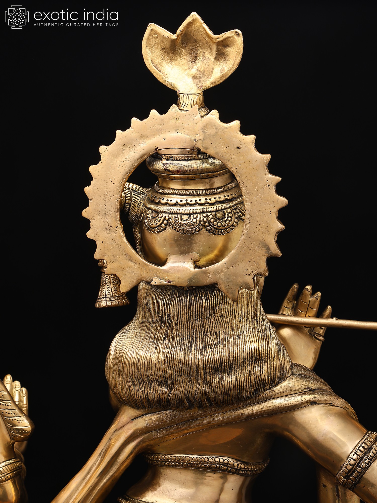 The amorous couple, Radha-Krishna, standing on discrete plinths. It is a twin-murti composition in brass. Lord Krishna in the tribhanga stance (the body jutting out laterally at three different junctures, namely the shoulders, the hips, and the ankle) plays on His flute, while His Radha raises a hand in blessing over devotees. The finish is a deep, lustrous gold, characteristic of the pure brass medium. The Lord and His Vrindavan ladylove bear a composure of omnibenevolence and omniscience. His is a more ornate crown with peacock plumage at the zenith, while Hers is more in keeping with the shape of Her feminine skull.