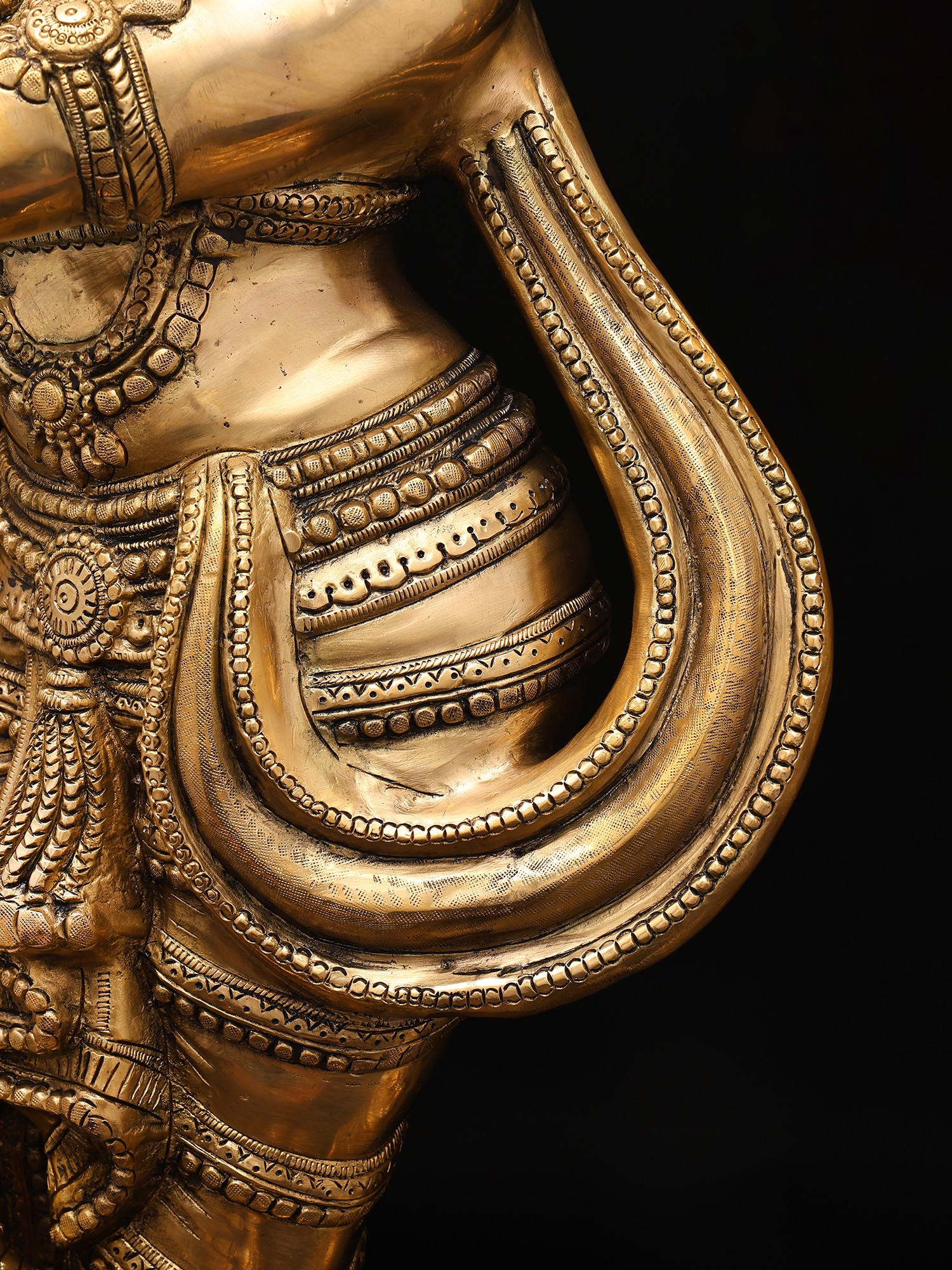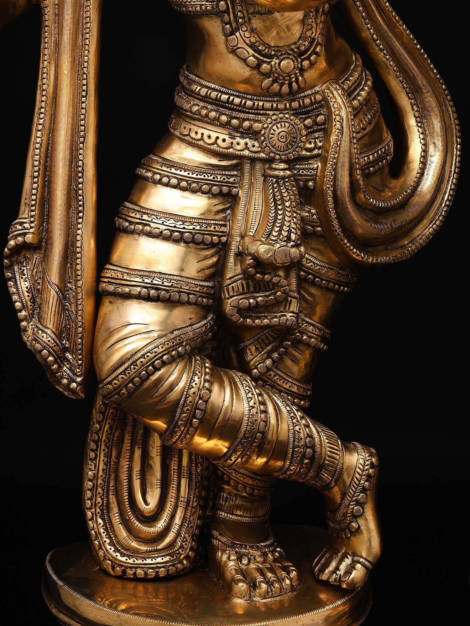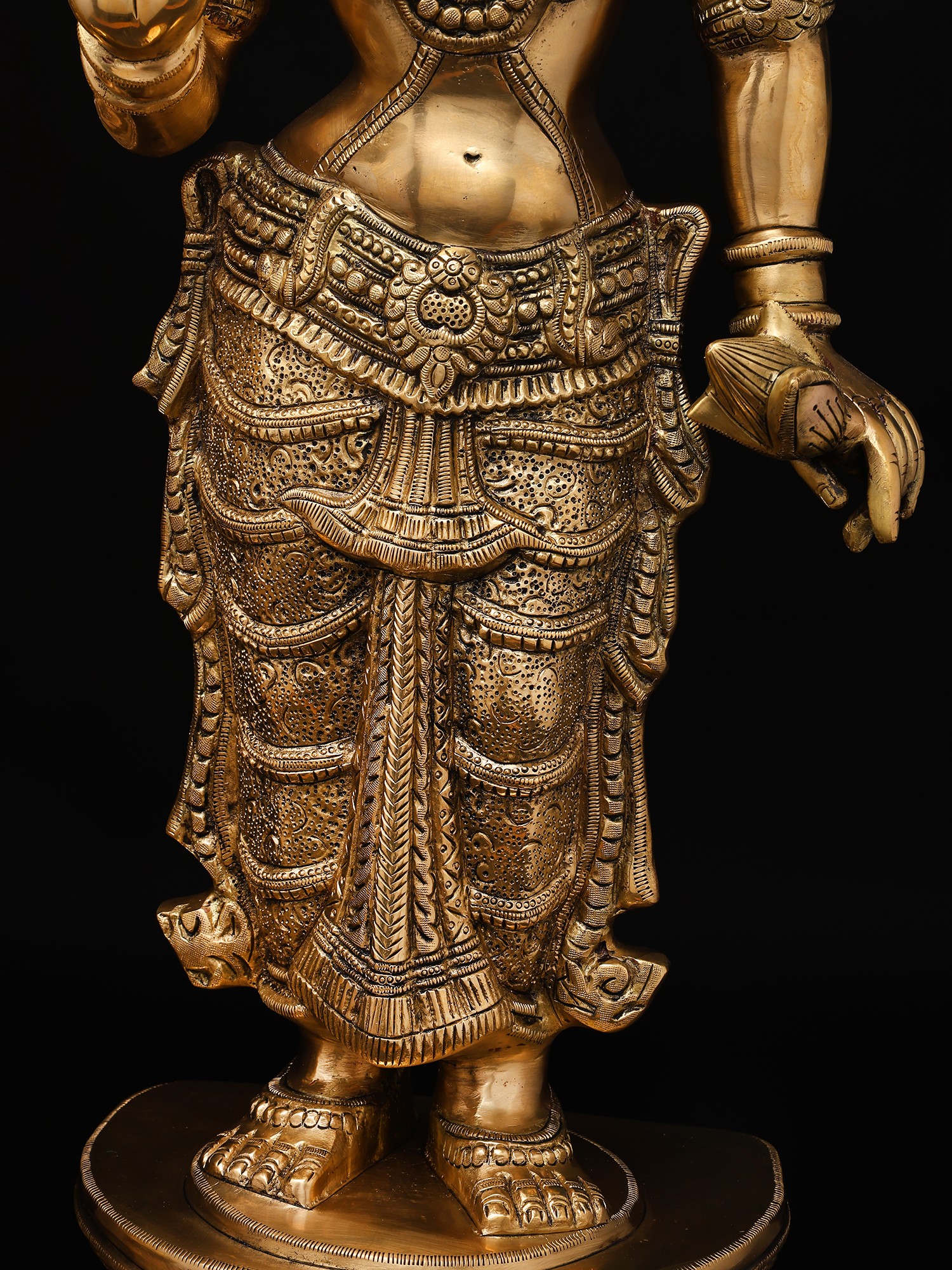 Krishna is in a dhoti and angavastram, while Radha is also wearing a dhoti with layers upon layers of jewels on Her full-figured torso. Note the sheer level of detail introduced into the crowns and dhoties of each deity. The plinths they stand on are identical - multi-tiered, engraved with two circular rows of lotus petals of a different proportion each.