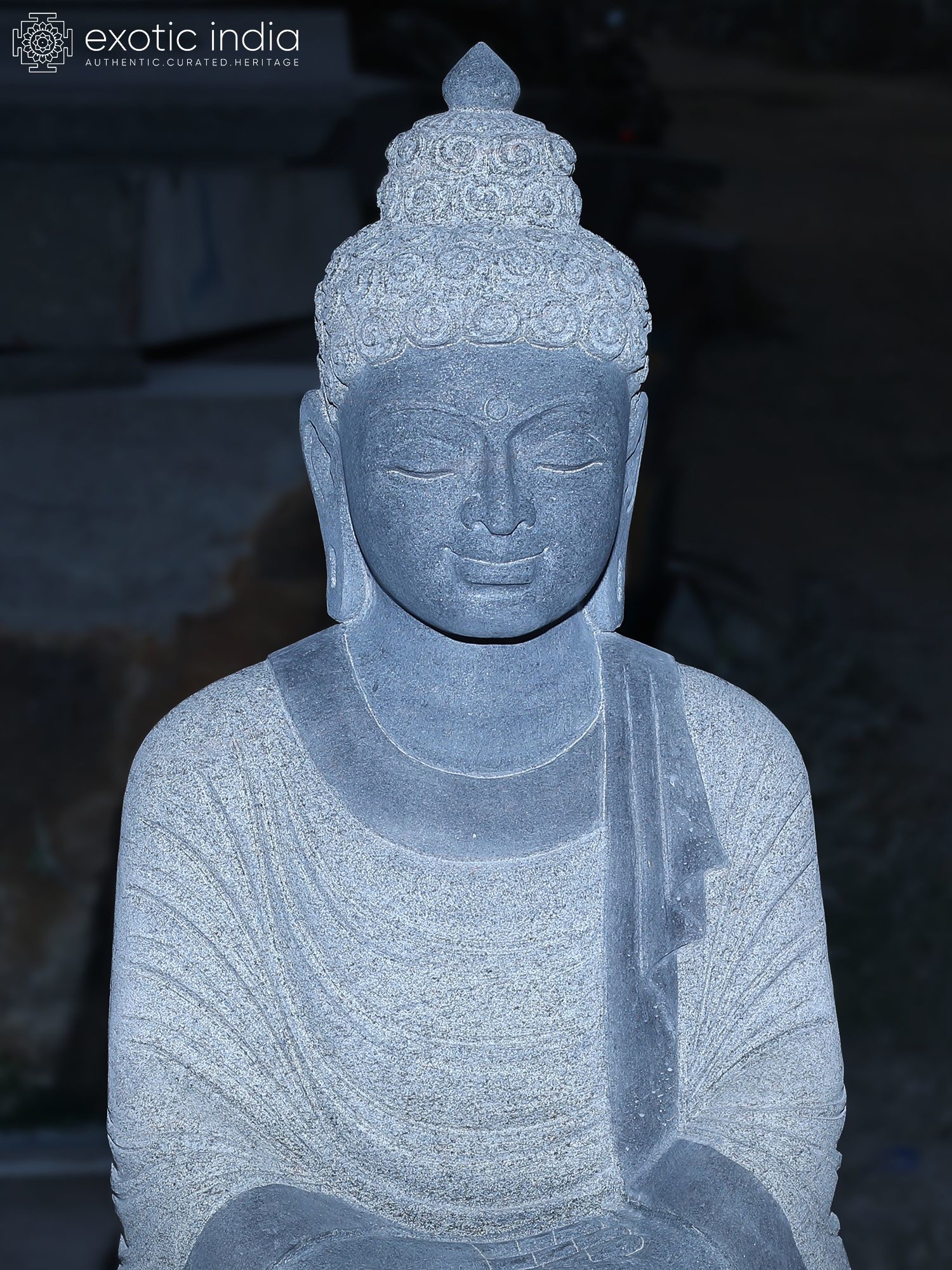 Detailed carving captures the serene expression and flowing robes of the Buddha.