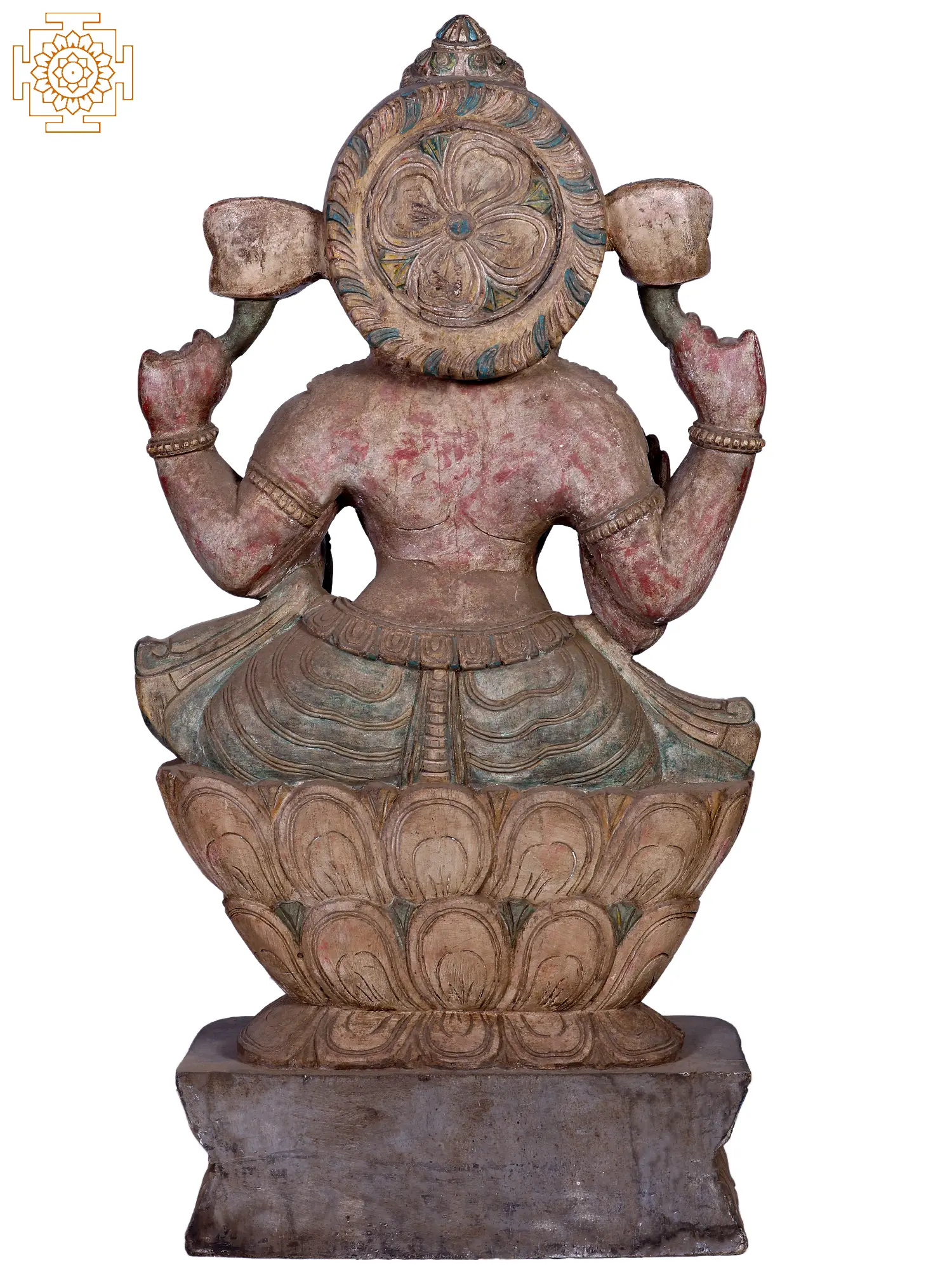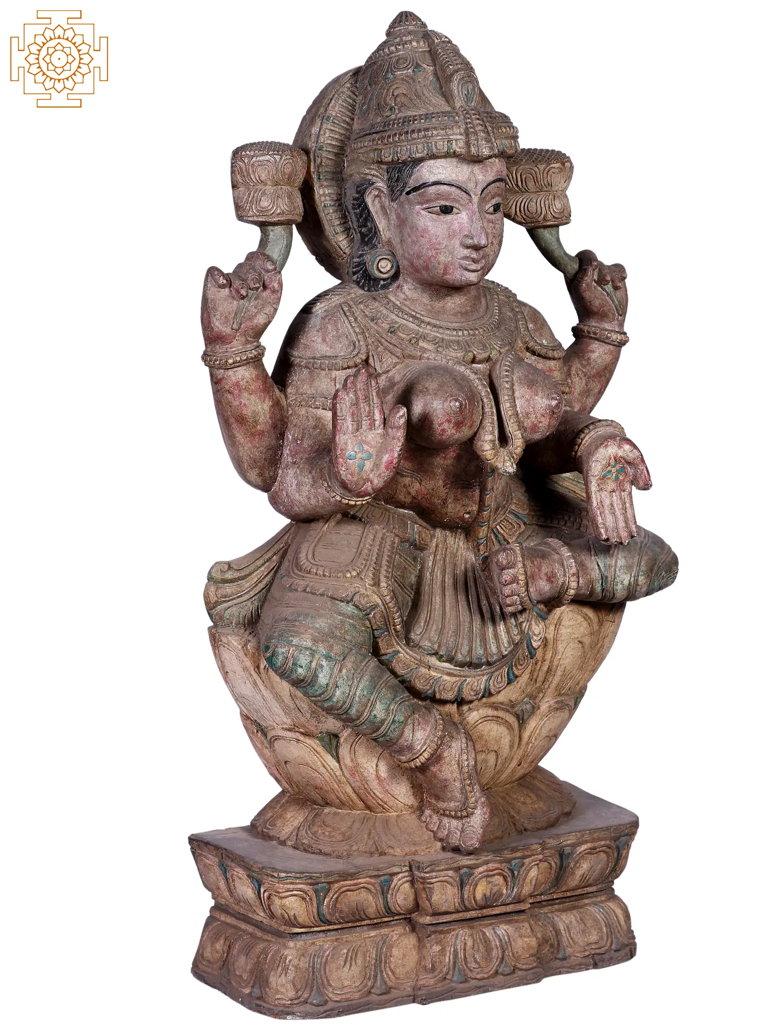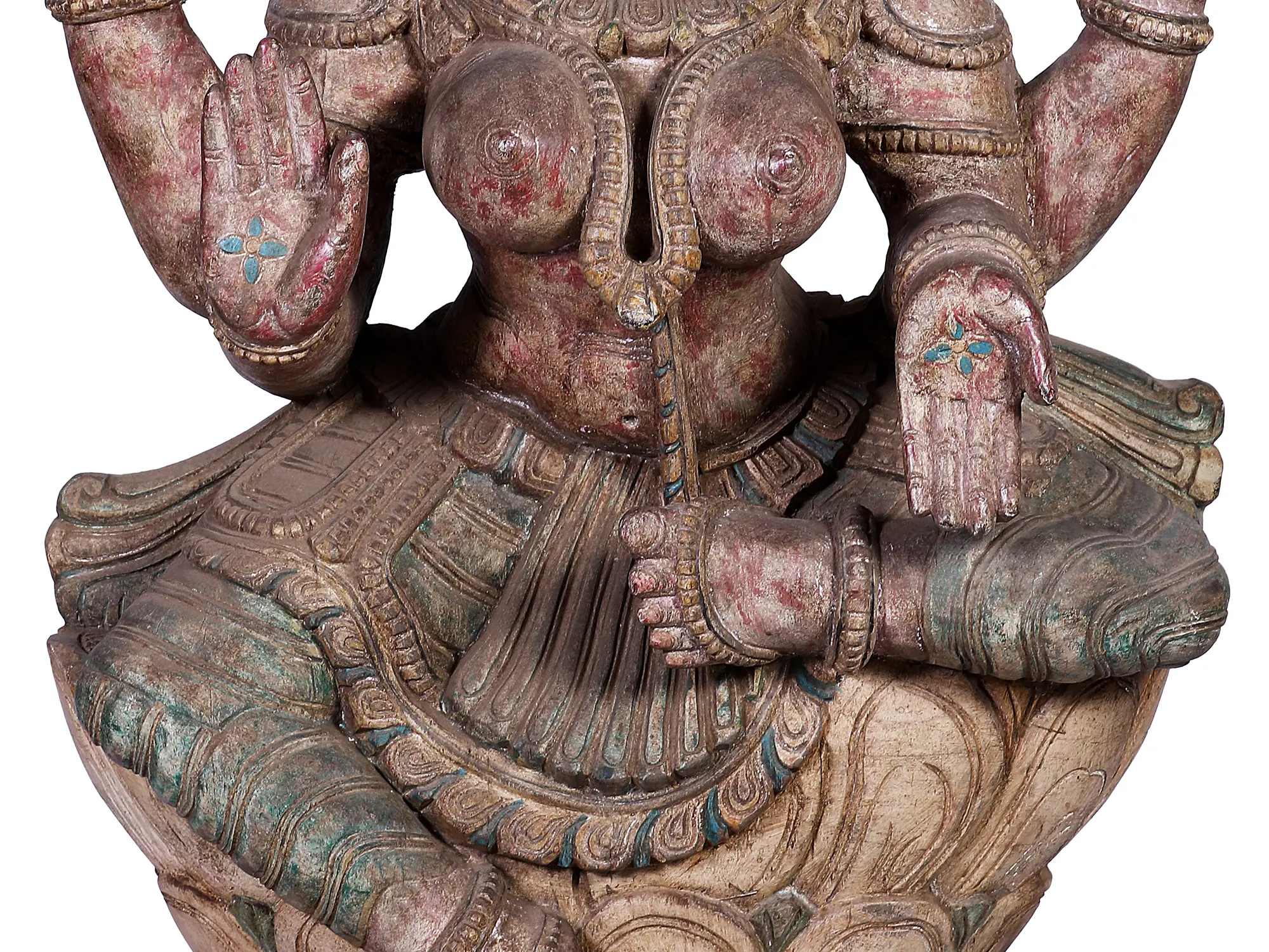 The Lakshmi murti that you see on this page is a wood-carved sculpture. In terms of aesthetics, it draws heavily from the temple architecture of ancient South India. Sculpted in almost symmetrical detail, but for the distinguished mudras of Her anterior hands and the lalitasana of Her limbs.