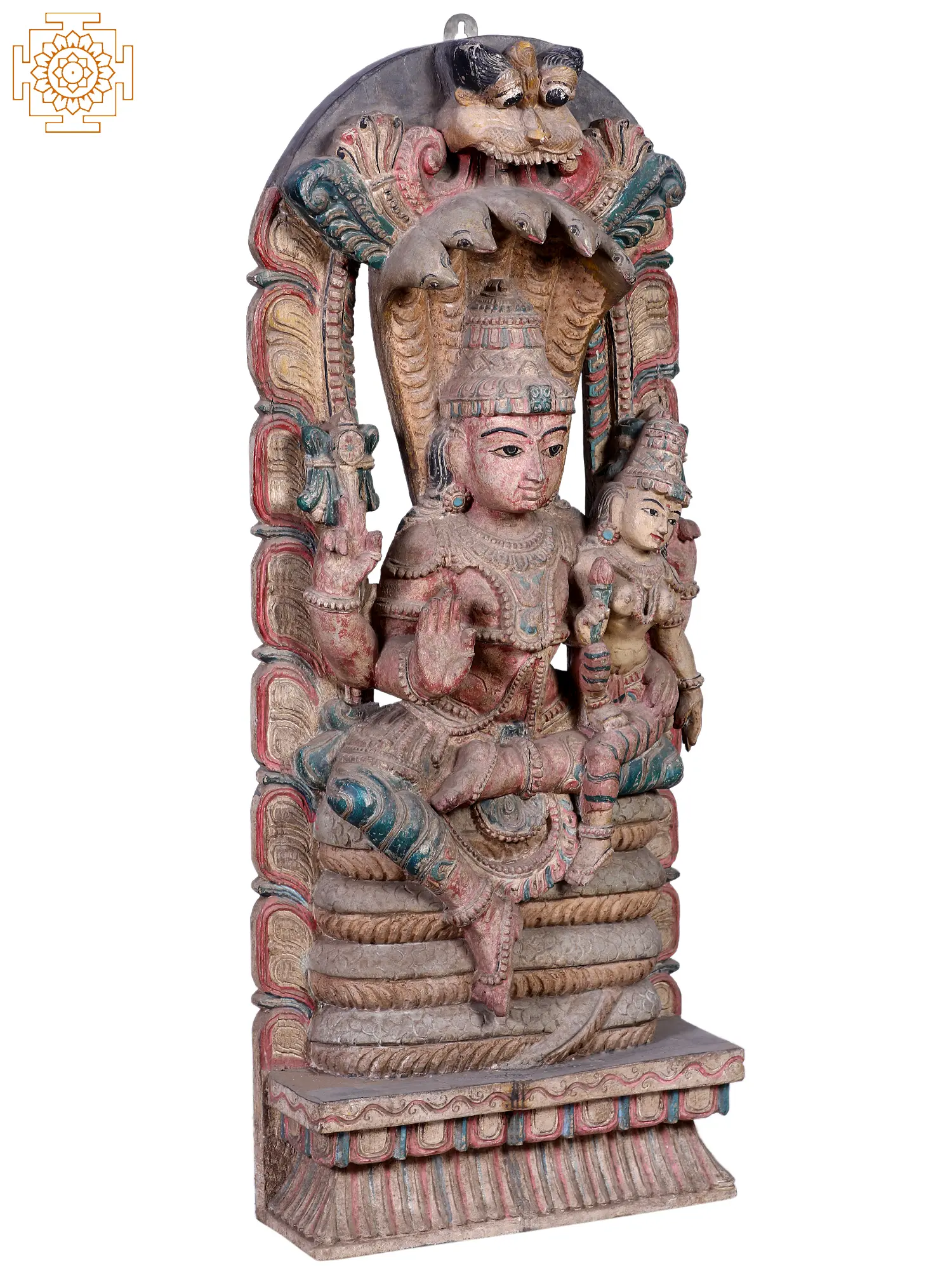 This magnificent wooden sculpture captures a profound moment of divine repose and abundance, depicting Lord Vishnu seated alongside his consort, Devi Lakshmi, upon the coils of Sheshnag, the celestial serpent. Handcrafted from wood, this piece exudes a sense of timeless tradition and spiritual significance, making it a captivating centerpiece for any devotional space or art collection. The central figure of Lord Vishnu, the preserver and protector of the universe in Hinduism, is rendered with serene majesty. His posture is one of calm authority, embodying his role as the supreme being who maintains cosmic order. He is often depicted with four arms, each holding a divine object symbolizing his power and responsibilities. This sculpture invites contemplation of Vishnu's manifold avatars and his eternal presence throughout existence. Beside him sits Devi Lakshmi, the goddess of wealth, fortune, and prosperity. Her presence signifies the blessings and material well-being that flow from the divine grace of Vishnu. The gentle portrayal of Lakshmi highlights her nurturing and benevolent nature, embodying the auspiciousness that complements Vishnu's cosmic responsibilities. Together, they represent the harmonious balance of divine power and material prosperity. The foundation of their divine seating is the mighty Sheshnag, also known as Ananta Shesha. In Hindu cosmology, Sheshnag is the king of all nagas and is often depicted as a cosmic serpent with multiple heads, upon whose coils Lord Vishnu rests and meditates in the cosmic ocean. Sheshnag represents eternity, the boundless, and the primordial foundation upon which the universe unfolds. The artist's skill in carving the serpent's intricate coils, with its protective hoods arching over the divine couple, speaks volumes about the reverence associated with this divine serpent. The serpentine form symbolizes cyclical time and the endless cosmic dance of creation, preservation, and destruction. The intricate detailing and weathered patina of the wood lend a sense of antiquity and depth to the sculpture. The colors, though subtle, add to the sacred aura of the piece, hinting at the vibrant traditions from which it originates. This artwork is not merely a decorative item; it is a conduit to the rich tapestry of Hindu mythology, inviting viewers to connect with the stories and philosophies that have shaped cultures for millennia. It is a testament to the enduring power of faith and the artistic traditions that seek to capture the divine in tangible form.