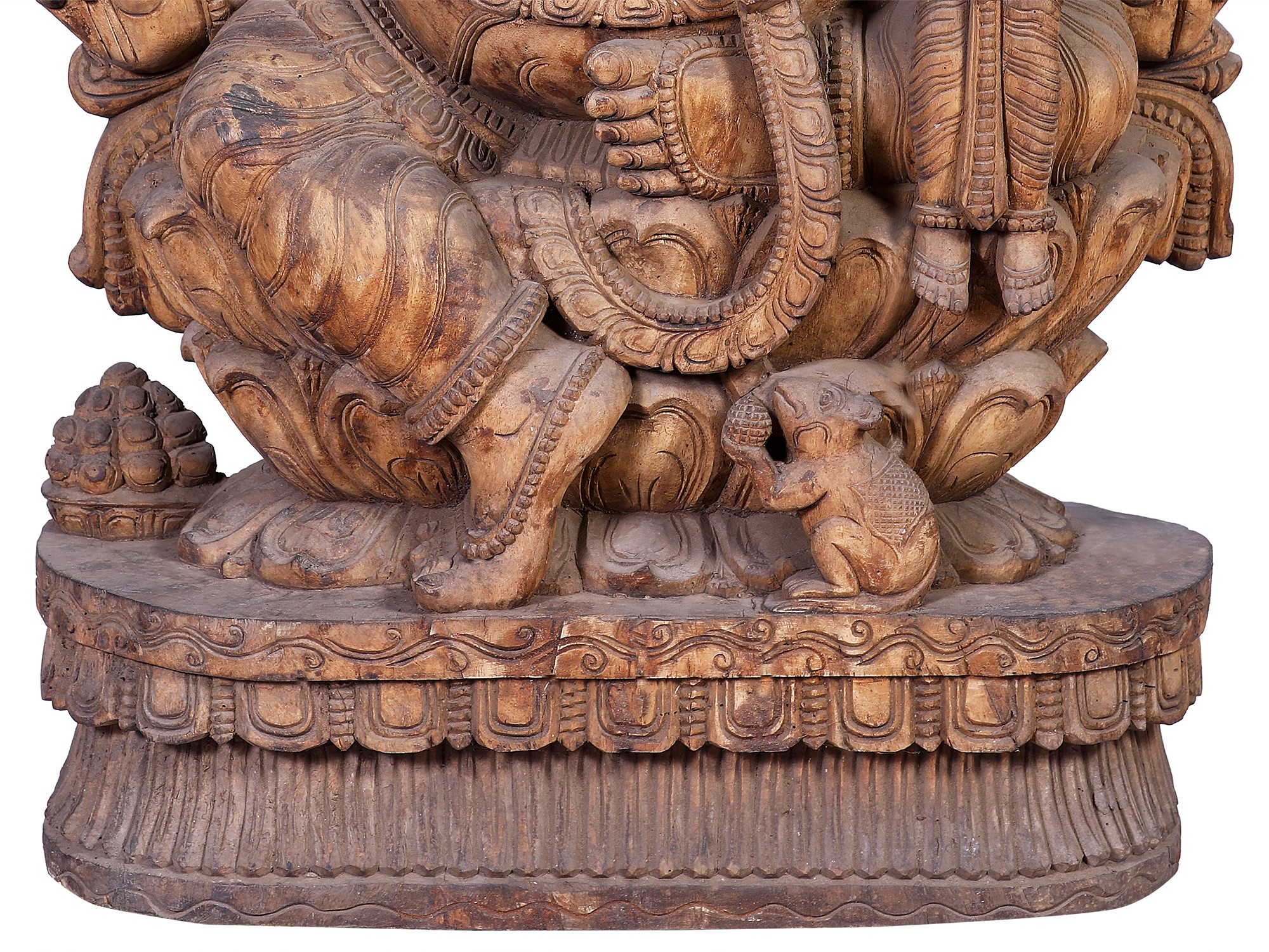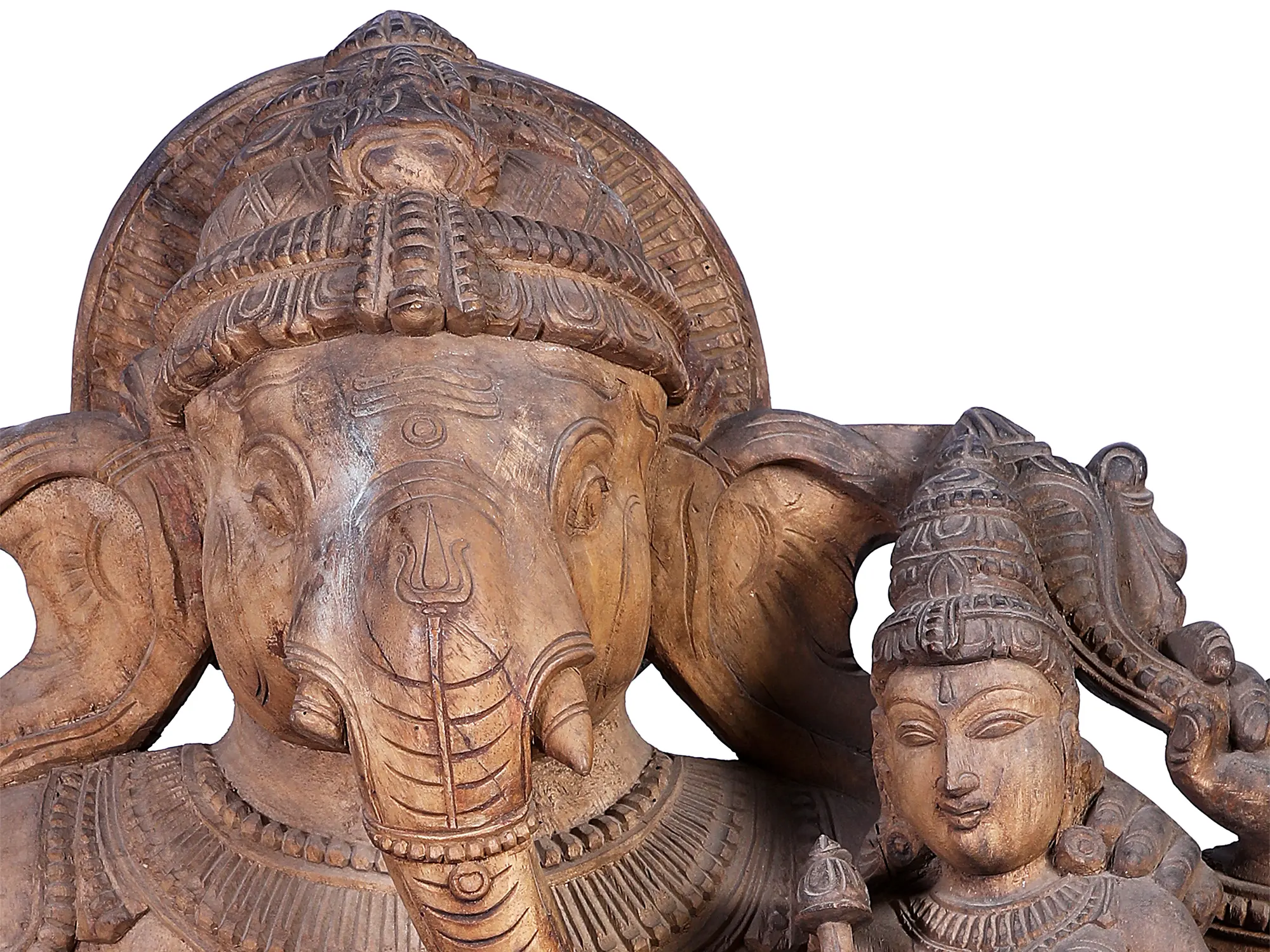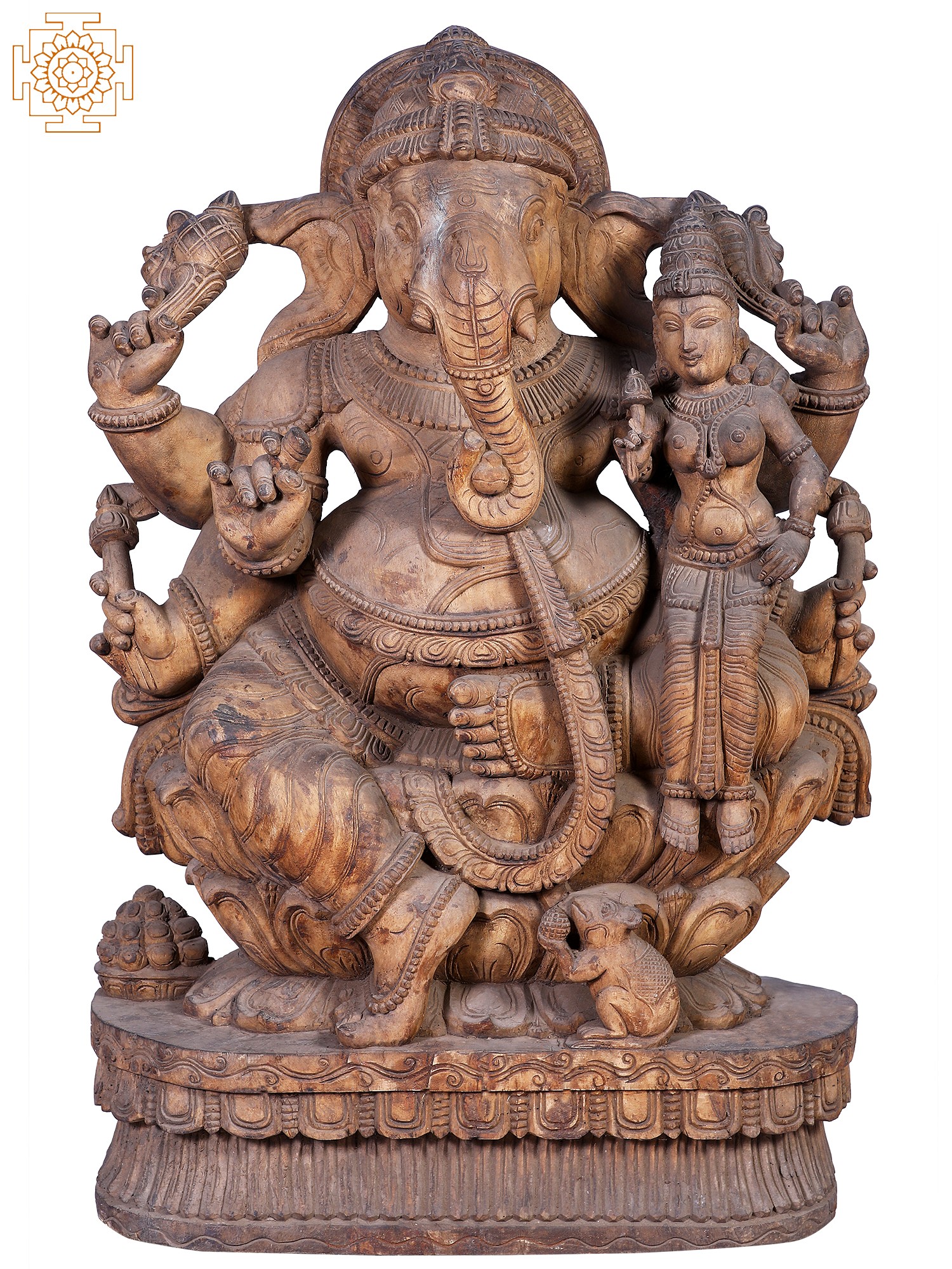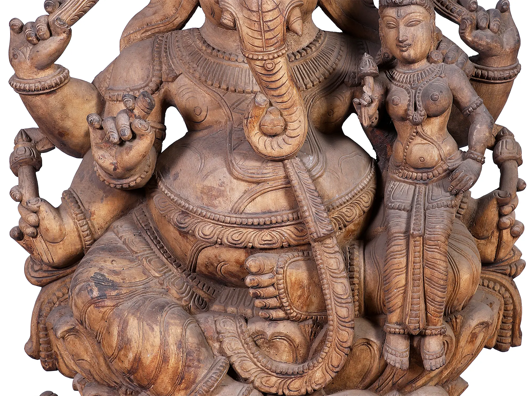 Lord Ganpati's iconography is rich with symbolism. His elephant head signifies wisdom, intelligence, and strength. The broken tusk represents sacrifice and the ability to overcome any challenge, a testament to his role as the Vighnaharta, the remover of obstacles. In many narratives, it is recounted that he broke his own tusk to write the epic Mahabharata, dictated by the sage Vyasa. His large belly symbolizes contentment and the ability to digest all experiences, both good and bad. He is often shown with his vehicle, the mouse (Mushika), which represents control over desires and the overcoming of ego. The presence of a female deity beside him, often representing his consort Siddhi (accomplishment) or Buddhi (intellect), further emphasizes his divine virtues and the abundance he bestows. This particular carving, with its intricate details, speaks volumes about the deep-rooted cultural and mythological significance of Ganpati in Indian traditions, particularly in the South where such elaborate wooden carvings are highly prized.