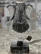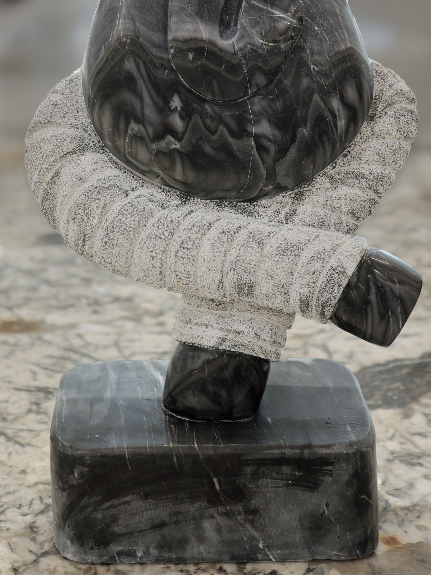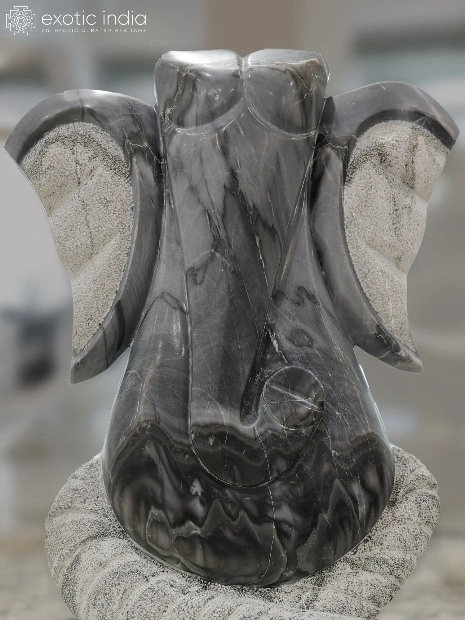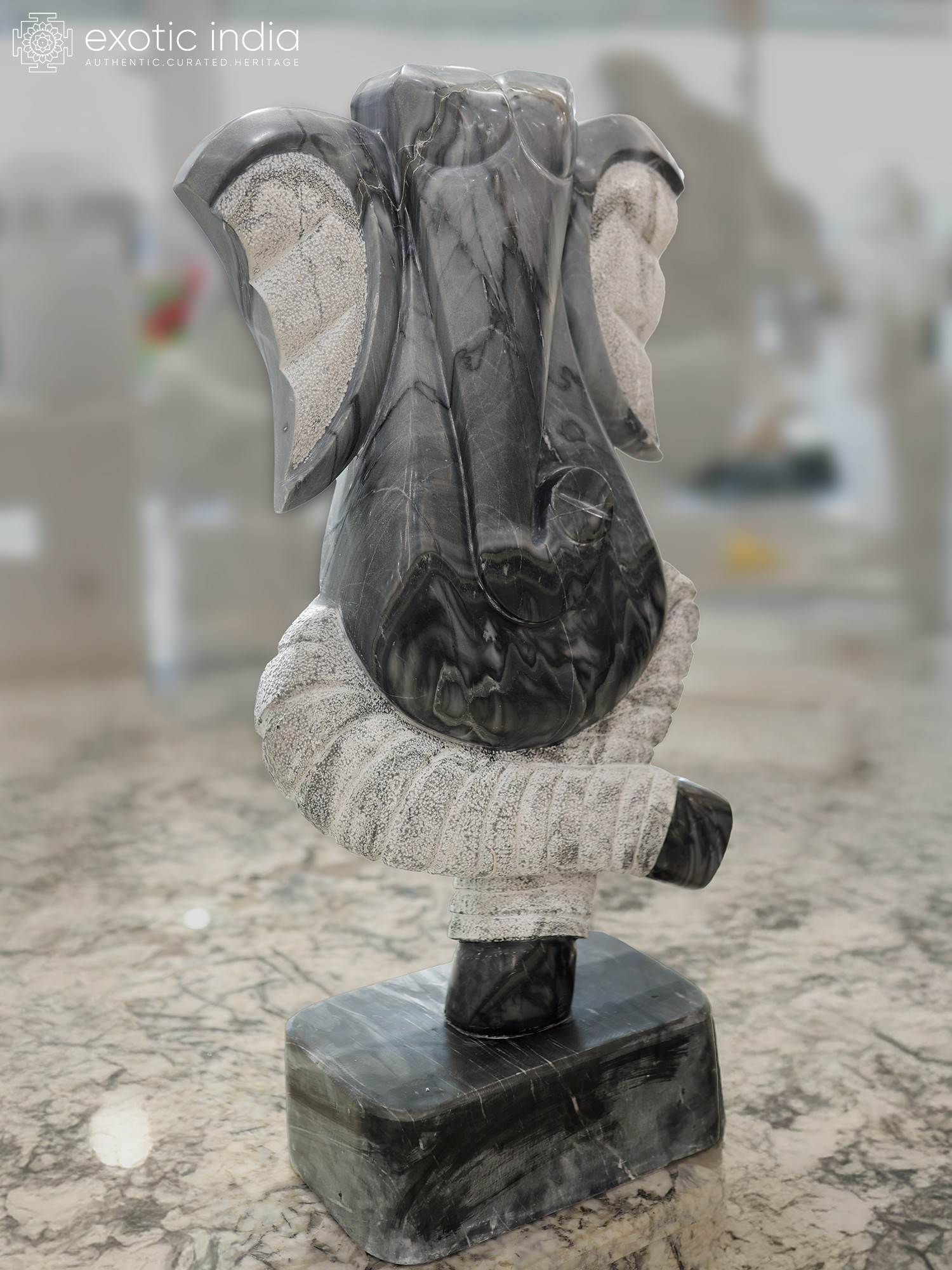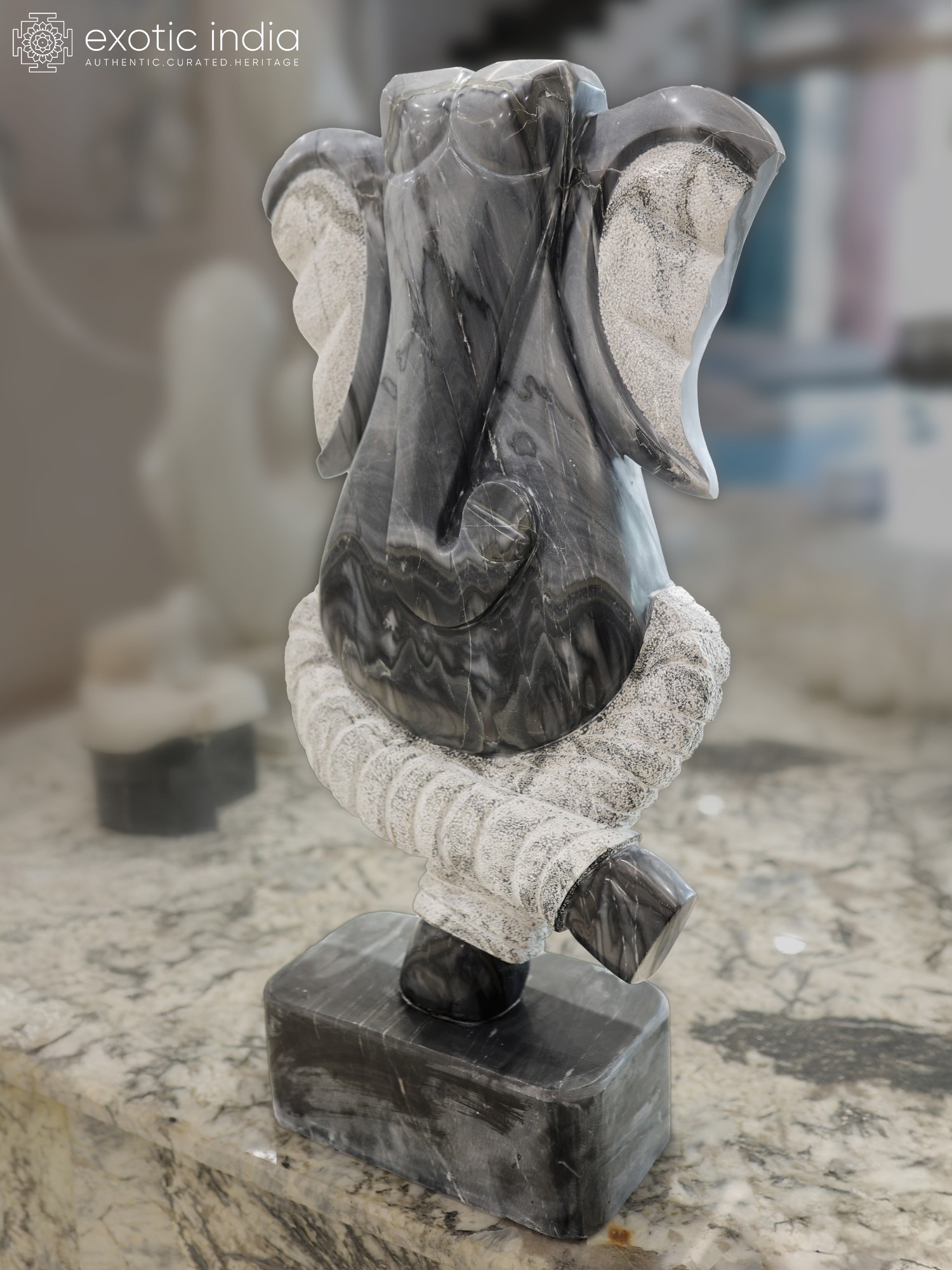 This magnificent sculpture captures the joyous spirit of Lord Ganesha, the beloved elephant-headed deity, in a dynamic pose of divine dance. Crafted from exquisite natural marble, the artwork embodies a modern artistic interpretation of this revered figure, bringing a touch of sacred elegance to any space. The cool, smooth texture of the marble, with its captivating veins and swirls of dark grey and white, lends an ethereal quality to the sculpture, hinting at the boundless cosmic energy that Ganesha represents.
