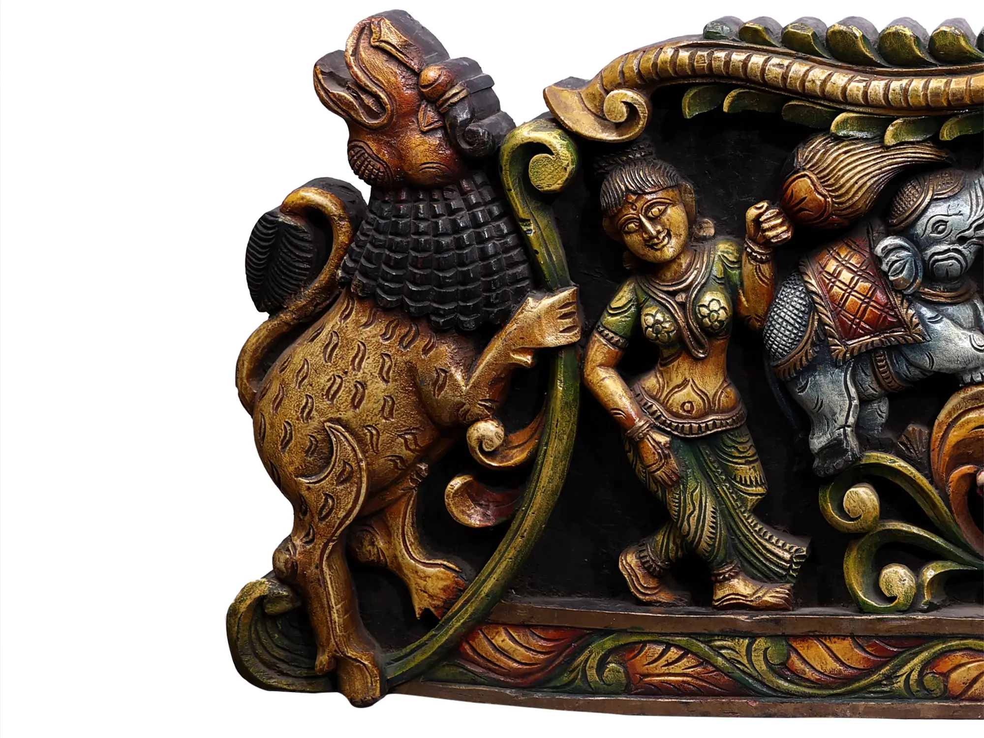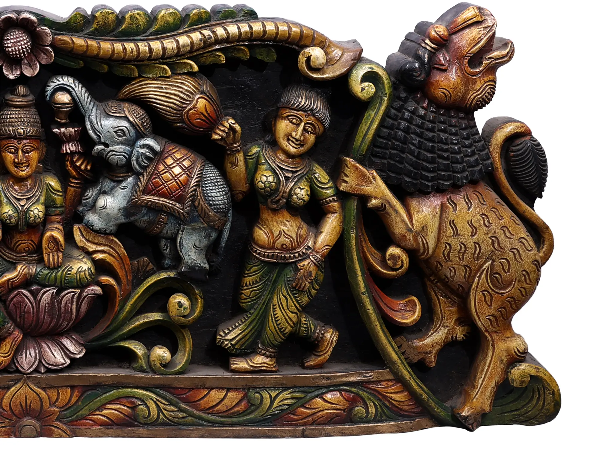 Lakshmi in Hindu traditions is often referred to as “Rajasri”- she is royal abundance and luxury personified. With her blessings, kings become sovereigns, and men and women fulfill auspicious tasks. In this wooden wall panel, the regalia of the goddess Lakshmi is celebrated artistically. At the heart of the woodwork is Padmasana Lakshmi, flanked by two elephants associated with her form as Gajalakshmi- an ancient aspect in which the goddess manifests the fertility of the earth and the elephants represent rain-filled clouds sprinkling it with water.