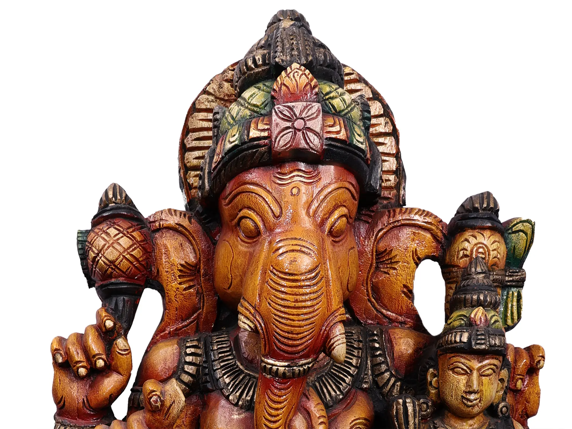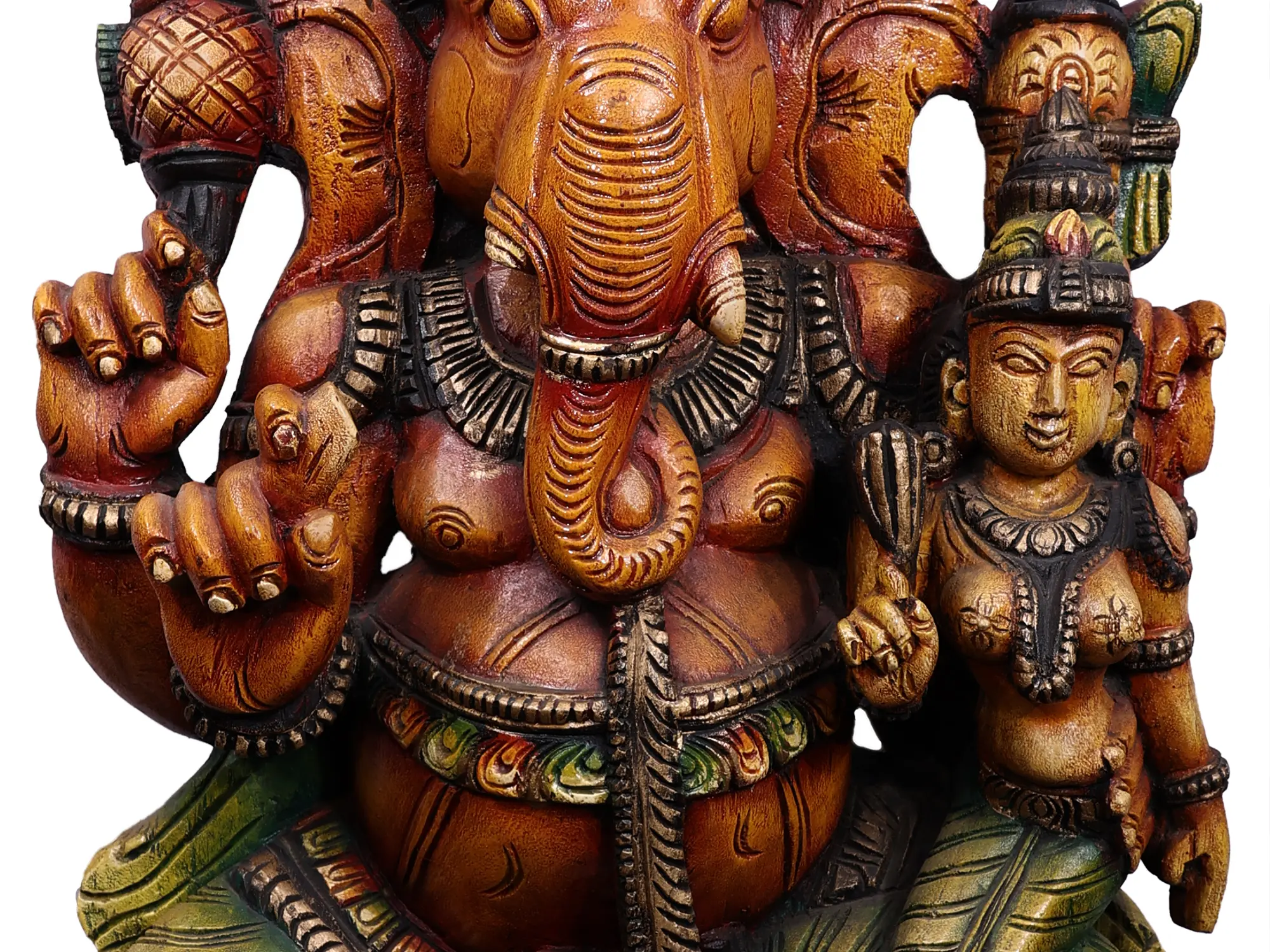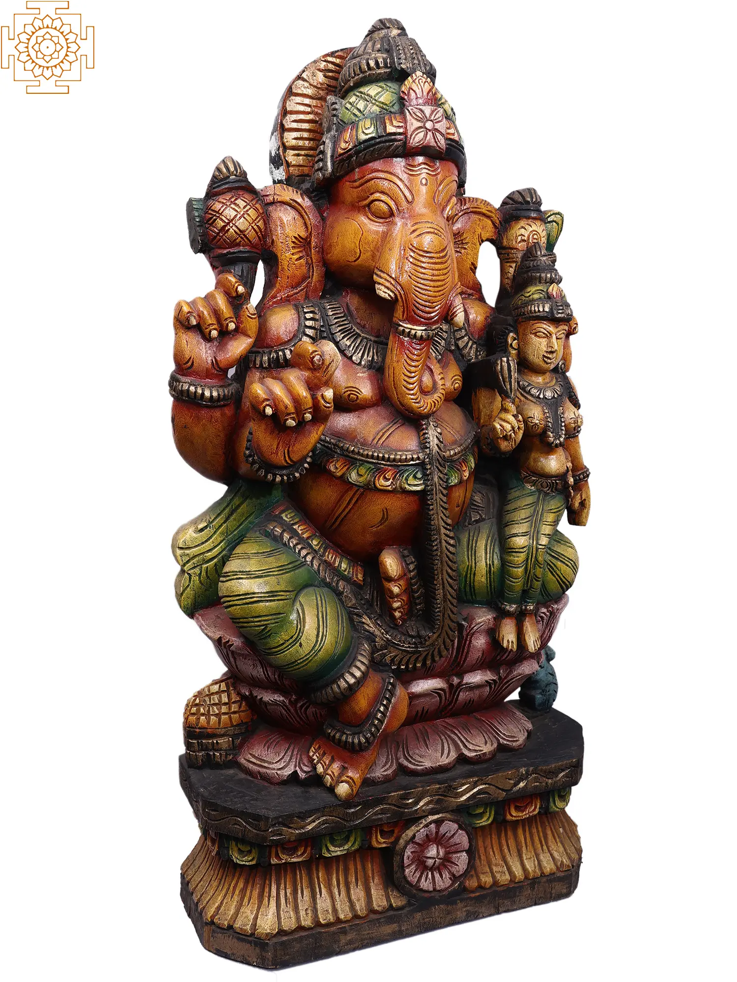 Welcome the divine presence of Lord Ganesha into your home with this magnificent wooden sculpture. Standing tall and commanding, this 37-inch representation is more than just a decorative piece; it is a conduit of blessings, wisdom, and prosperity. Carved from high-quality wood, the intricate details of this statue speak to the skill of the artisans who brought this sacred form to life. The rich, hand-painted finish accentuates every curve and contour, from Ganesha's characteristic large ears and gentle trunk to the serene expression on his face. The vibrant colors are carefully applied, creating a lively yet reverent aura around the deity.