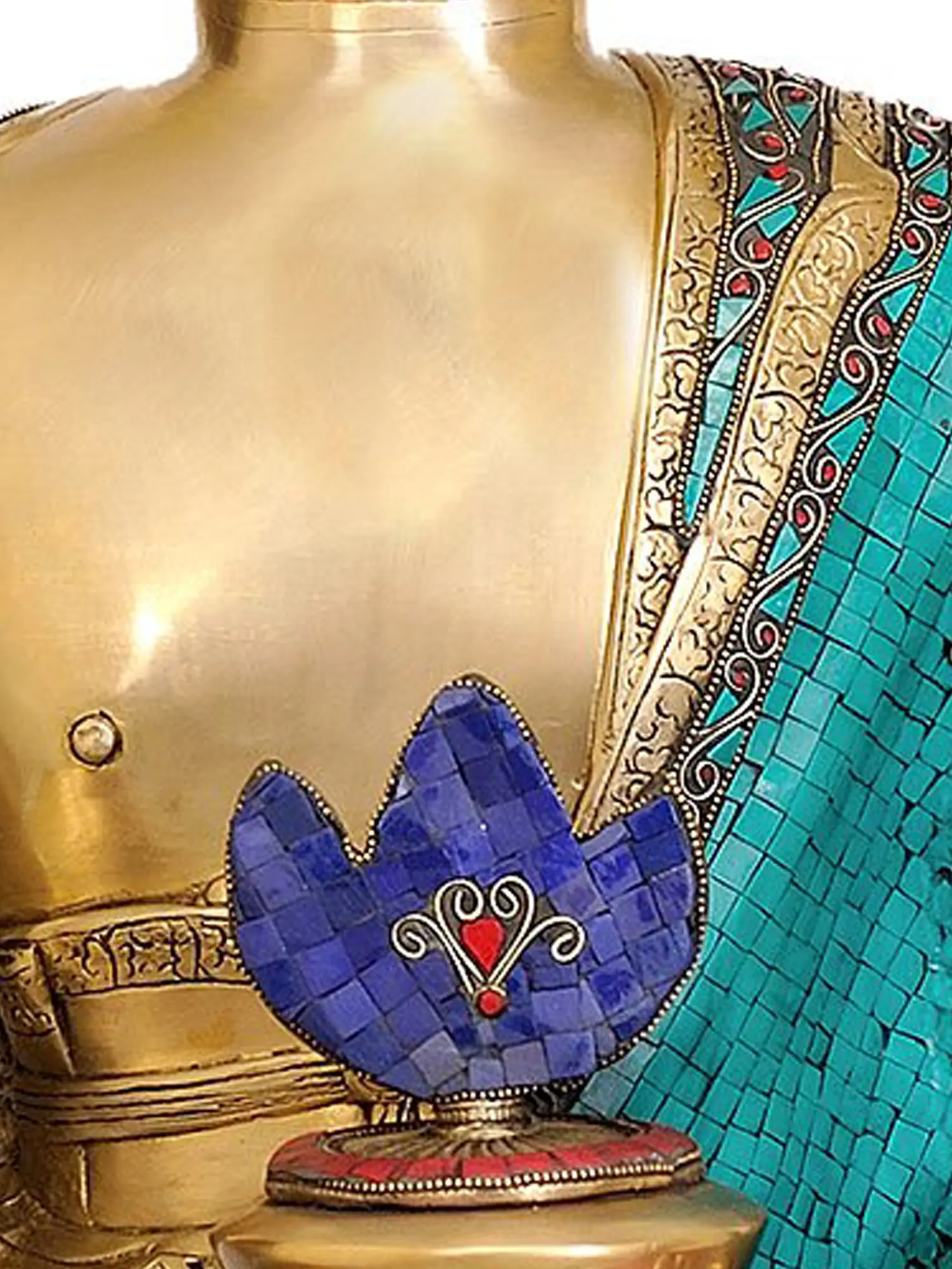 This large-sized representation of the Medicine Buddha is more than just a decorative piece; it is a sacred object designed to inspire devotion and facilitate spiritual practice. The lotus throne upon which he sits is a universal symbol of purity and enlightenment, representing the growth of the spirit from the mud of worldly existence to the radiant blossom of spiritual awakening. The intricate details of the lotus petals, also inlaid with vibrant stones, further enhance the divine aura of the sculpture. The presence of this statue in your home or meditation space can serve as a constant reminder of the path to healing, both for oneself and for others. It invokes the blessings of the Medicine Buddha, encouraging the cultivation of mindfulness, compassion, and the pursuit of spiritual well-being. This handmade masterpiece, born from the rich artistic traditions of India, is an heirloom-quality piece that carries with it the essence of centuries of spiritual wisdom and devotional craftsmanship.