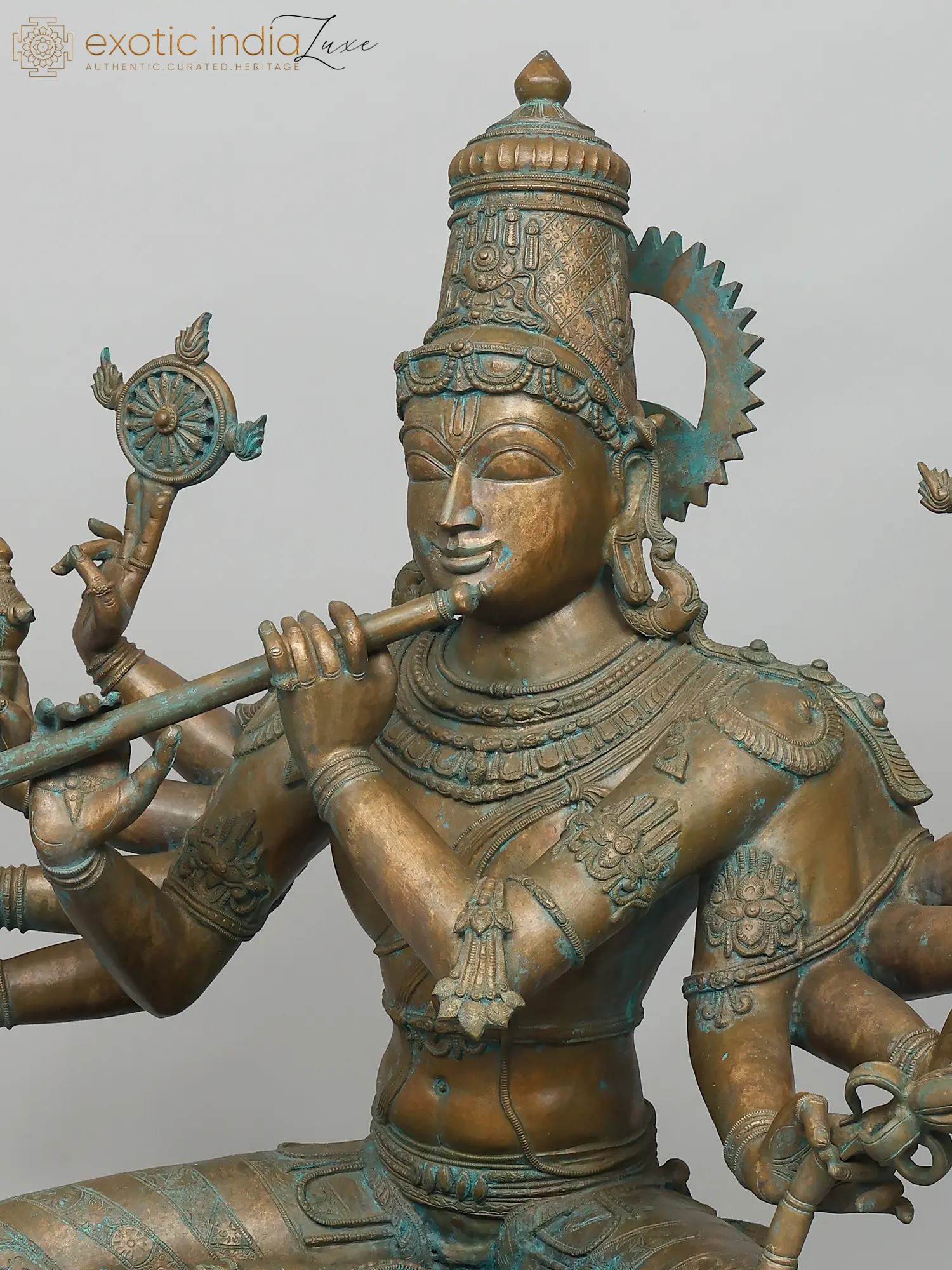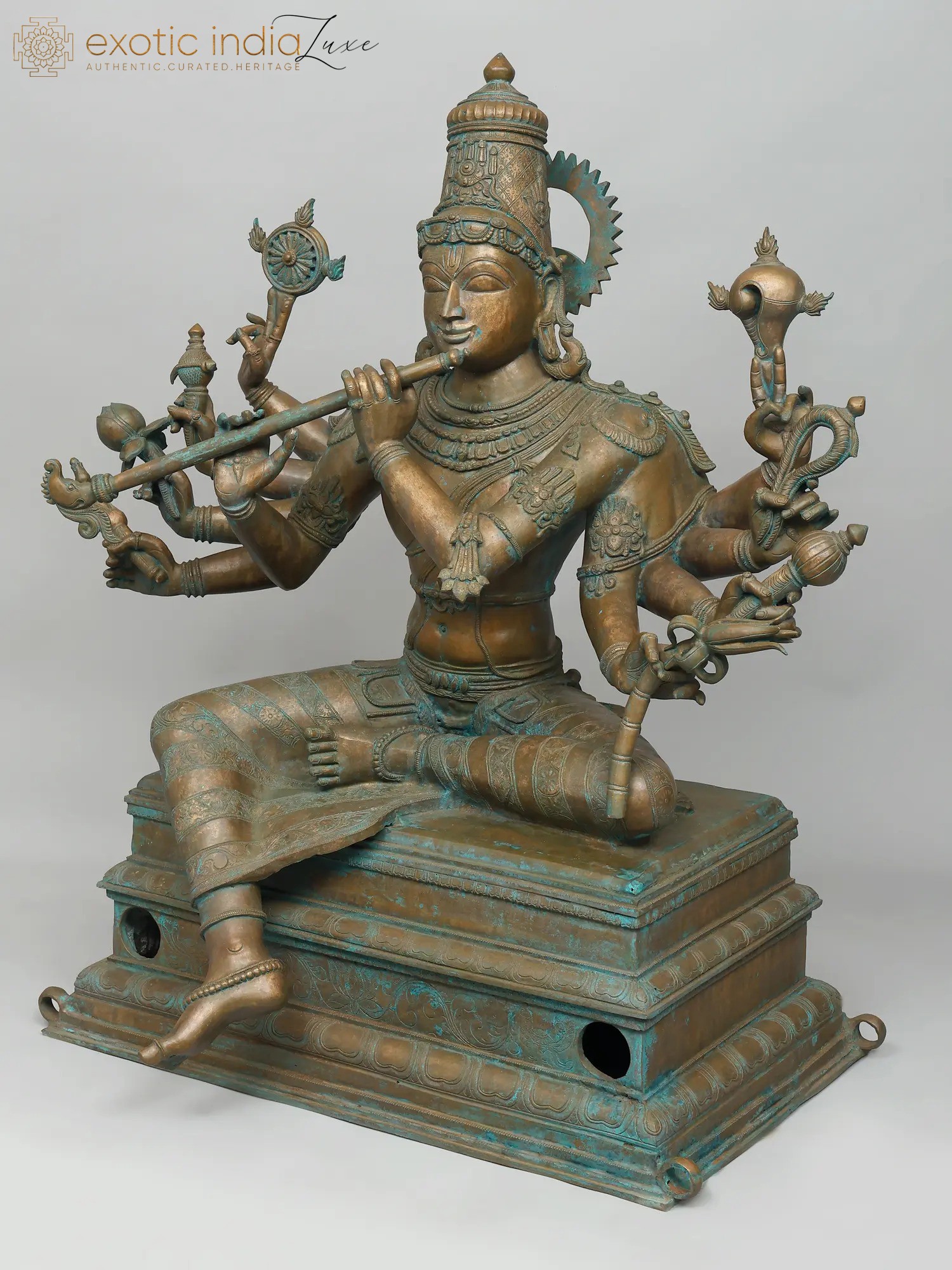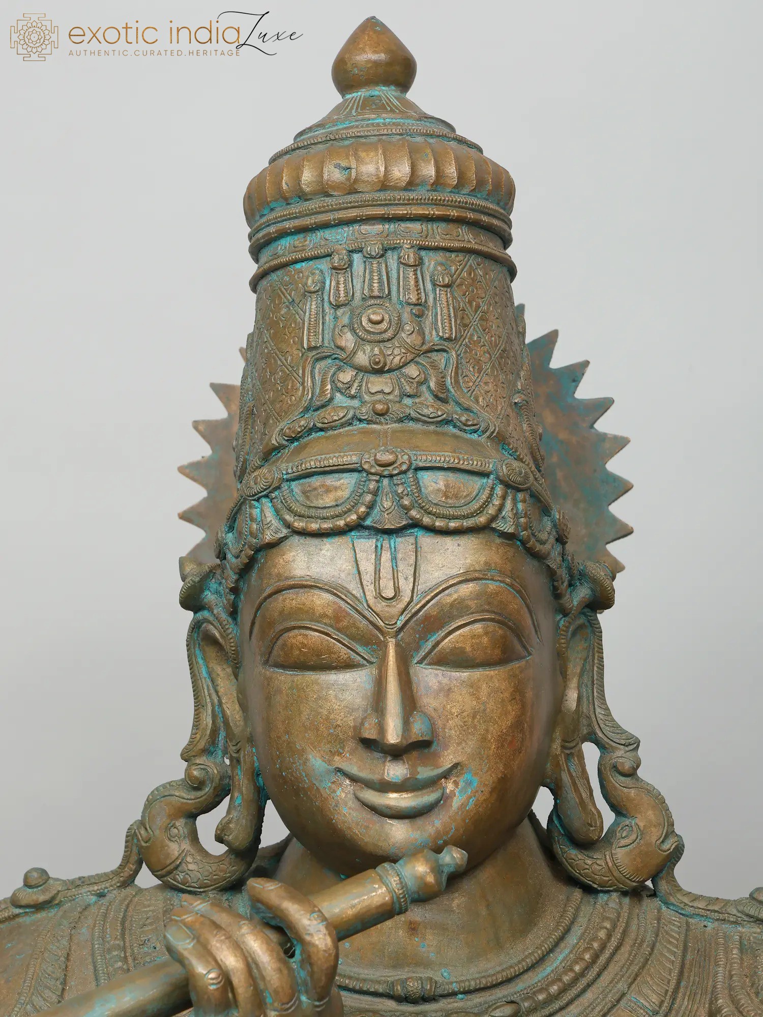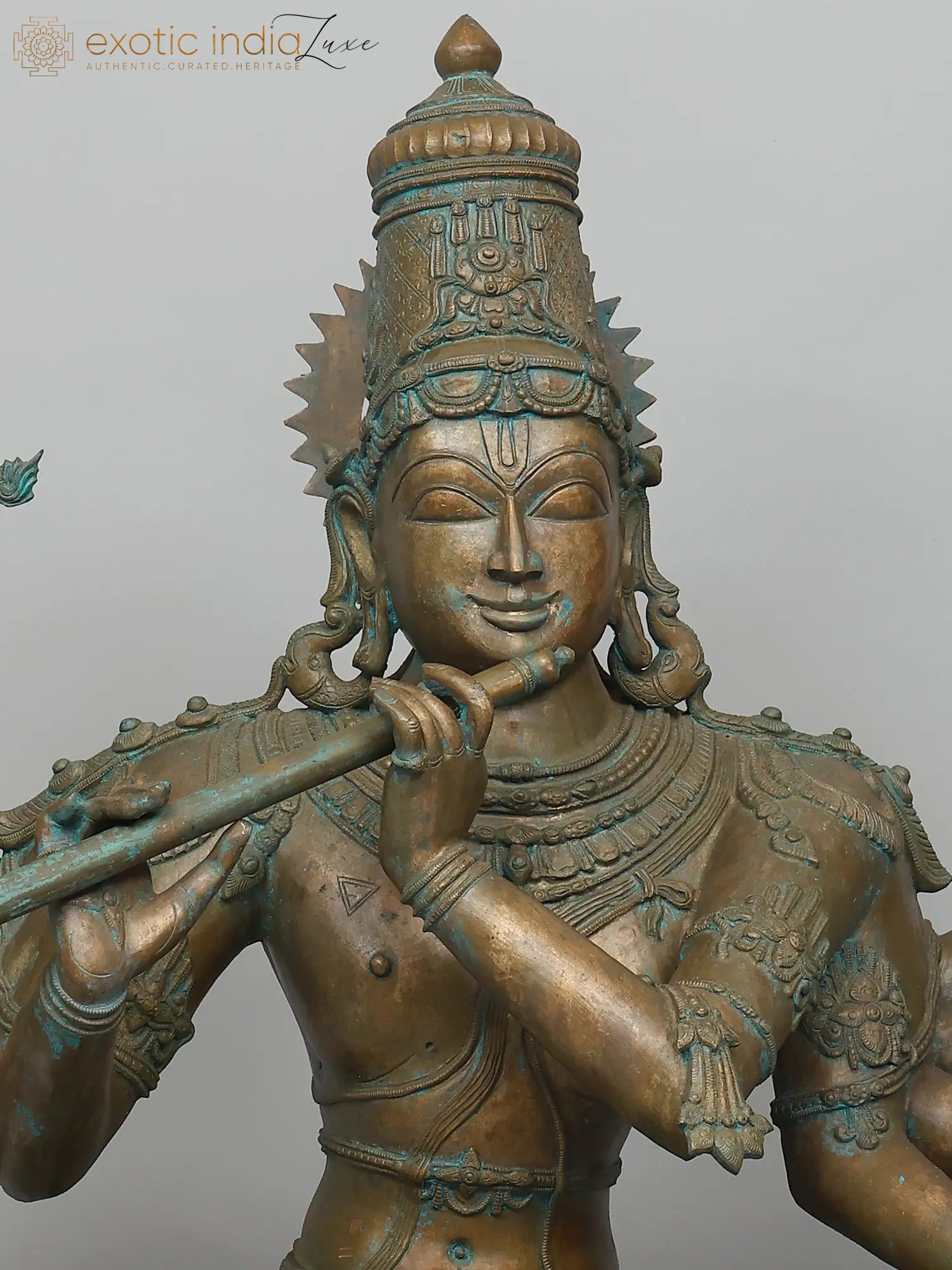 Behold a magnificent representation of Venugopala, a form of Lord Krishna revered for his captivating music and divine grace. This breathtaking bronze sculpture, crafted using the ancient Madhuchista Vidhana (lost-wax) technique, is a testament to the skill and devotion of artisans from Swamimalai, a town renowned for its unbroken lineage of bronze casting. Lord Krishna, in this manifestation, is not merely a deity, but a symbol of irresistible charm, cosmic harmony, and the power of divine love to enchant and transform the universe. His flute, the Venu, is an instrument of enchantment, its melodies said to hold the power to pacify the mind, attract all living beings, and even melt the hearts of the gods.