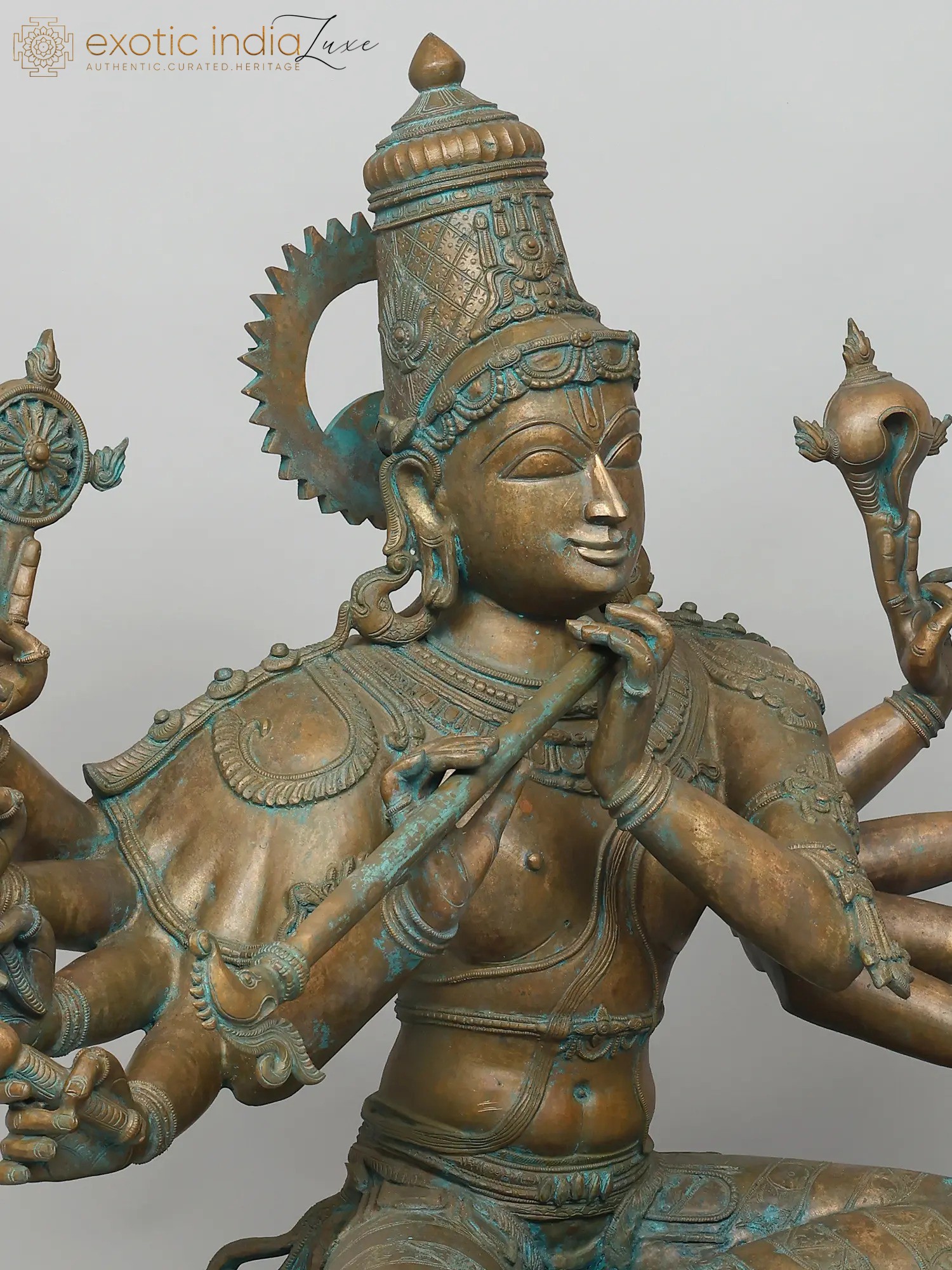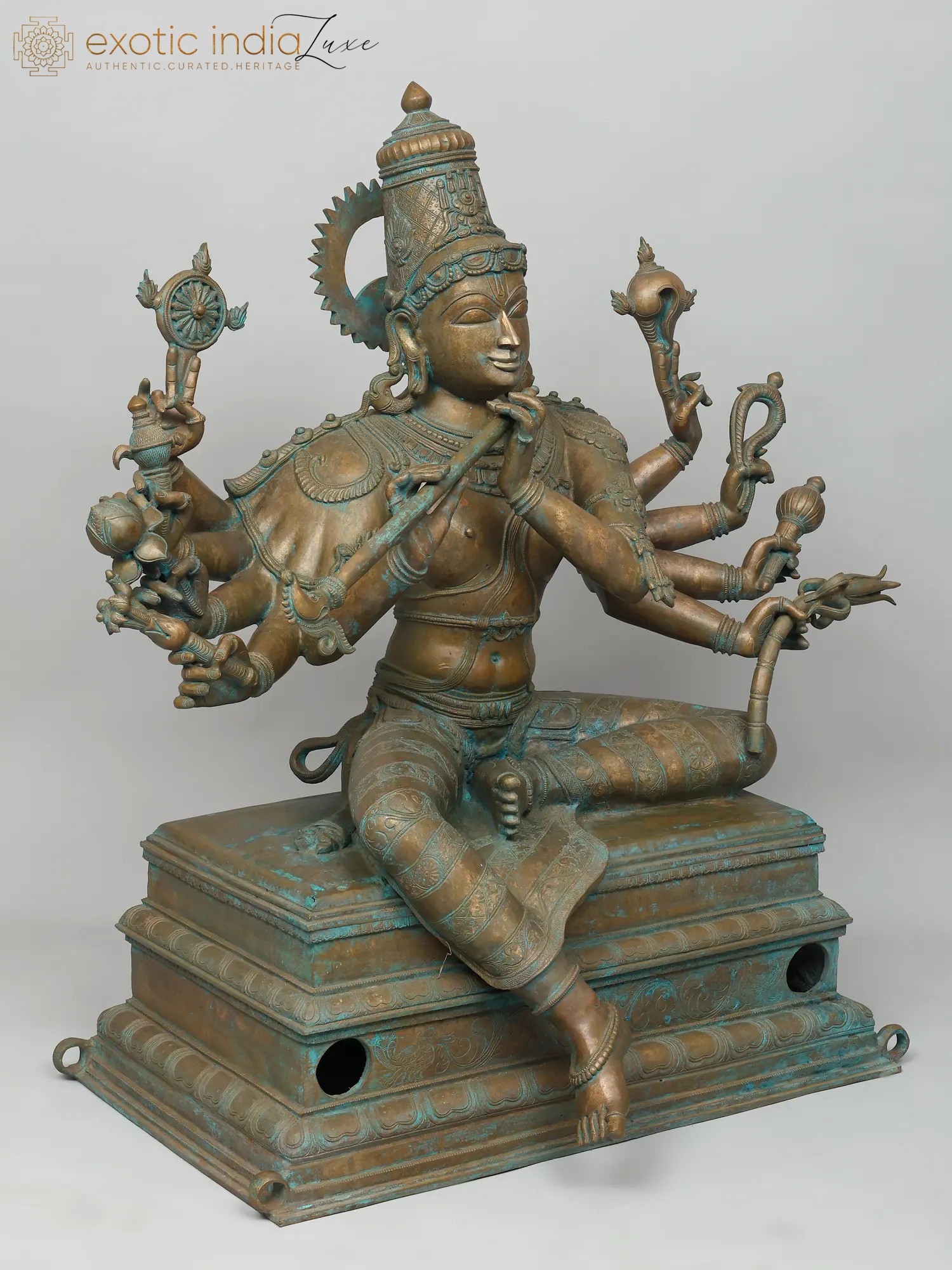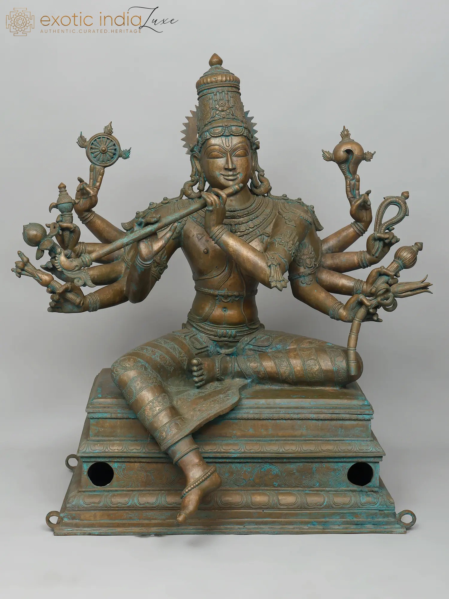 Behold a magnificent representation of Venugopala, a form of Lord Krishna revered for his captivating music and divine grace. This breathtaking bronze sculpture, crafted using the ancient Madhuchista Vidhana (lost-wax) technique, is a testament to the skill and devotion of artisans from Swamimalai, a town renowned for its unbroken lineage of bronze casting. Lord Krishna, in this manifestation, is not merely a deity, but a symbol of irresistible charm, cosmic harmony, and the power of divine love to enchant and transform the universe. His flute, the Venu, is an instrument of enchantment, its melodies said to hold the power to pacify the mind, attract all living beings, and even melt the hearts of the gods.