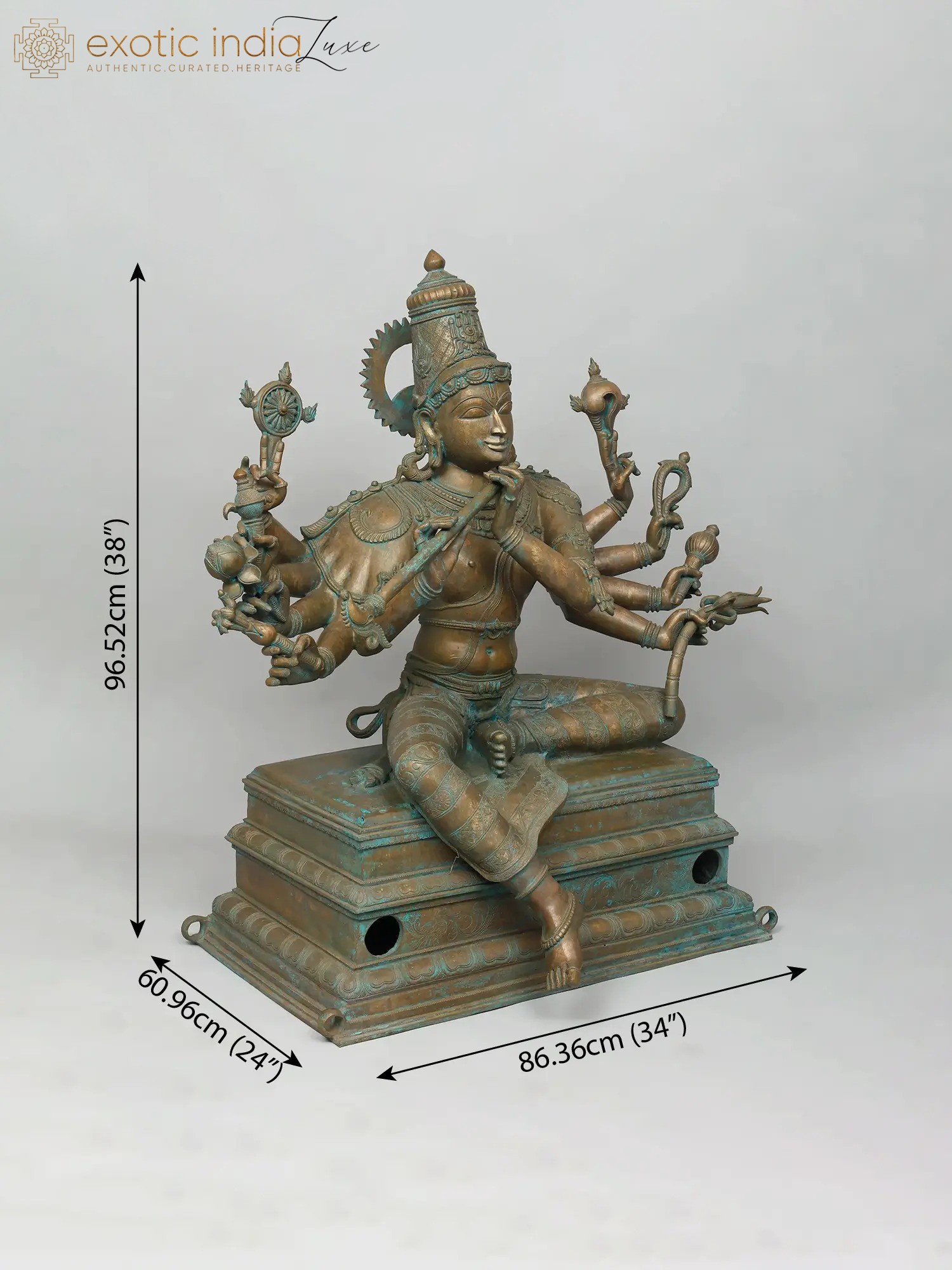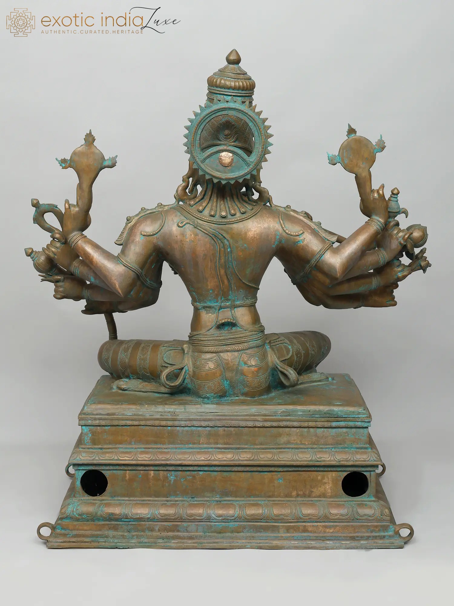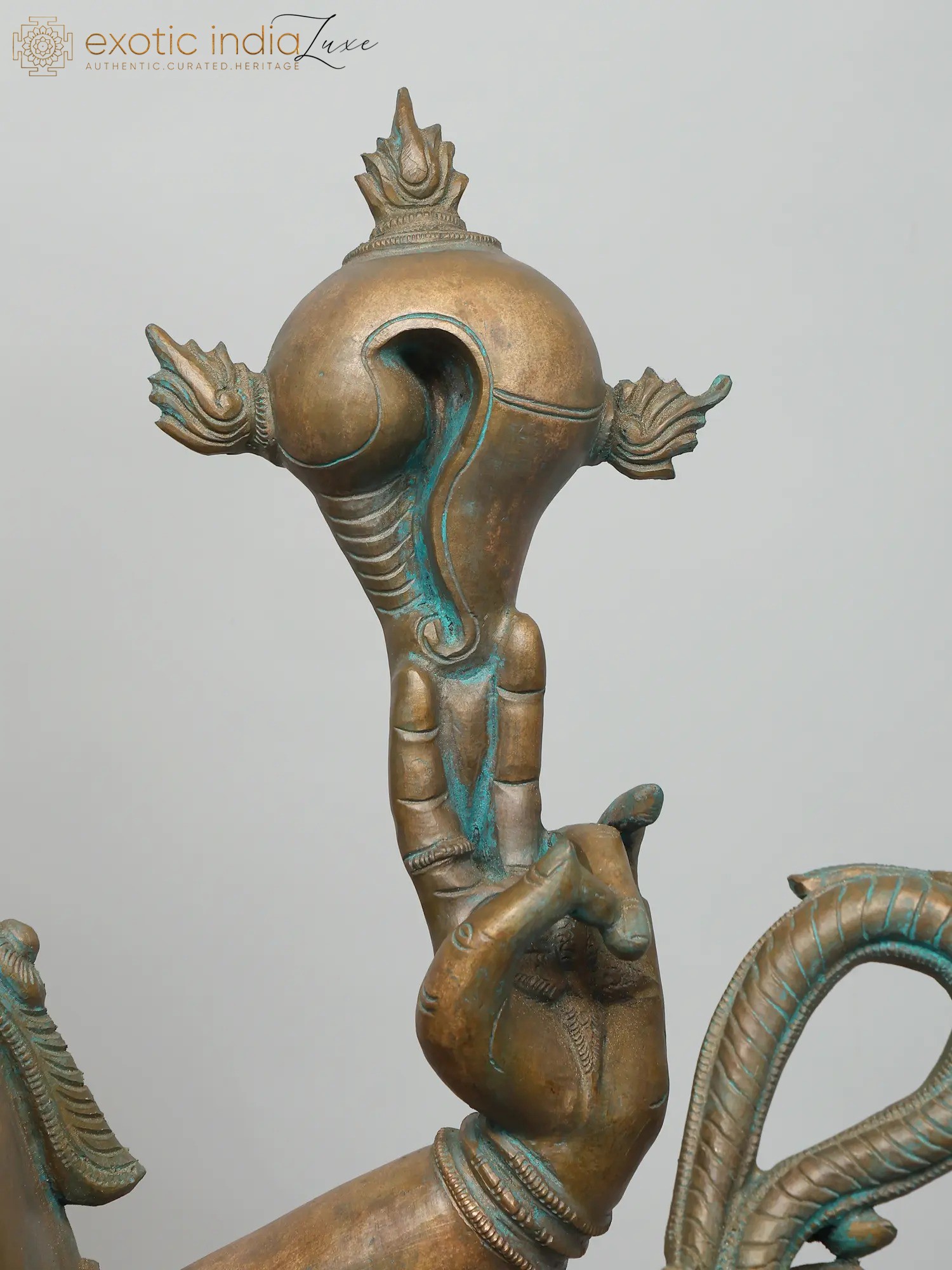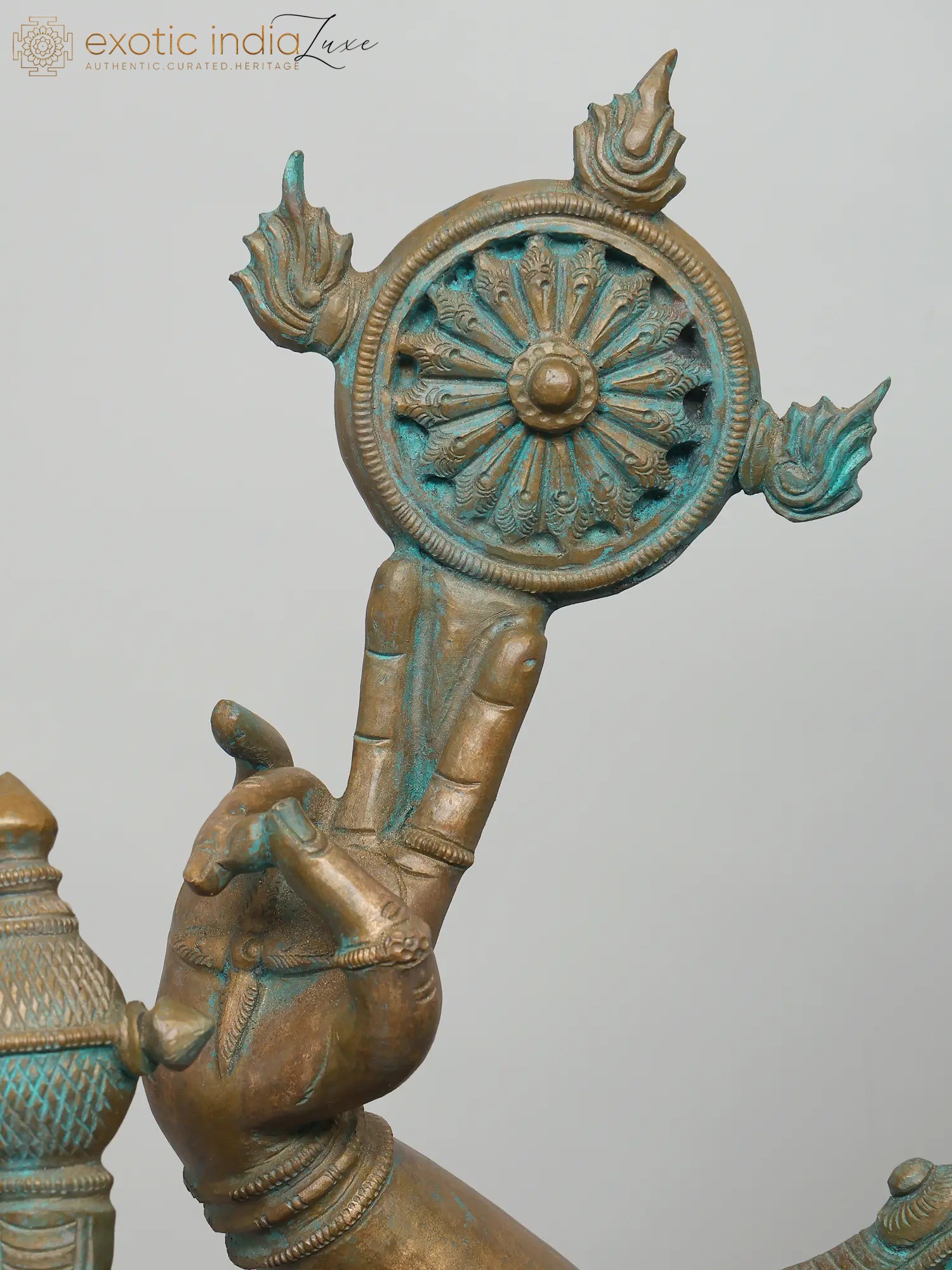 Behold a magnificent representation of Venugopala, a form of Lord Krishna revered for his captivating music and divine grace. This breathtaking bronze sculpture, crafted using the ancient Madhuchista Vidhana (lost-wax) technique, is a testament to the skill and devotion of artisans from Swamimalai, a town renowned for its unbroken lineage of bronze casting. Lord Krishna, in this manifestation, is not merely a deity, but a symbol of irresistible charm, cosmic harmony, and the power of divine love to enchant and transform the universe. His flute, the Venu, is an instrument of enchantment, its melodies said to hold the power to pacify the mind, attract all living beings, and even melt the hearts of the gods.