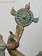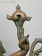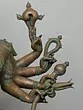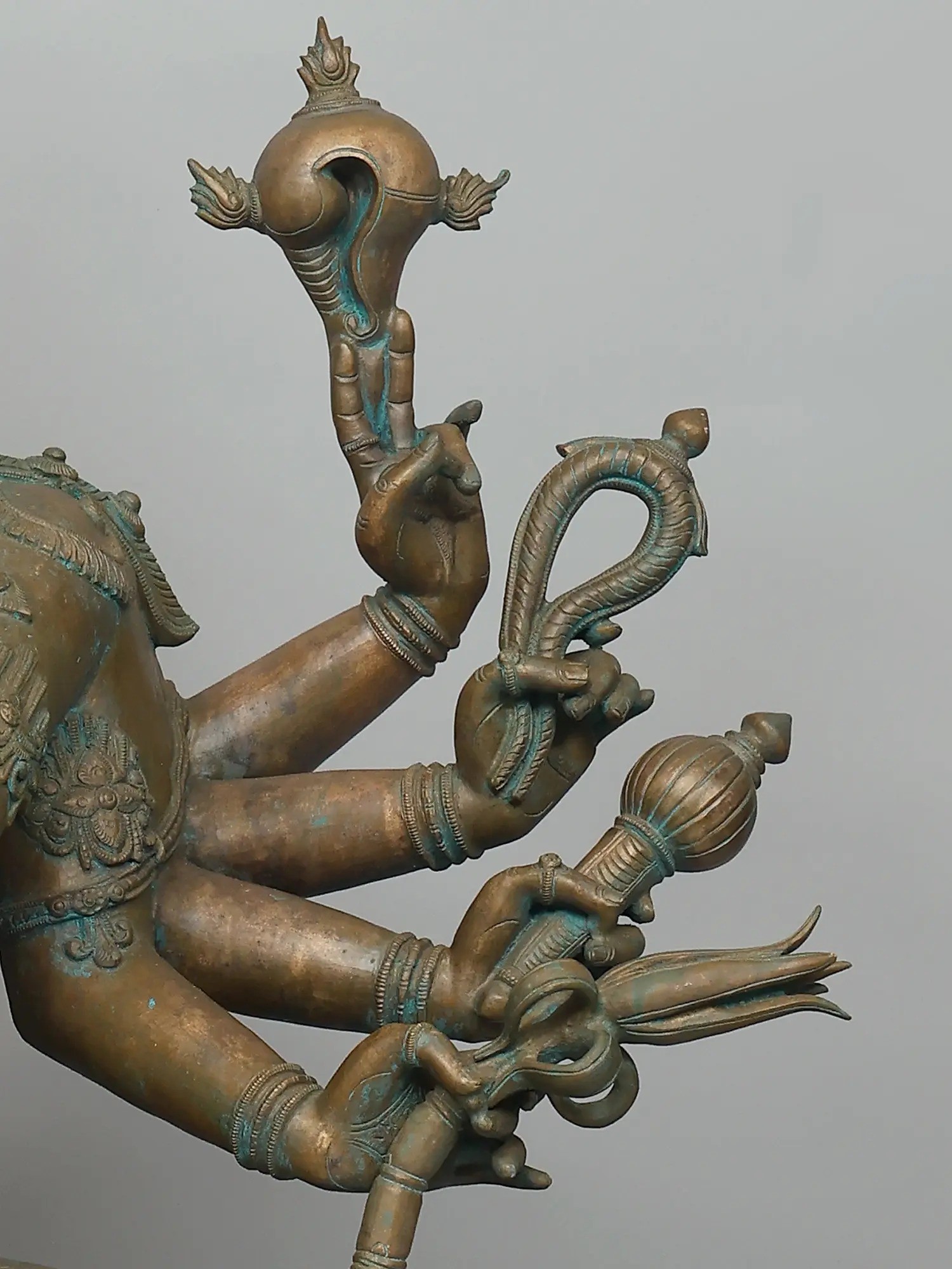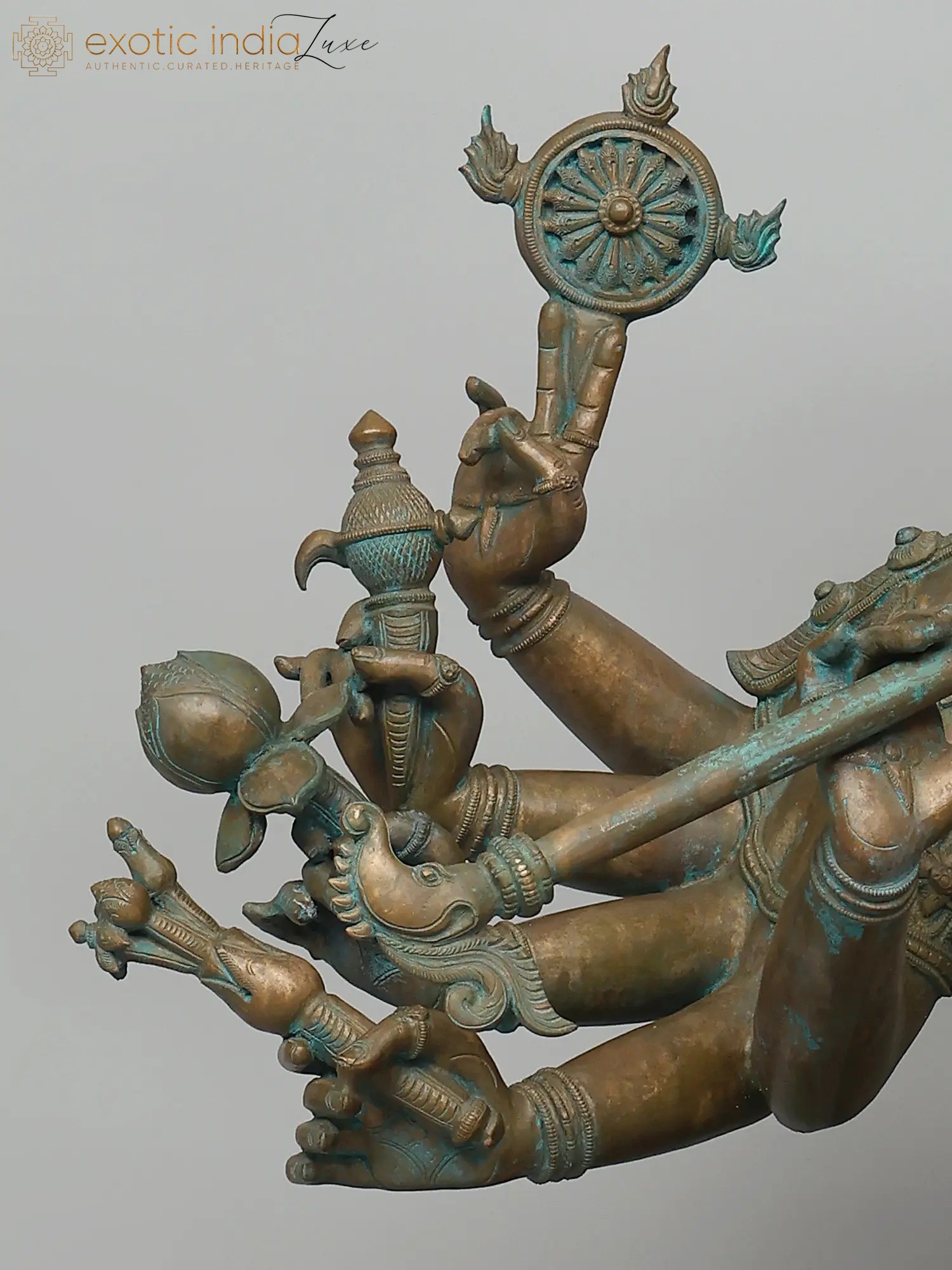 While the standard depiction of Venugopala features Krishna with two arms, this extraordinary sculpture showcases a rare and powerful form with ten arms. Each hand holds a sacred object, representing the multifaceted nature of Krishna's divine powers and blessings. The Chakra (discus), symbolizing the cosmic order and the destruction of evil; the Shankha (conch), whose resonant sound represents the primordial sound of creation; the Gada (mace), a symbol of power and authority; and the Padma (lotus), a representation of purity, spiritual awakening, and divine beauty, are just a few of the attributes held by this magnificent form. Each implement, meticulously crafted and placed, represents a different aspect of Krishna's divine authority and his ability to bestow blessings and protection upon his devotees. The multiplication of arms signifies his expanded capacity to embrace, protect, and grant boons to the universe. It represents a concentration of power, a force that emanates outwards, reaching every corner of existence.