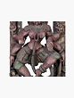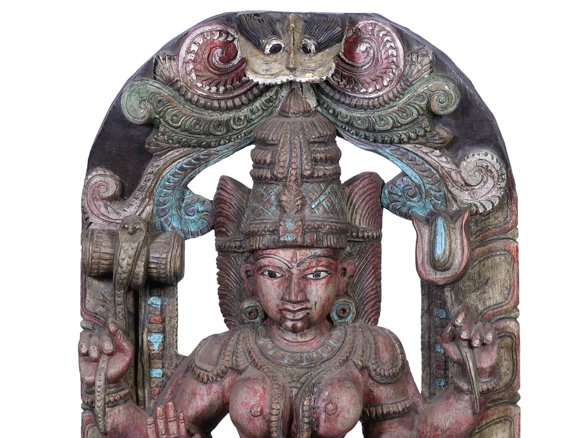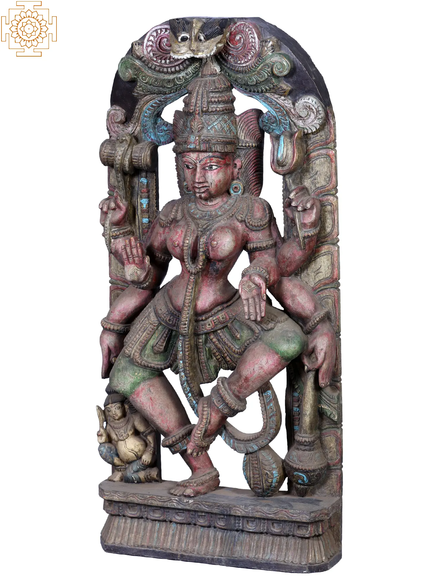 This magnificent wooden sculpture captures the awe-inspiring essence of the Goddess Kali, a powerful and complex deity in Hinduism, often depicted as a fierce manifestation of Devi, the supreme goddess. In this captivating portrayal, she is shown in the midst of her cosmic dance, a dynamic and energetic posture that signifies the cyclical nature of creation, preservation, and destruction. The intricate carvings and the rich patina of age speak to the deep spiritual significance and artistic mastery involved in its creation. The multi-armed form of the Goddess is a visual representation of her omnipresence and her ability to undertake numerous tasks simultaneously. Each hand is poised with intent, some holding symbolic implements, while others are in mudras (gestures) that convey blessings or protection. The serene yet powerful expression on her face, coupled with her fierce gaze, embodies the duality of her nature – the destroyer of evil and the protector of the righteous. Her adornments, intricately carved, suggest a regal bearing even in her most tempestuous form.