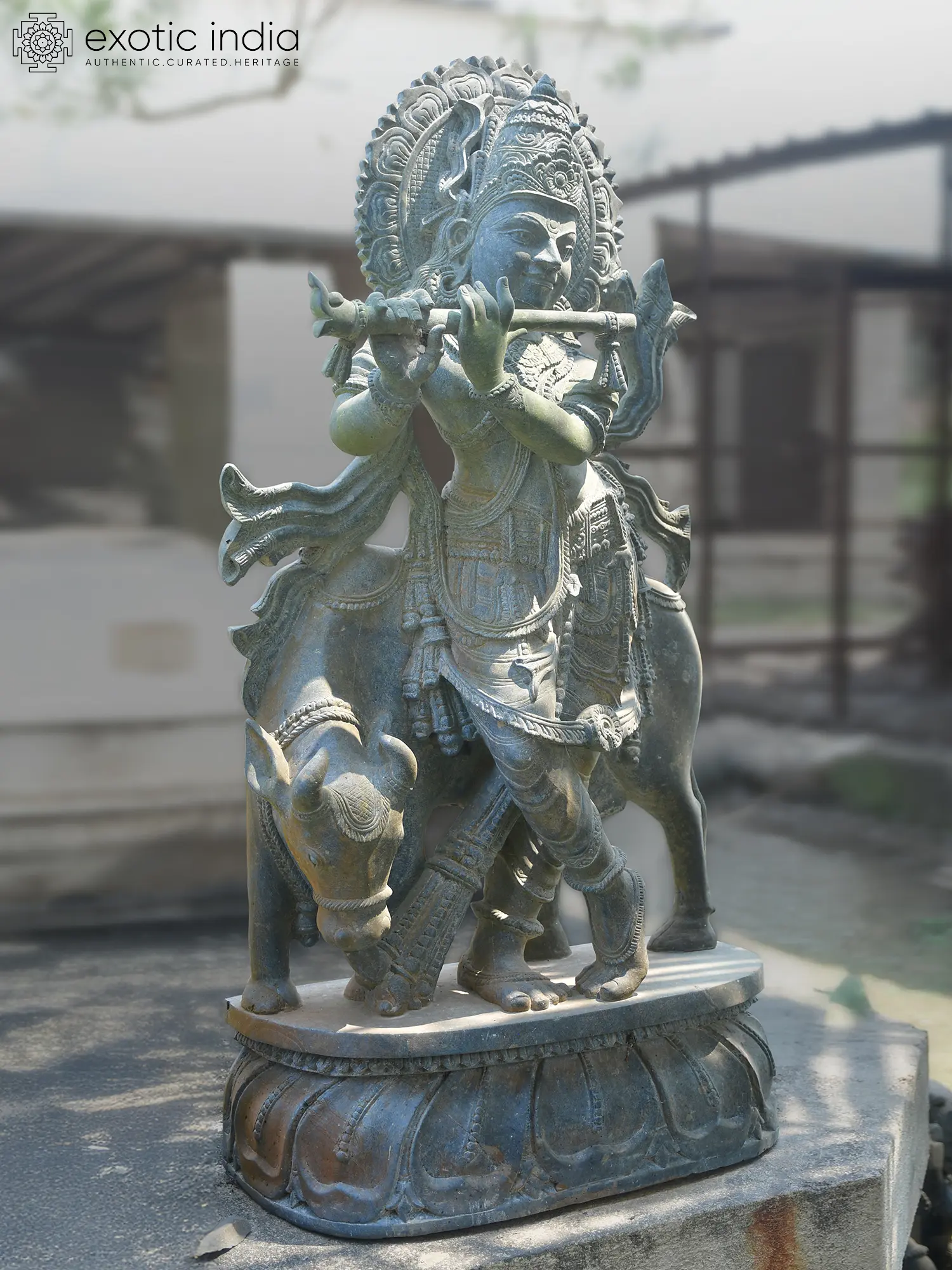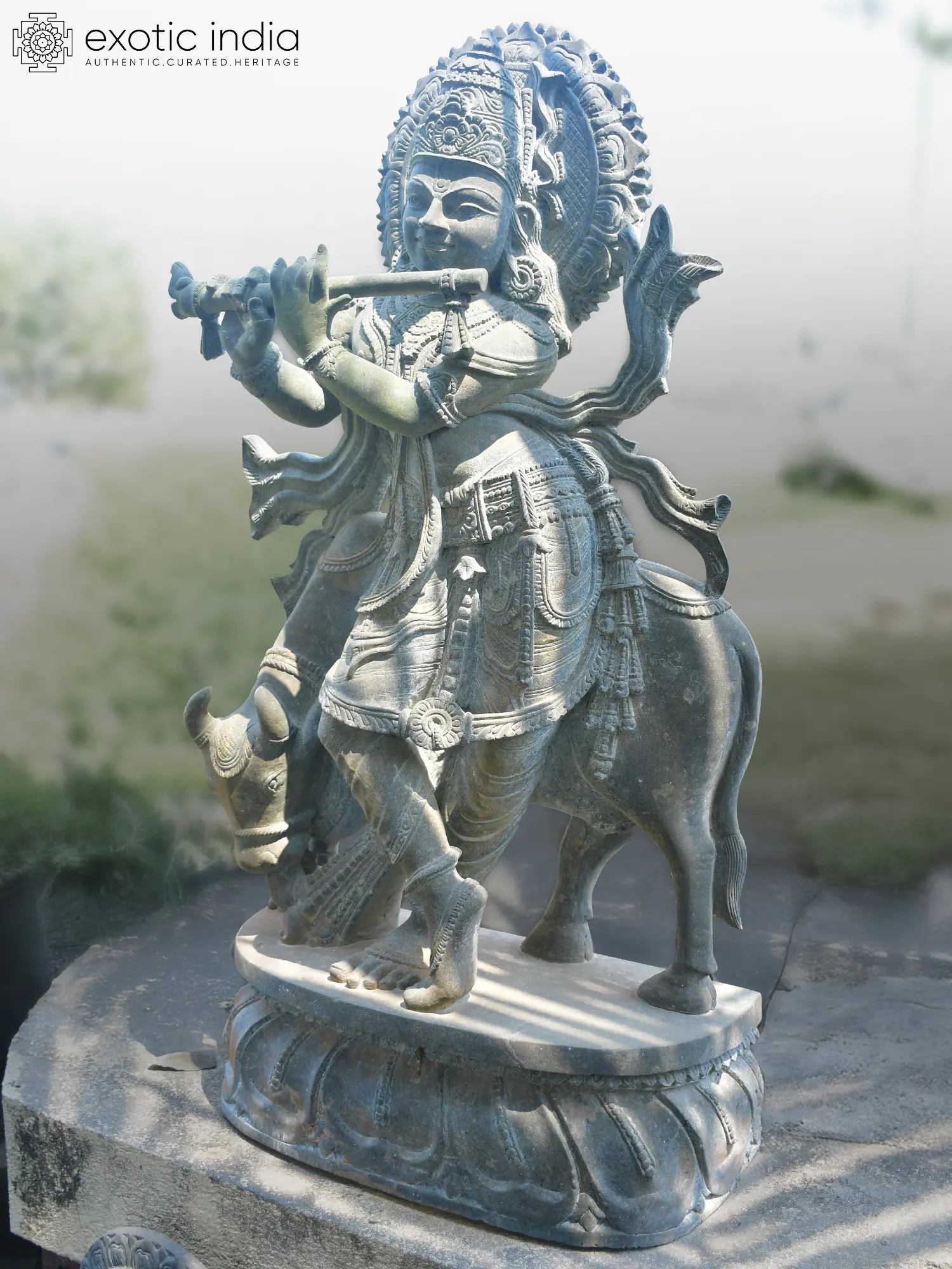 Standing an impressive 38 inches tall, this creation commands attention with its balanced composition and dynamic pose. You’ll appreciate the delicate rendering of the flute, held with such gentle intention, and the intricate adornments that grace the divine figure. The accompanying bovine companion is rendered with remarkable naturalism, its serene posture harmonizing perfectly with the central figure, creating a captivating narrative that draws the eye. Its substantial presence, approximately 18 inches wide and 9 inches deep, ensures it will be a focal point in any setting.