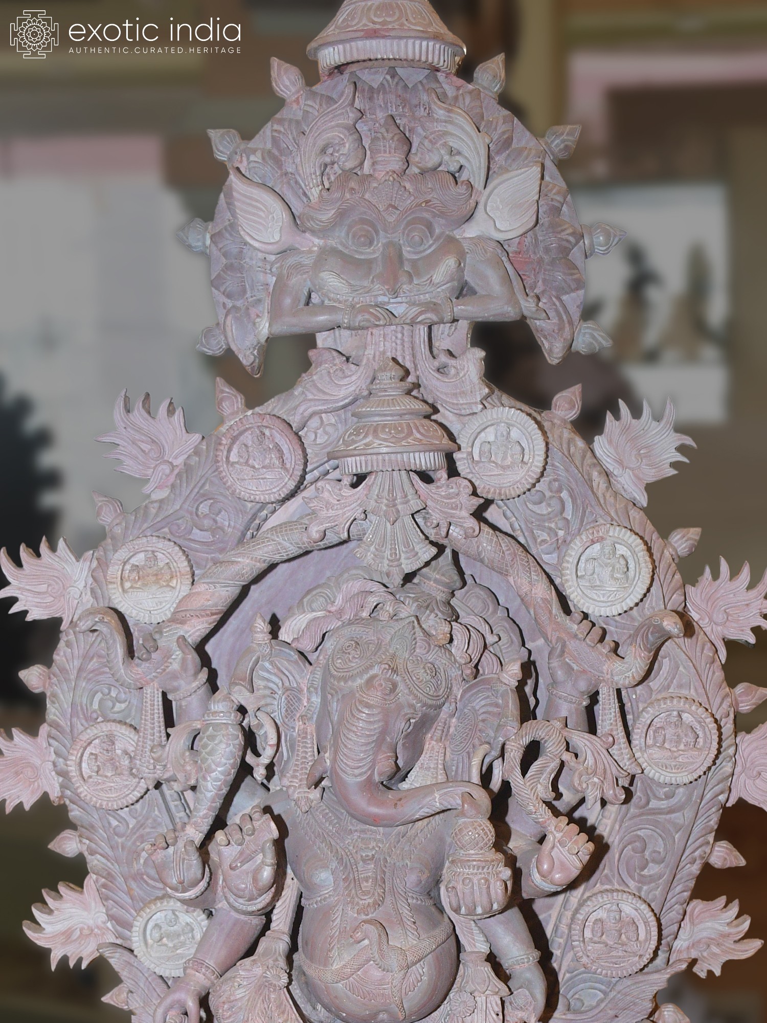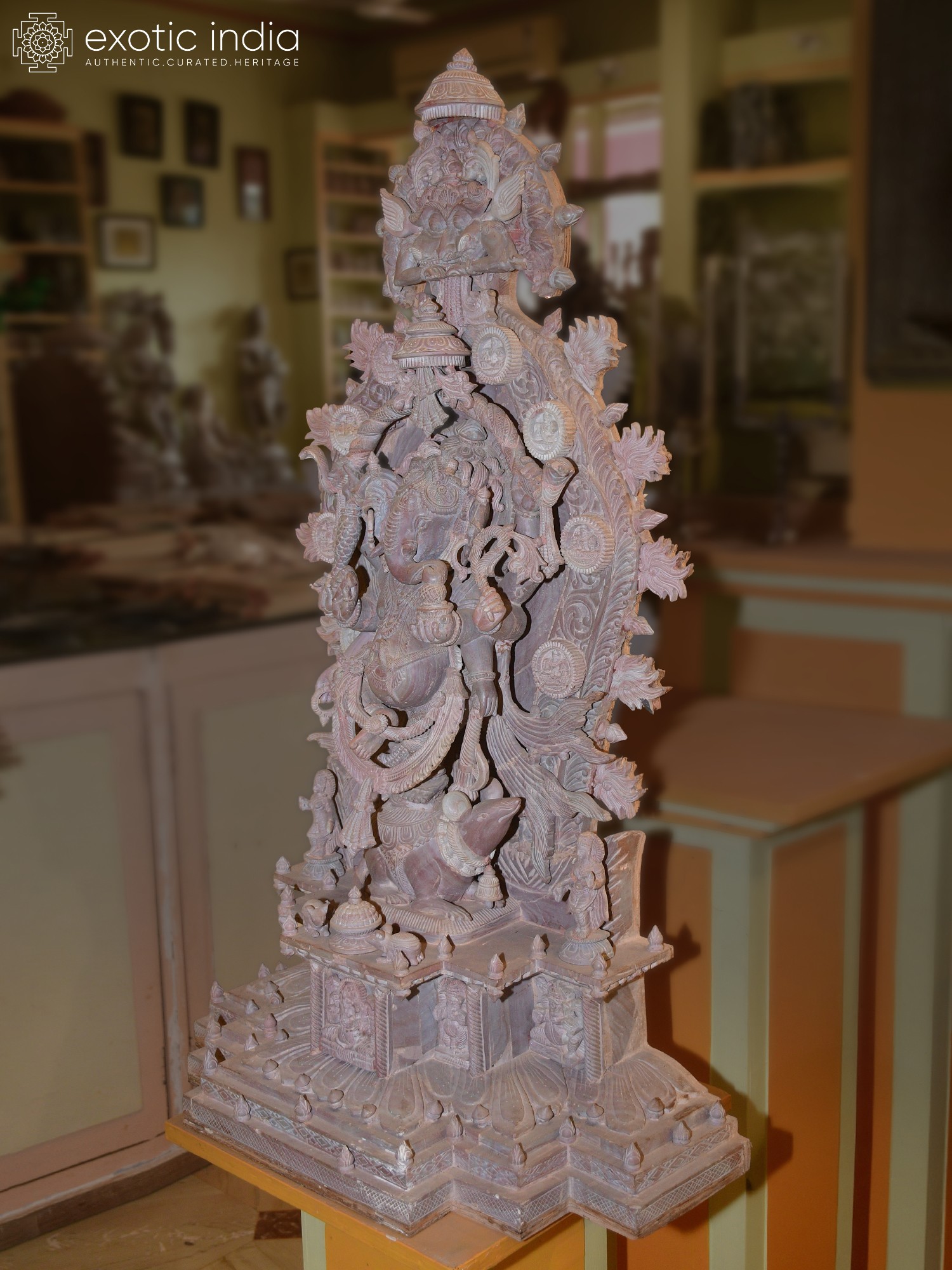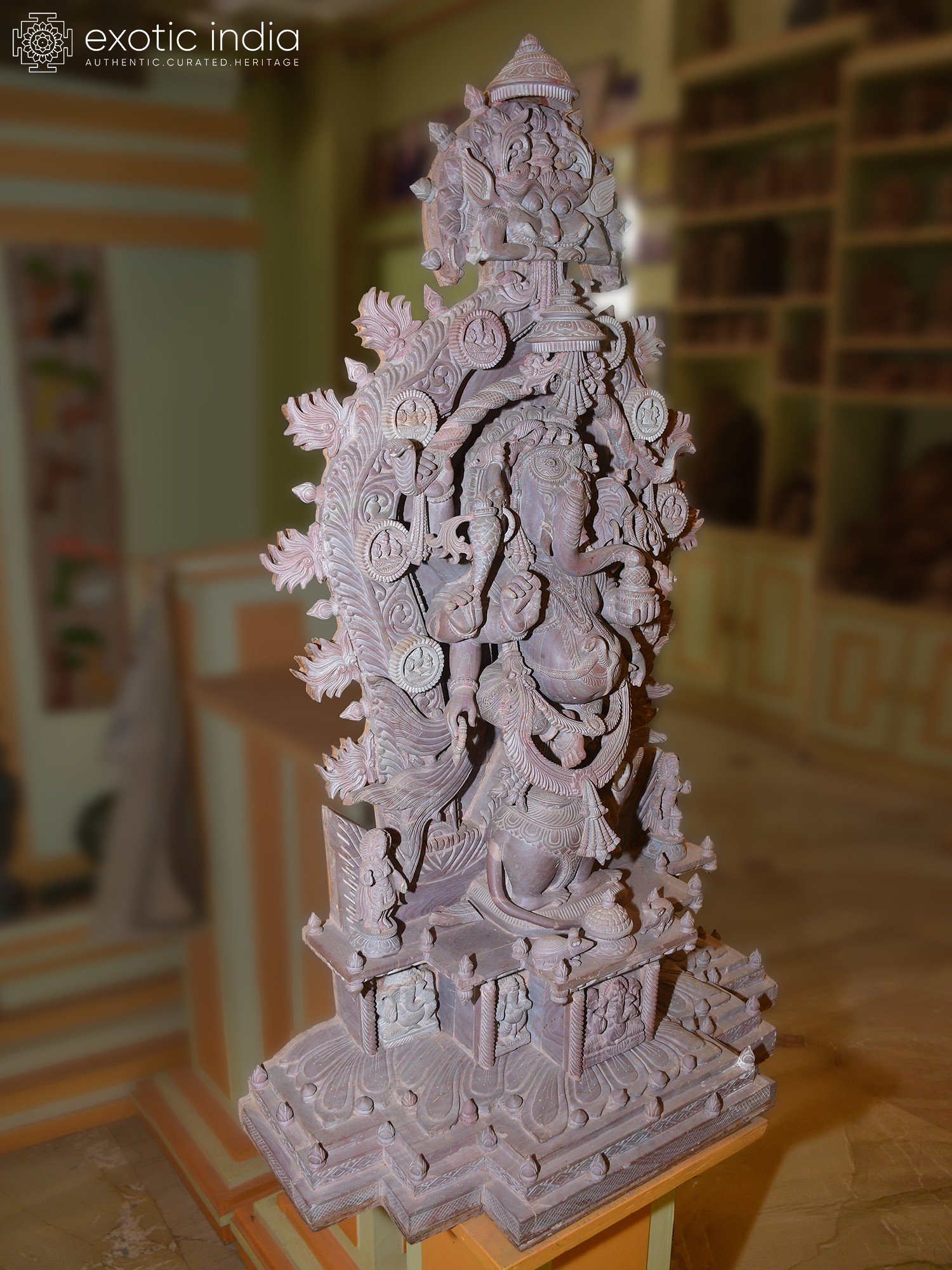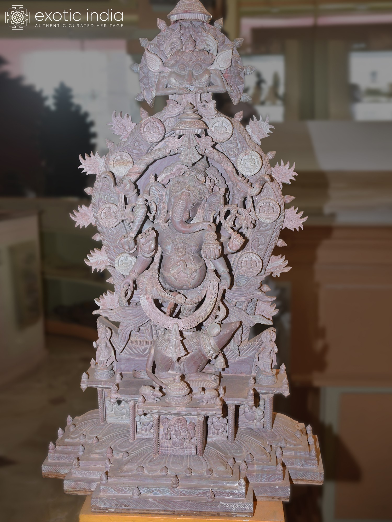 This masterpiece is more than just a statue; it is a narrative carved in stone. The composition features Ganesha seated upon his loyal vahana, the diminutive but powerful mouse, Mooshika. Mooshika, often seen as a symbol of overcoming ego and desire, is depicted with remarkable life-like detail, nestled contentedly beneath the divine dancer. The entire tableau is framed by an elaborate archway, adorned with a profusion of floral motifs, celestial beings, and miniature depictions of Ganesha himself, creating a breathtaking spectacle of divine artistry. Each element, from the smallest petal to the most intricate carving, has been meticulously shaped by skilled artisans, imbuing the stone with life and spirit.