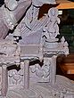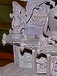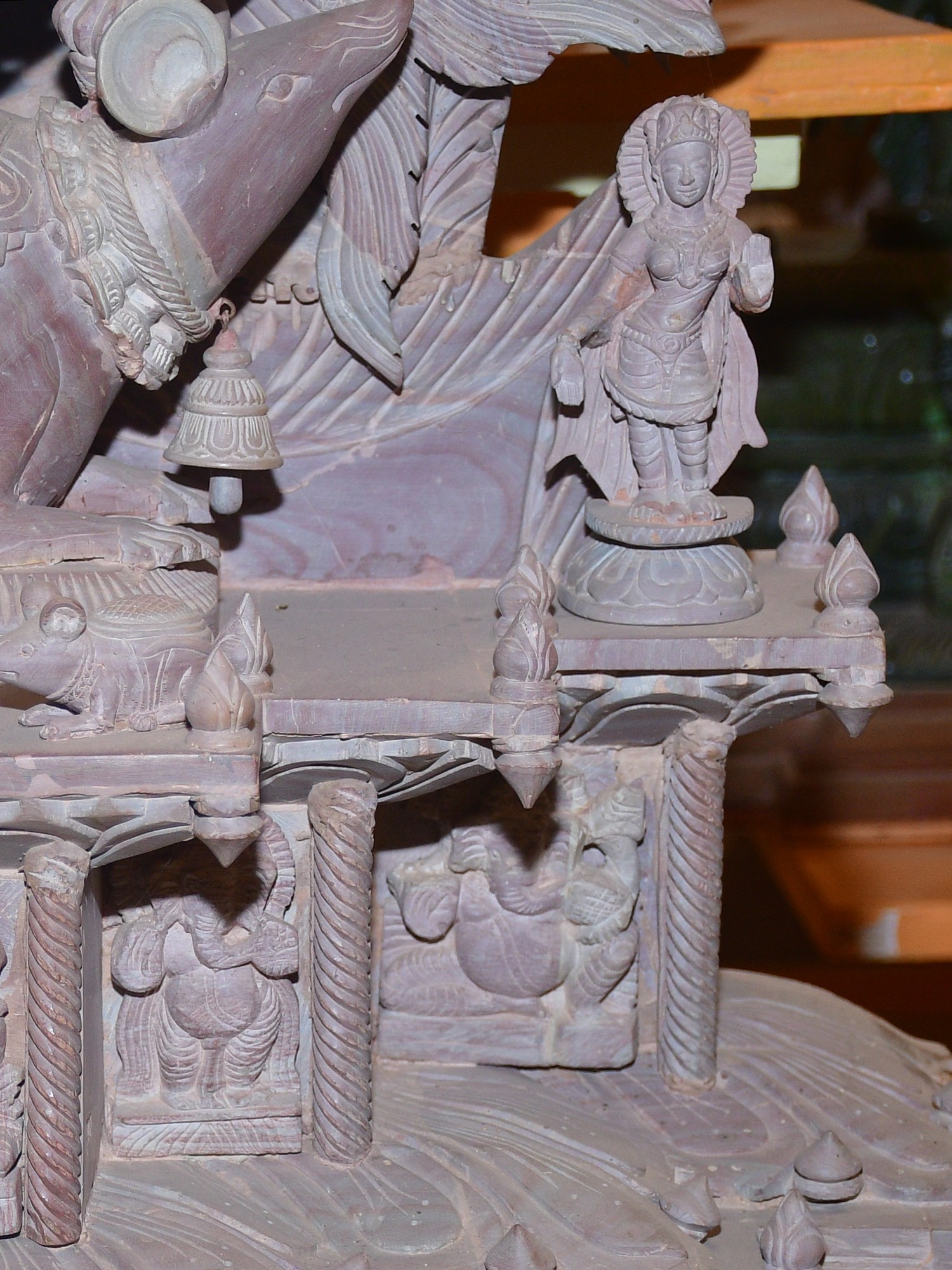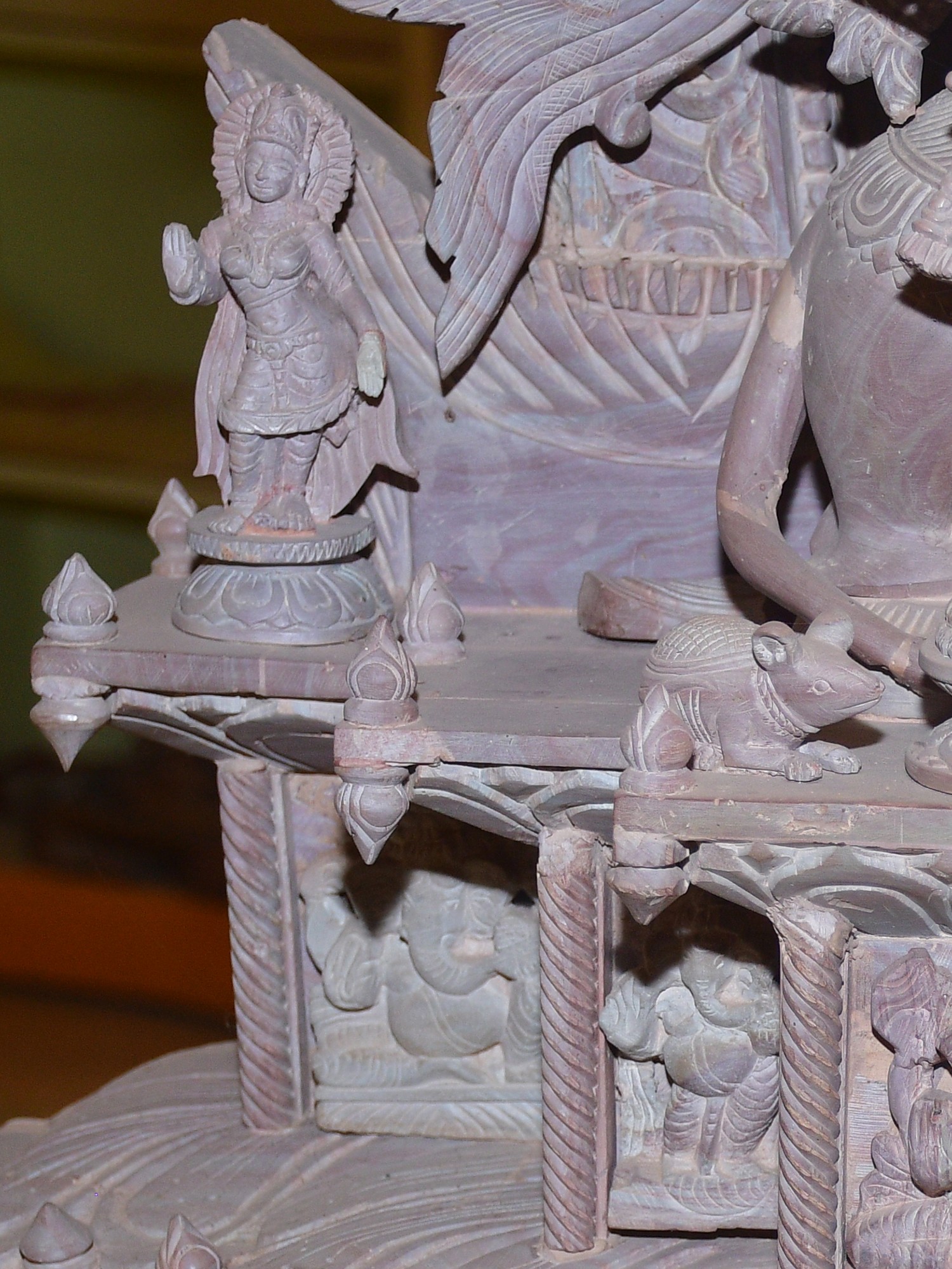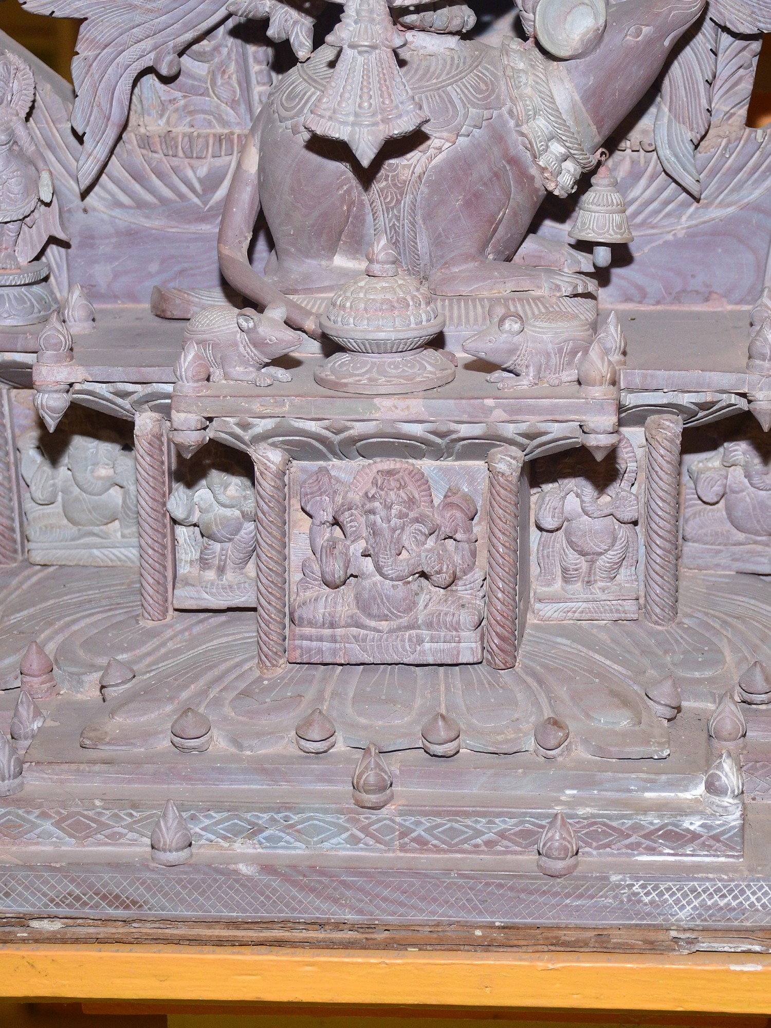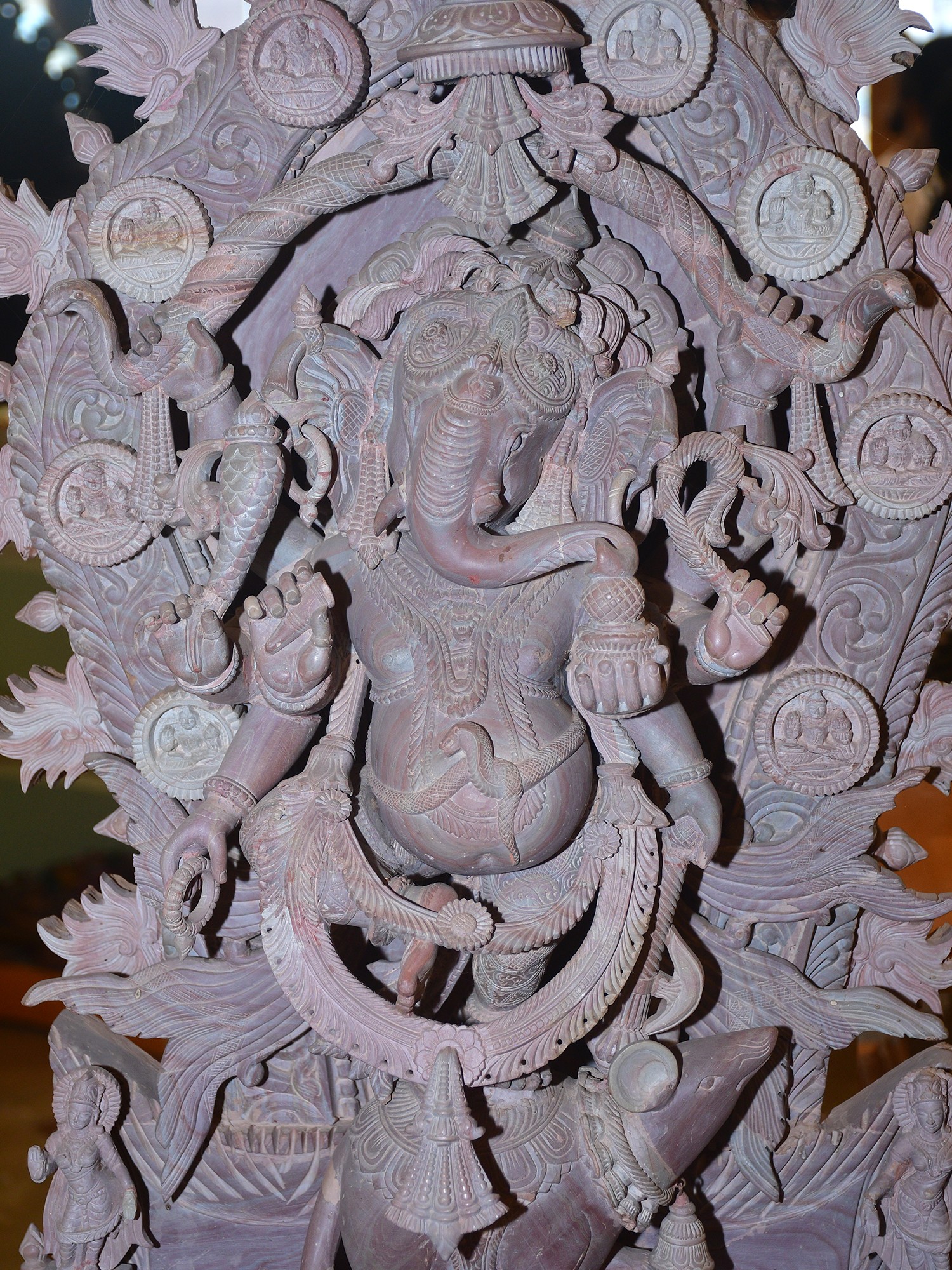 This masterpiece is more than just a statue; it is a narrative carved in stone. The composition features Ganesha seated upon his loyal vahana, the diminutive but powerful mouse, Mooshika. Mooshika, often seen as a symbol of overcoming ego and desire, is depicted with remarkable life-like detail, nestled contentedly beneath the divine dancer. The entire tableau is framed by an elaborate archway, adorned with a profusion of floral motifs, celestial beings, and miniature depictions of Ganesha himself, creating a breathtaking spectacle of divine artistry. Each element, from the smallest petal to the most intricate carving, has been meticulously shaped by skilled artisans, imbuing the stone with life and spirit.